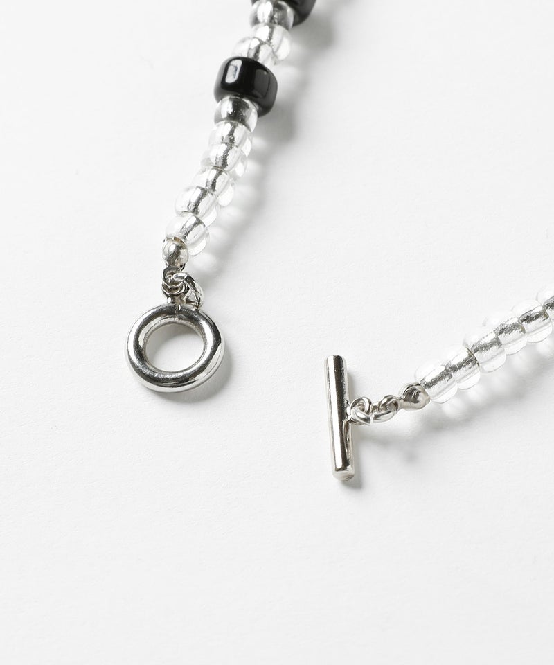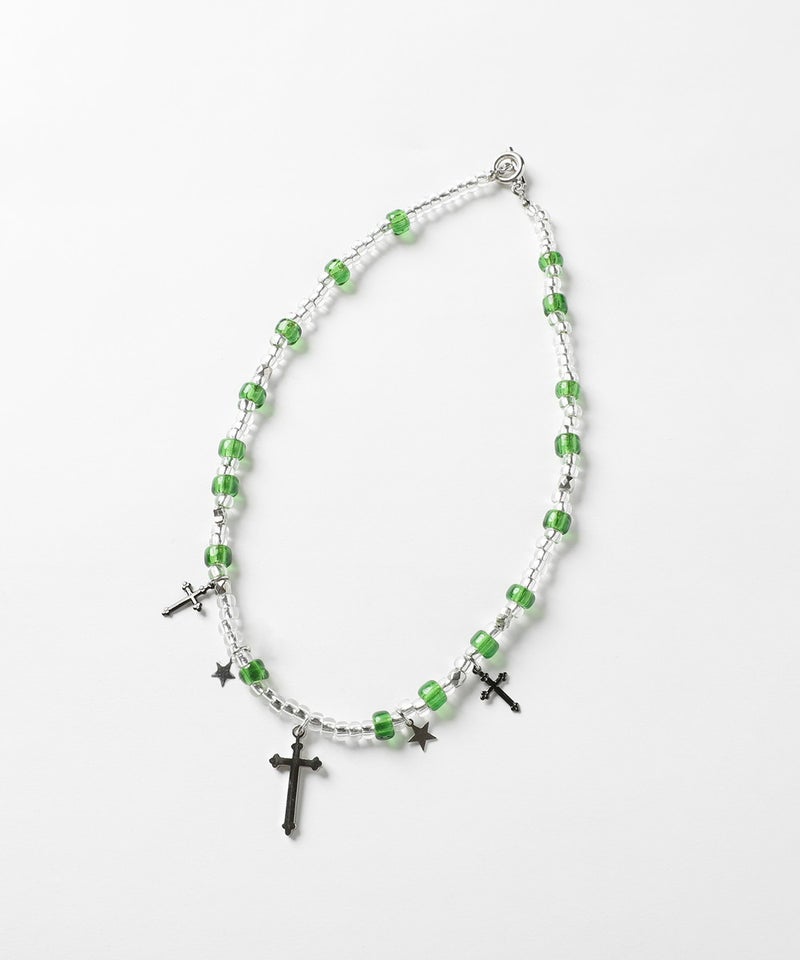 ランダムに配置したメキシカンビーズとチャームを組み合わせたネックレス。