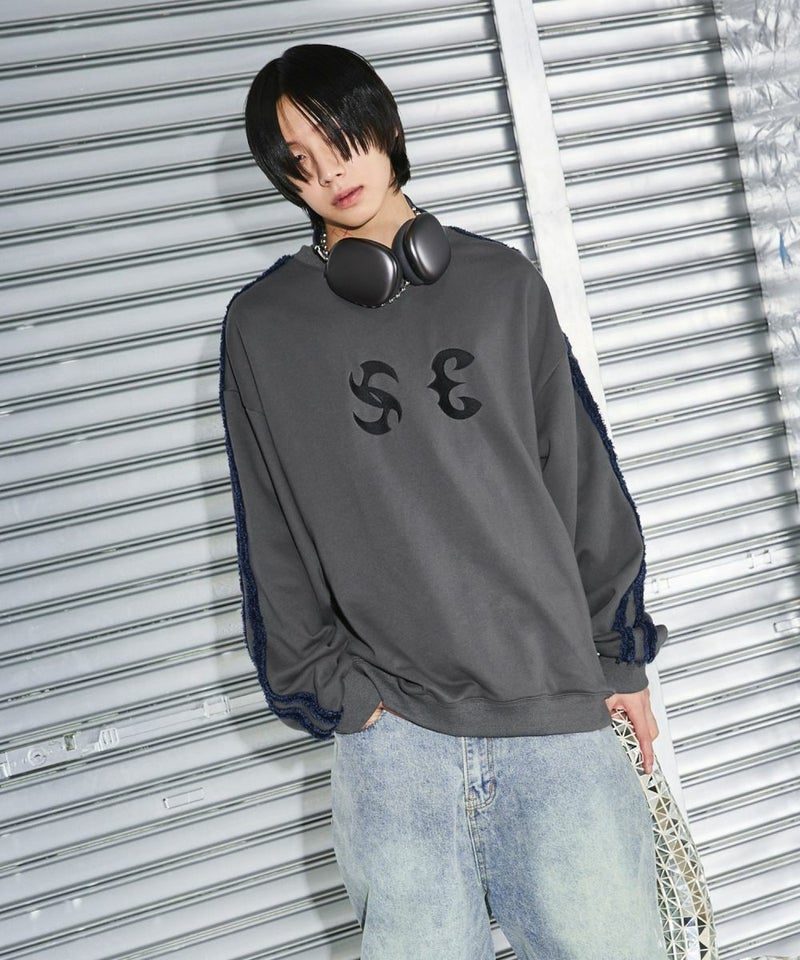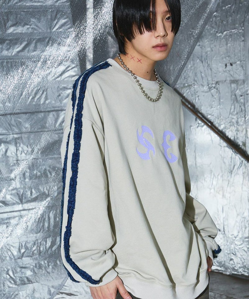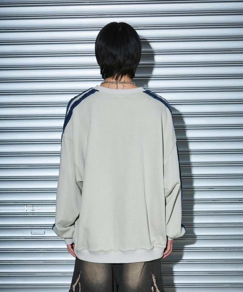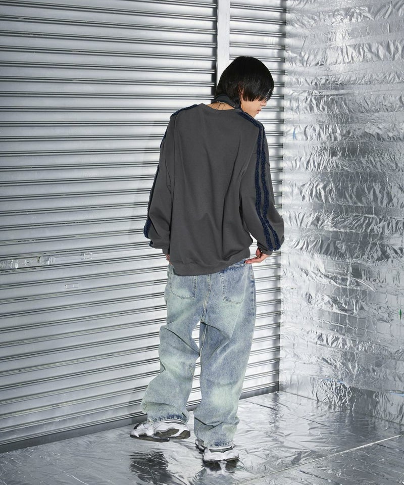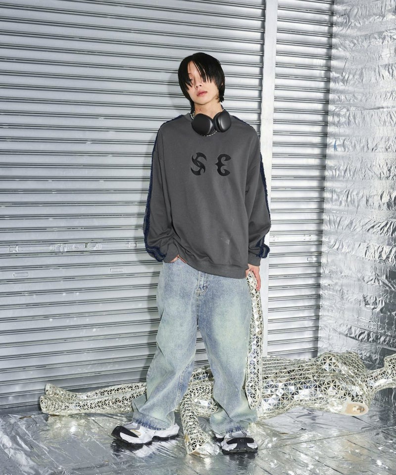 サイドのデニムフリンジラインが特徴のクルーネックスウェット。フロントにはメタルのロゴ刺繍が施しており、アクセントに。ややワイドな身幅&ドロップショルダーでリラックス感溢れるビッグシルエットで仕上げました。袖は大きくゆとりを持たせ、裾は程良くたまりができるバルーンシルエットのデザイン。着回しのしやすい、グレーとチャコールの2色展開。メンズ・レディース問わず着ていただけるユニセックス対応アイテムです。