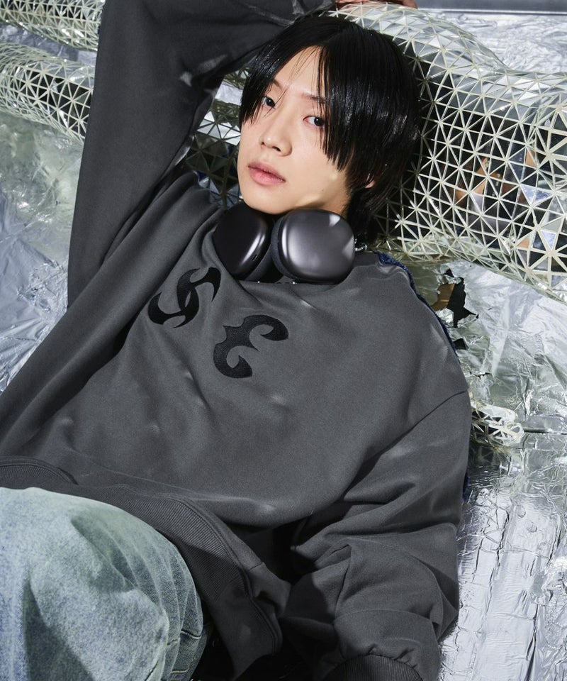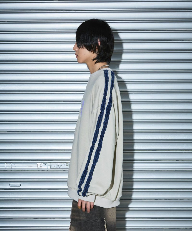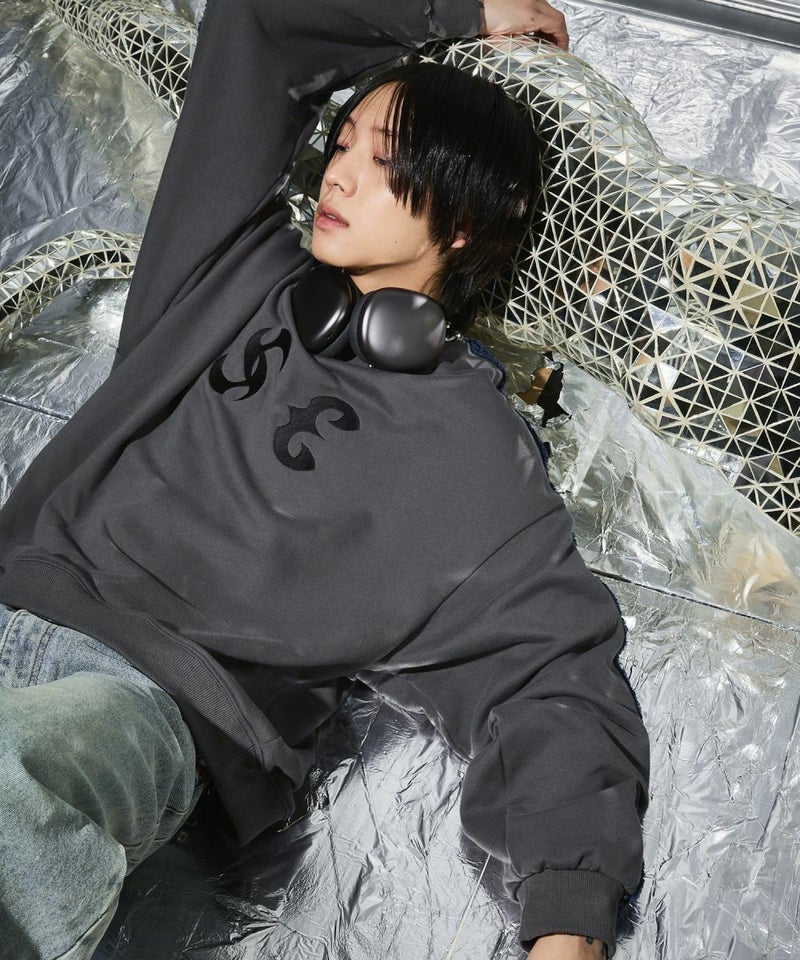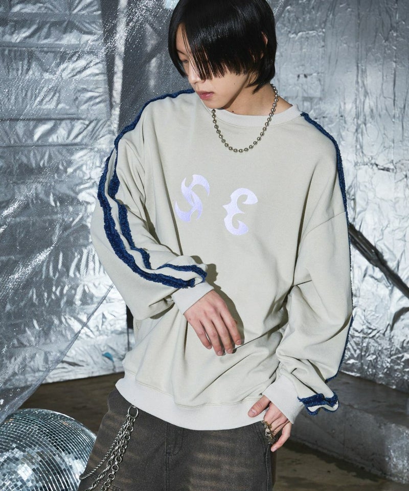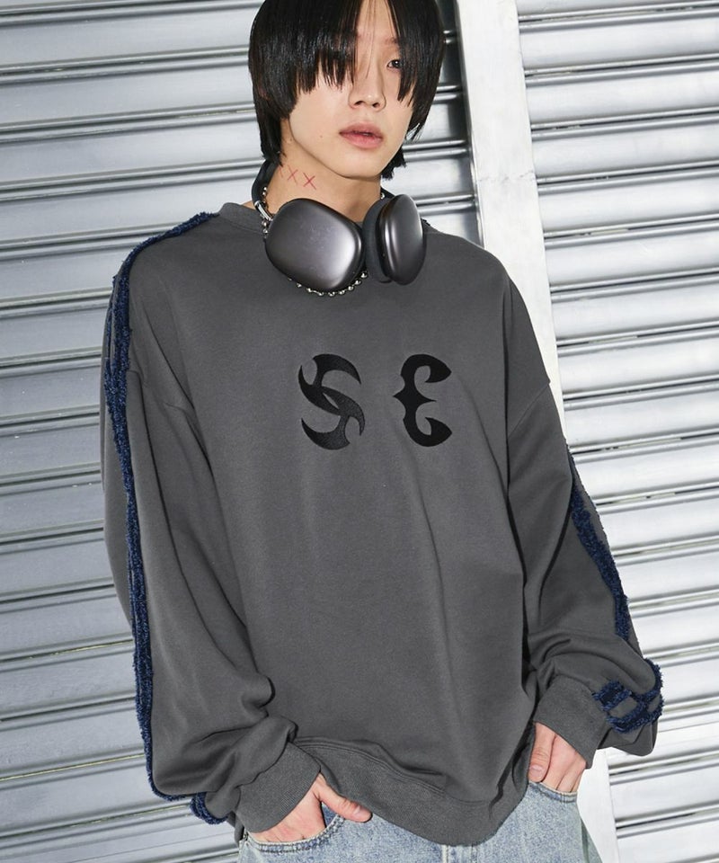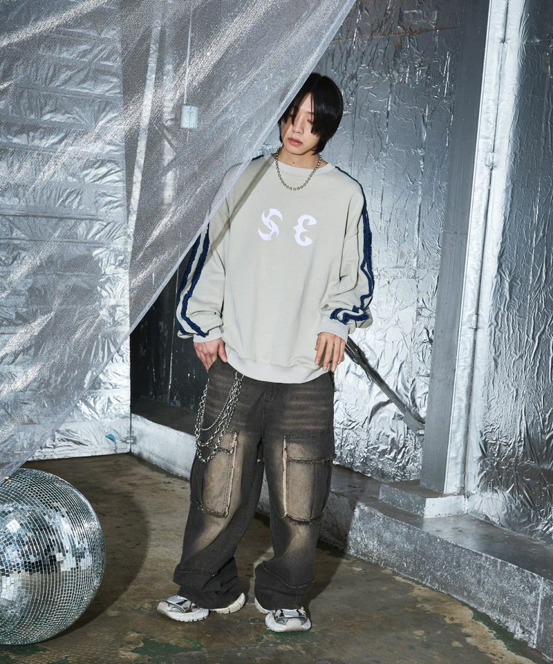 サイドのデニムフリンジラインが特徴のクルーネックスウェット。フロントにはメタルのロゴ刺繍が施しており、アクセントに。ややワイドな身幅&ドロップショルダーでリラックス感溢れるビッグシルエットで仕上げました。袖は大きくゆとりを持たせ、裾は程良くたまりができるバルーンシルエットのデザイン。着回しのしやすい、グレーとチャコールの2色展開。メンズ・レディース問わず着ていただけるユニセックス対応アイテムです。