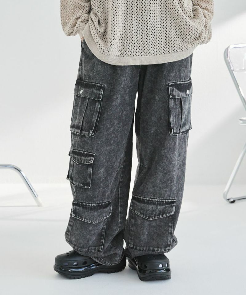 ポケットがアトランダムに付けられた、バギーシルエットのナイロン/デニムカーゴパンツ。