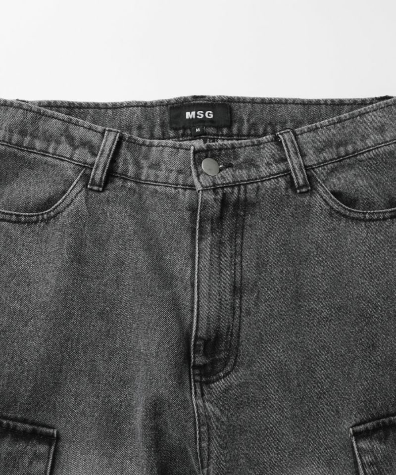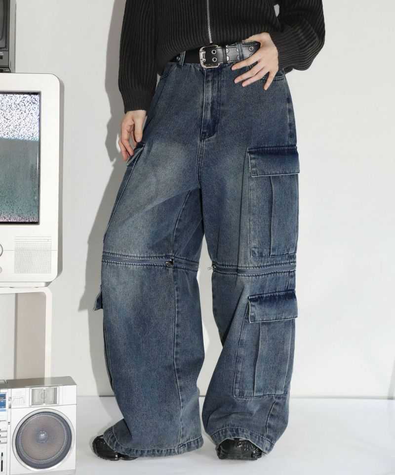 膝に配されたジッパーにより着脱可能な2WAY仕様のカーゴデニムパンツ。切り離しが可能なデタッチャブル仕様で、ジッパーを少し開けて立体感を出したり、ハーフパンツとしても着用することが可能。ヴィンテージ感ある、フロントやヒップに色落ち加工を施した雰囲気のある仕上がり。ゆったりとしたワイドストレートシルエットがこなれ感のある着こなしを演出します。サイドにカーゴポケットを配置し、収納力抜群。レディース、メンズ問わずお使い頂けるユニセックスアイテムです。