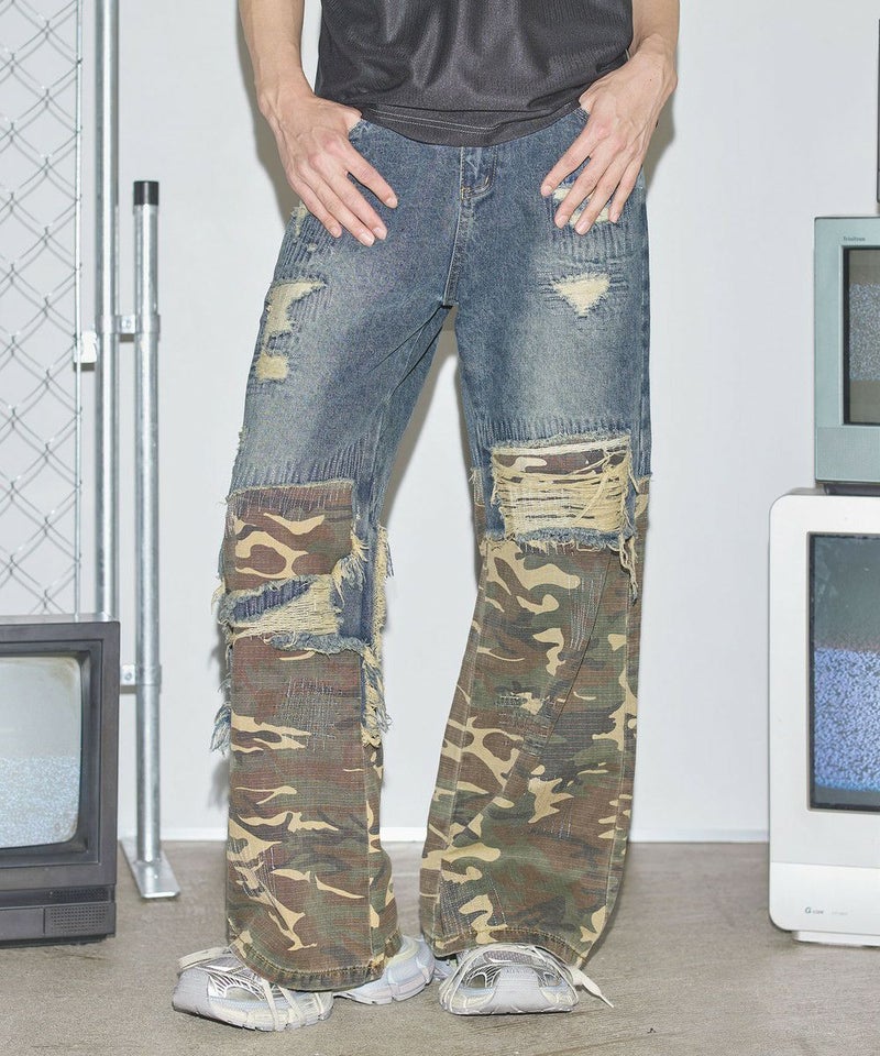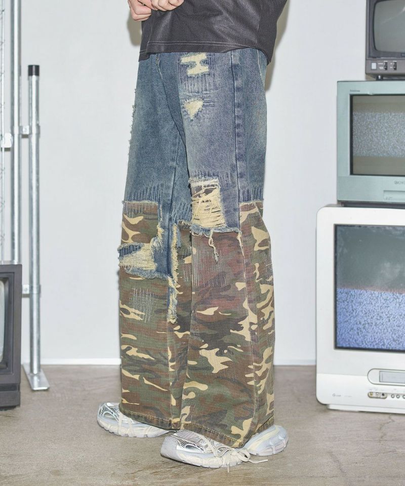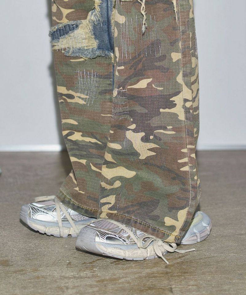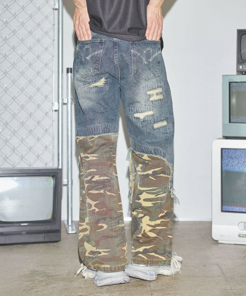・大胆なクラッシュ加工と迷彩パッチで魅せる、存在感抜群の一本。