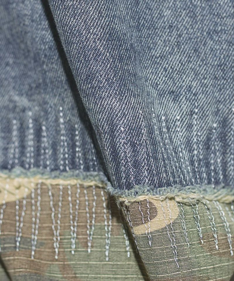 ・ヴィンテージ感あふれるデニム地に、ミリタリーテイストの迷彩柄ファブリックを大胆に重ねたリメイク風デザイン。