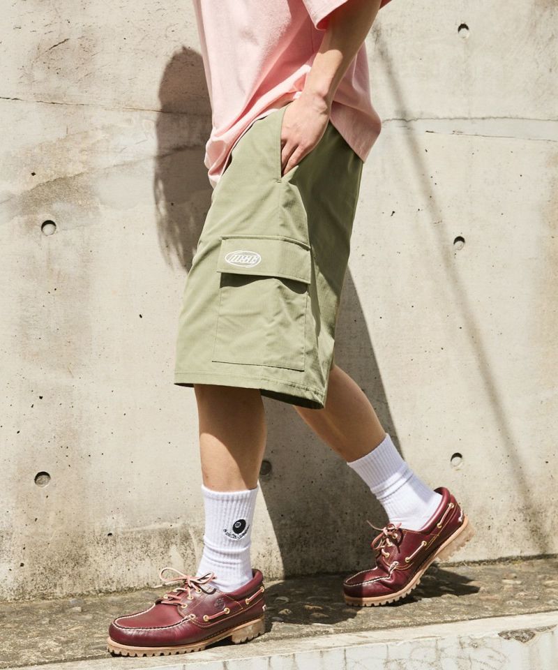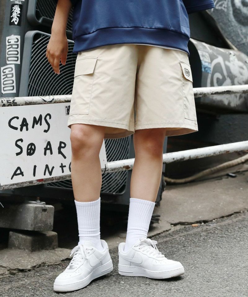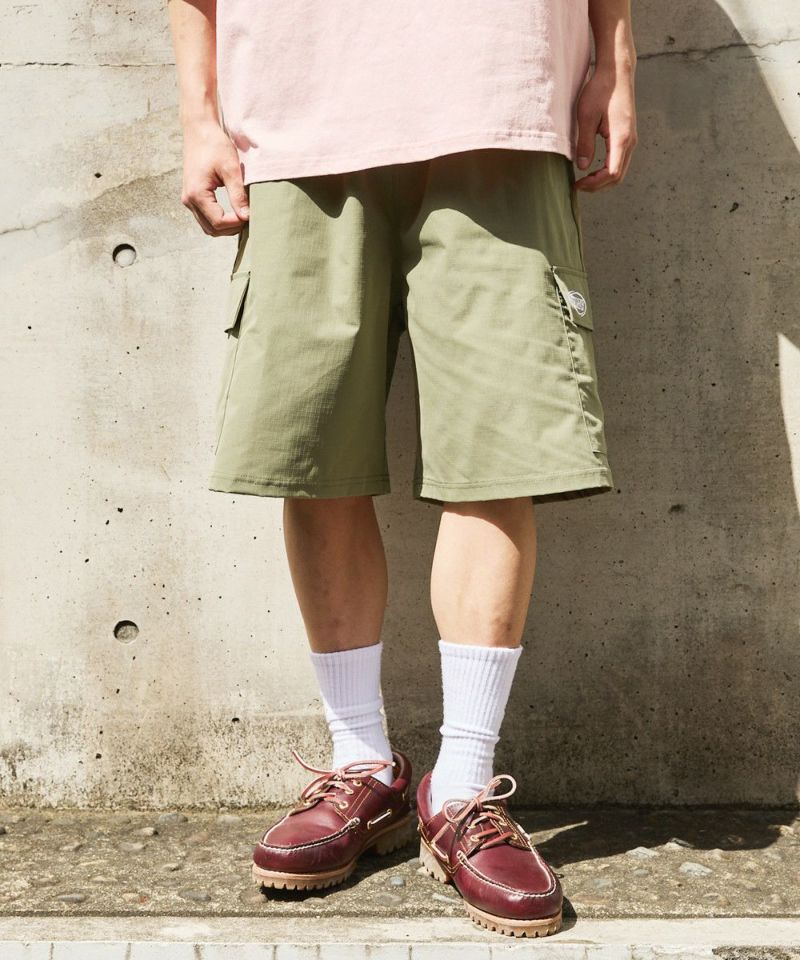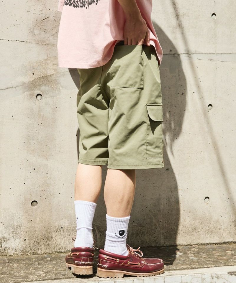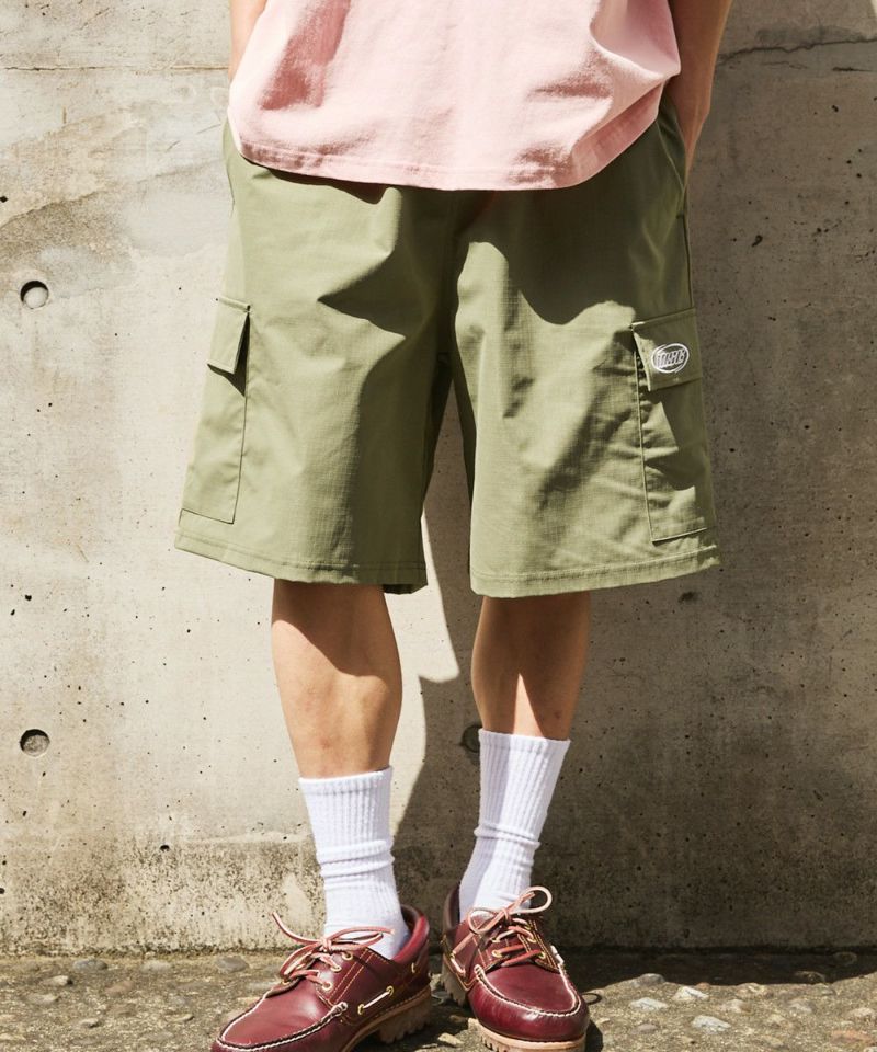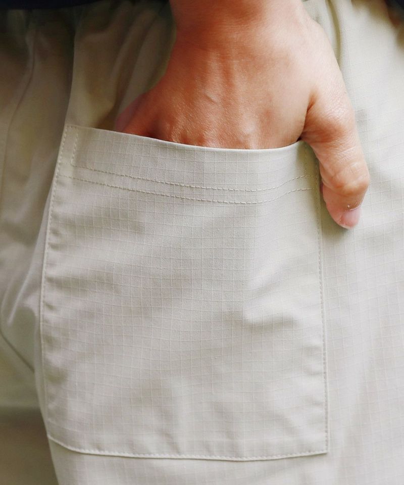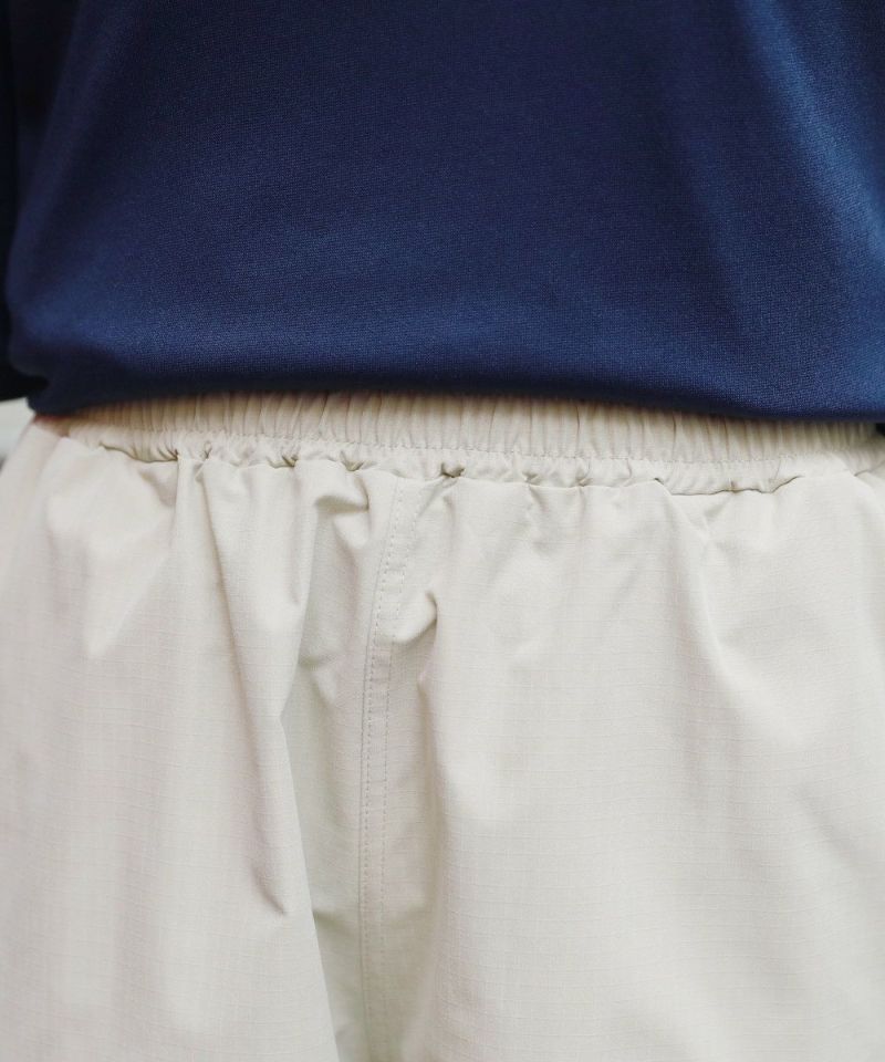 リップストップ生地のスイムカーゴショーツ。ゆったりとしたシルエットで快適な履き心地の一本です。ウェストはイージーパンツ仕様でドローコードがついておりサイズ調整可能。フラップポケットの仕様でその上にはオリジナルのブランドロゴが配しており、アクセントに。カラーはデイリー使いしやすい、ブラック・オリーブ・ライトベージュ・オフの4色展開。ユニセックスで着用できます。