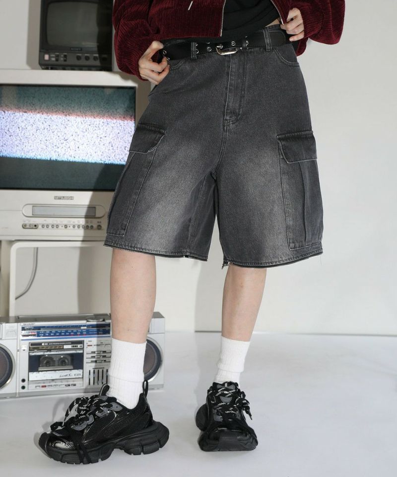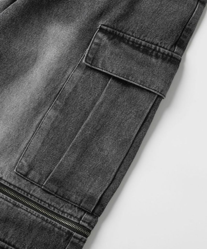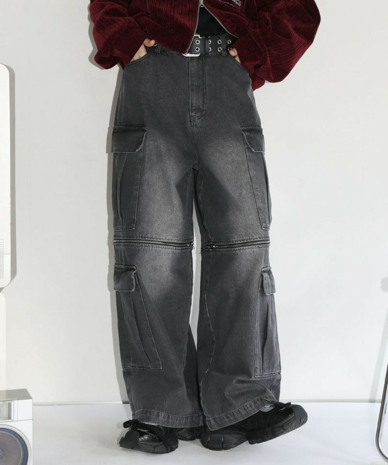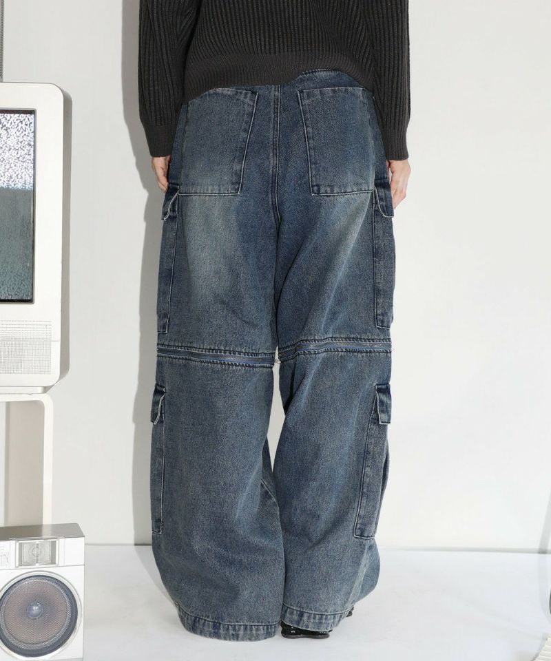 膝に配されたジッパーにより着脱可能な2WAY仕様のカーゴデニムパンツ。切り離しが可能なデタッチャブル仕様で、ジッパーを少し開けて立体感を出したり、ハーフパンツとしても着用することが可能。ヴィンテージ感ある、フロントやヒップに色落ち加工を施した雰囲気のある仕上がり。ゆったりとしたワイドストレートシルエットがこなれ感のある着こなしを演出します。サイドにカーゴポケットを配置し、収納力抜群。レディース、メンズ問わずお使い頂けるユニセックスアイテムです。