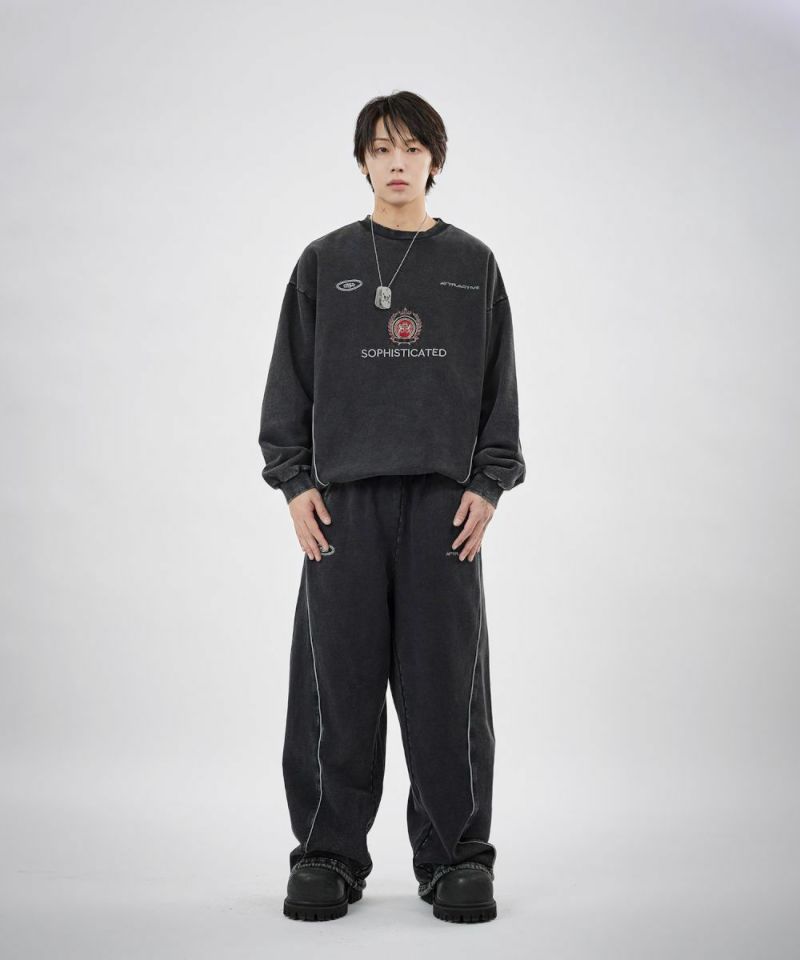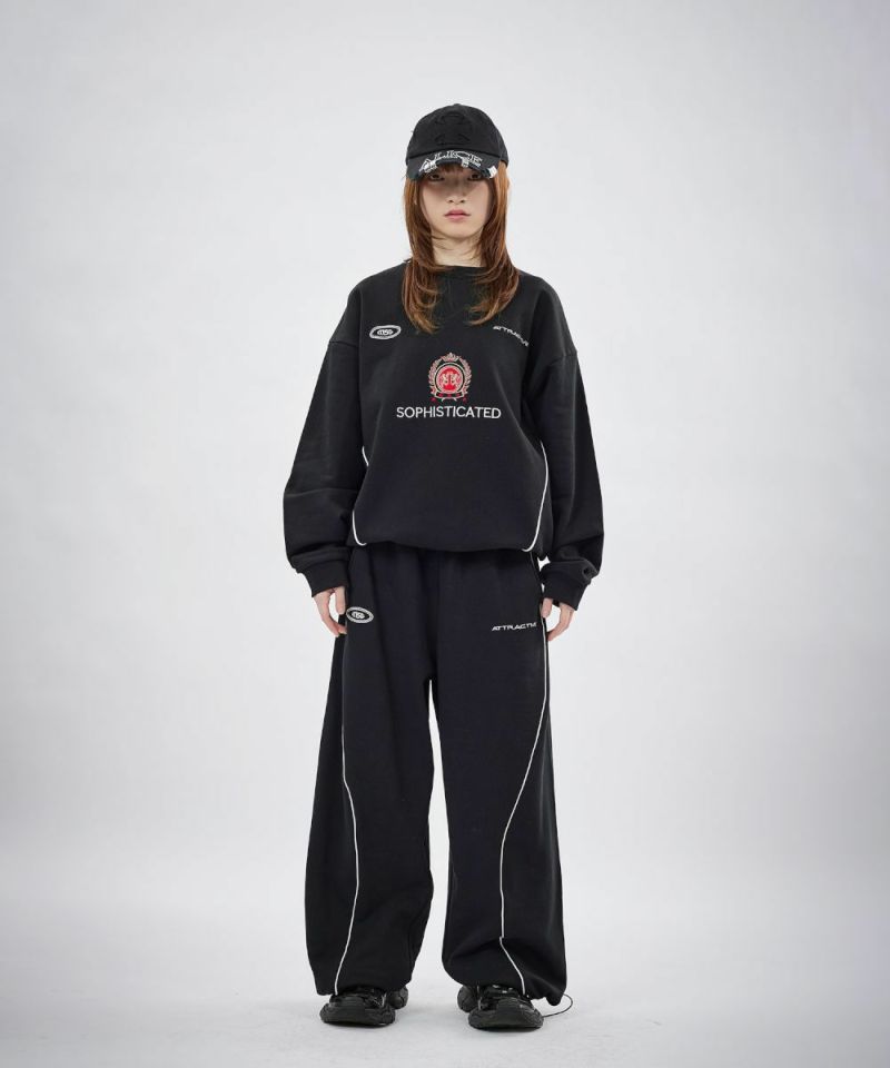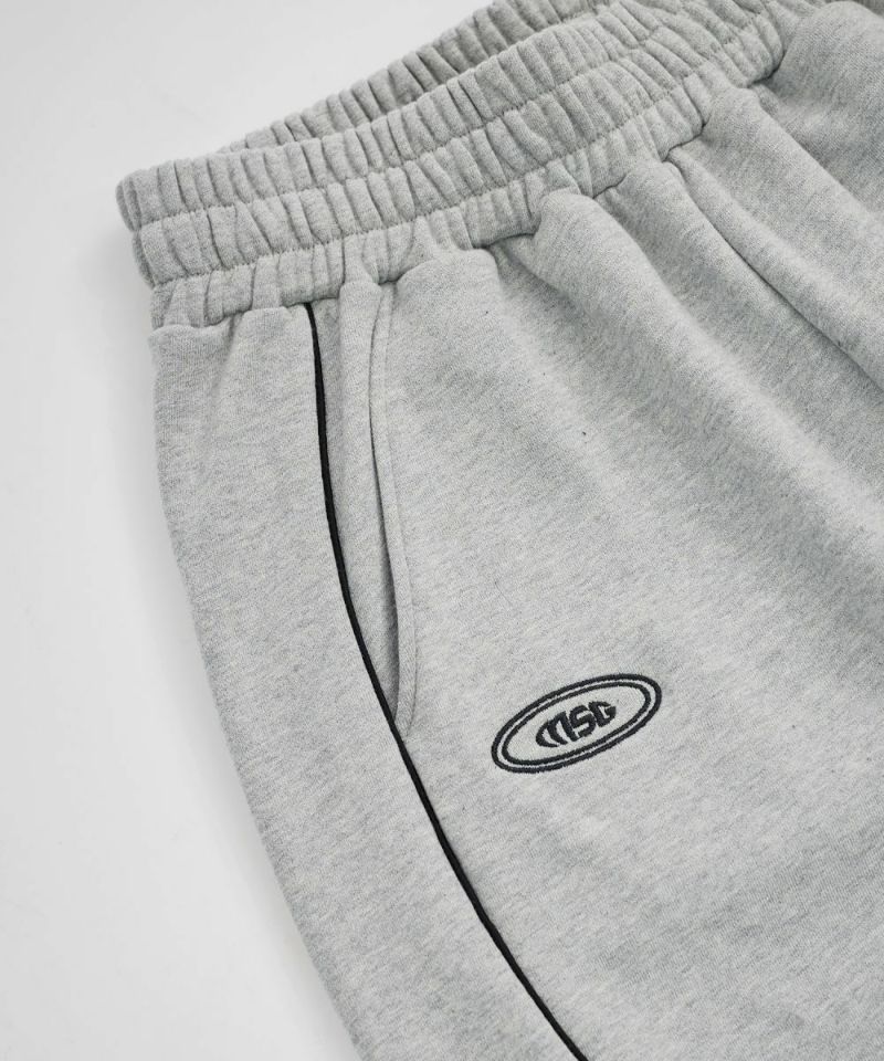フロントにはロゴプリントとエンブレム刺繍を施し、パイピングディテールをアクセントにプラス。シンプルながらも存在感があり、トップスを選ばずスタイリングの軸になるデザインです。リラックス感のあるオーバーサイズシルエットで、動きやすさと快適な穿き心地を両立。ウエストはゴムと紐のイージー仕様で、ストレスフリーに着用できます。裾にはドローコードを備え、絞り具合によって丈感やシルエットの調整が可能です。