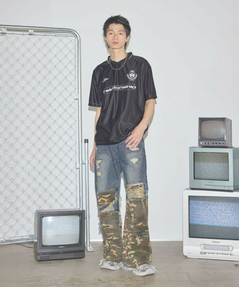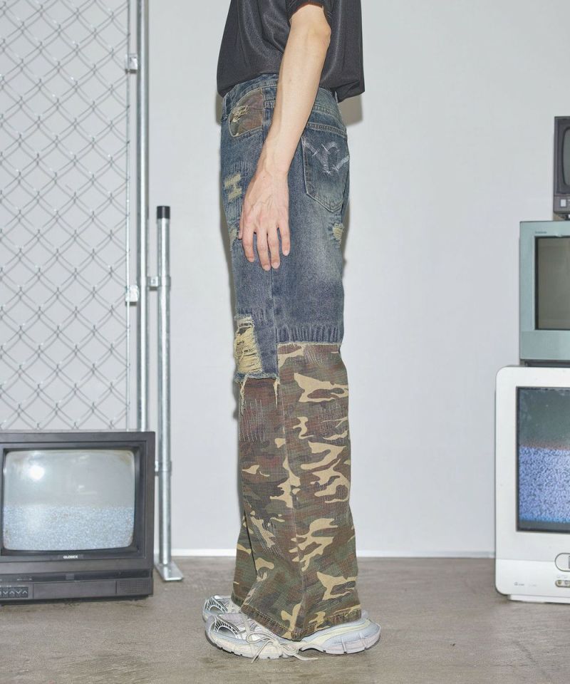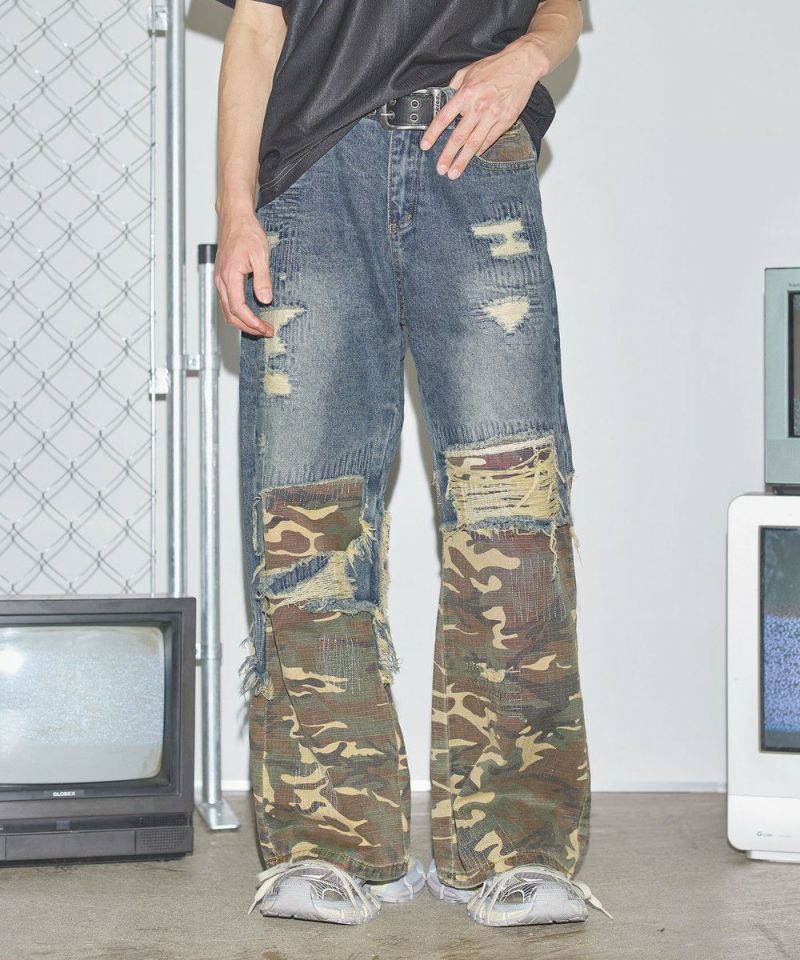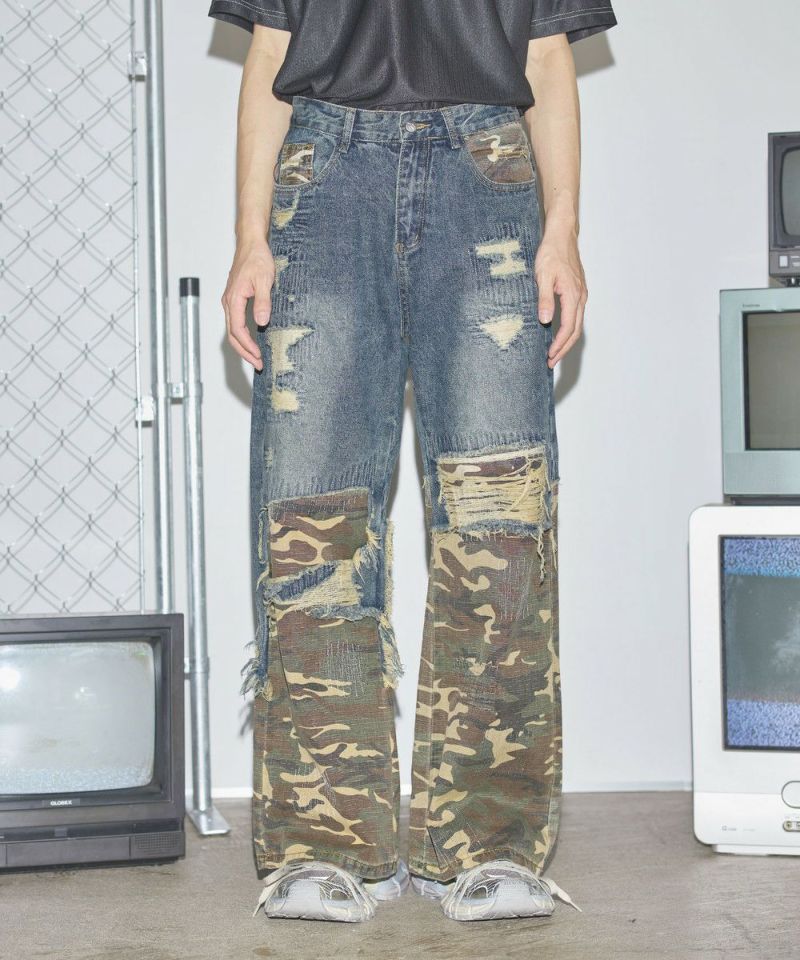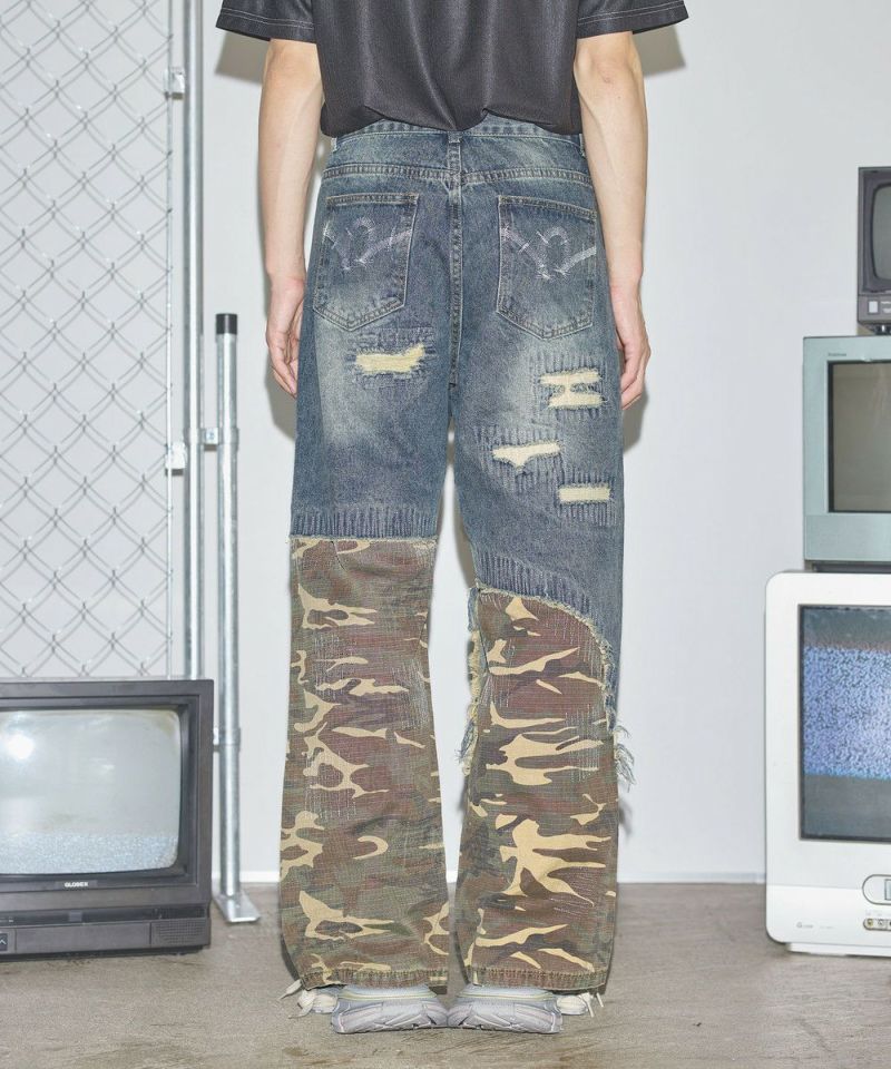 ・大胆なクラッシュ加工と迷彩パッチで魅せる、存在感抜群の一本。