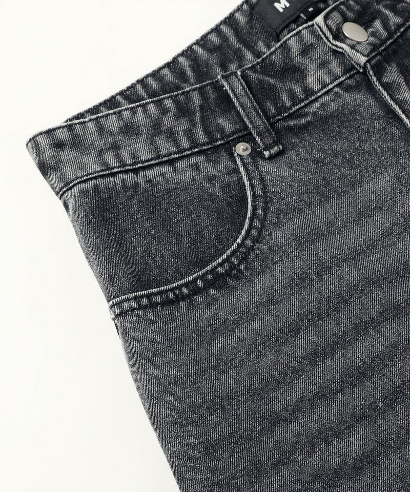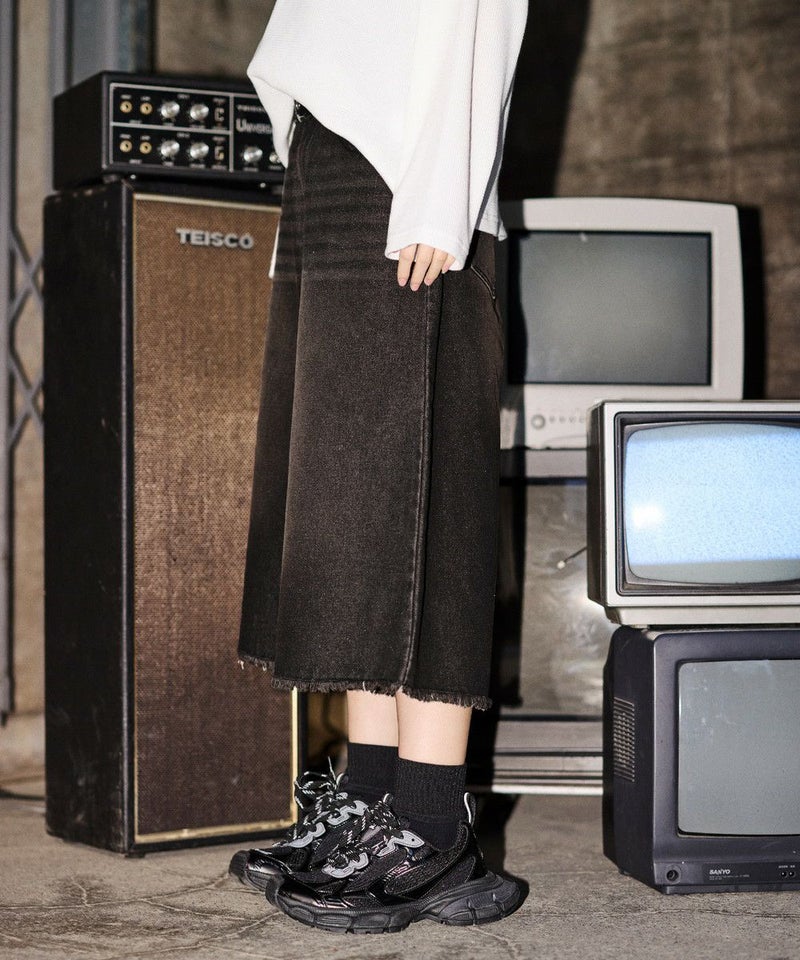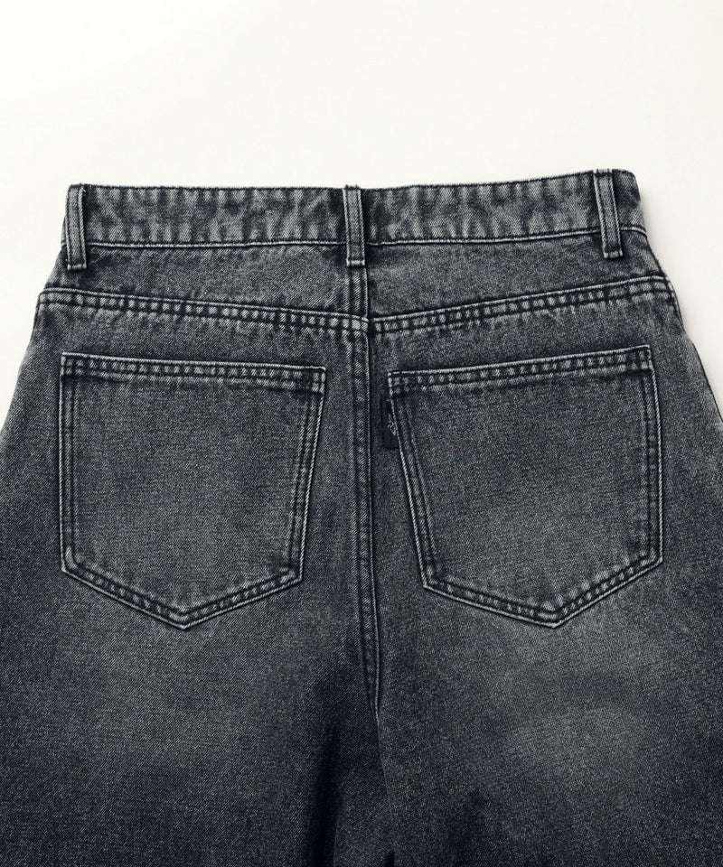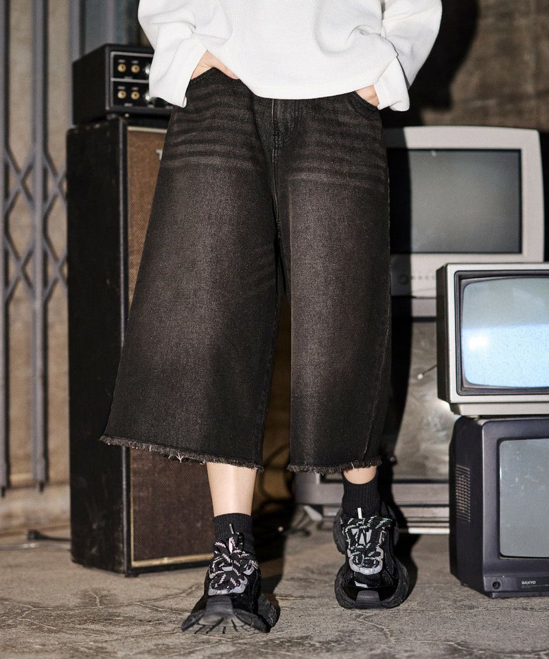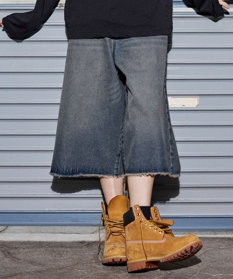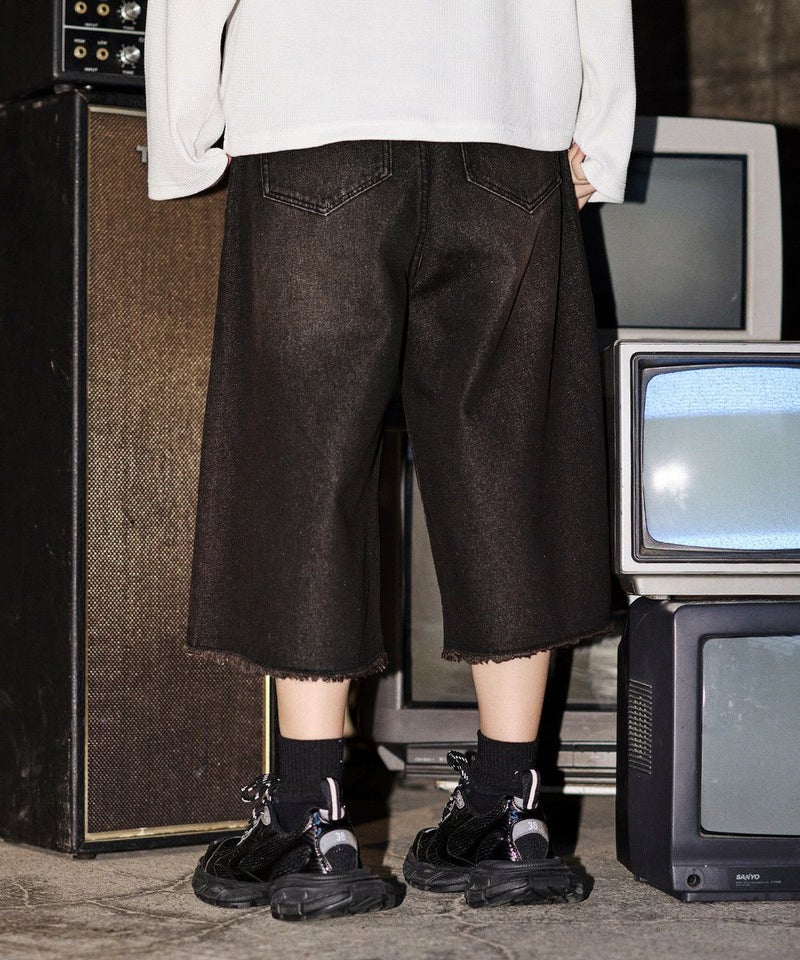 ・ヴィンテージ加工を施したワイドデニムショートパンツ。