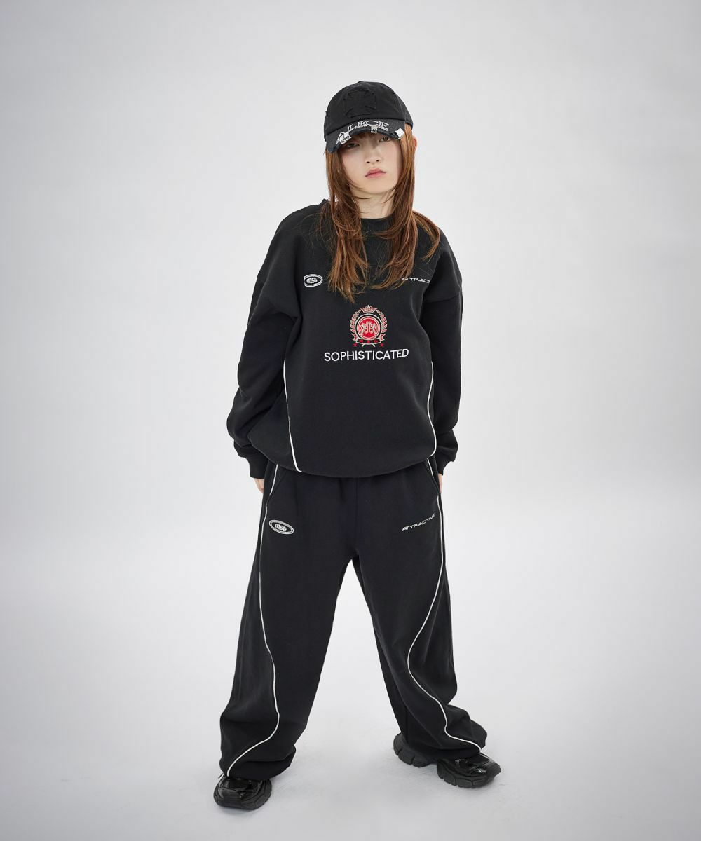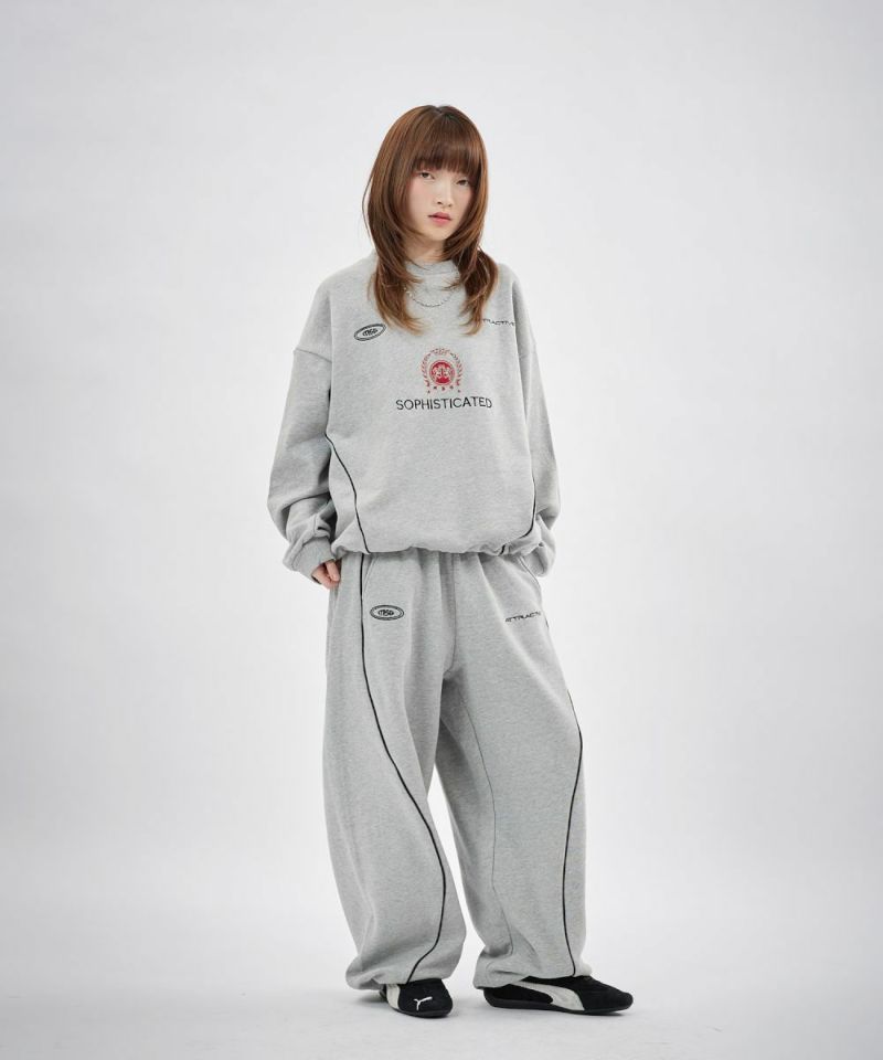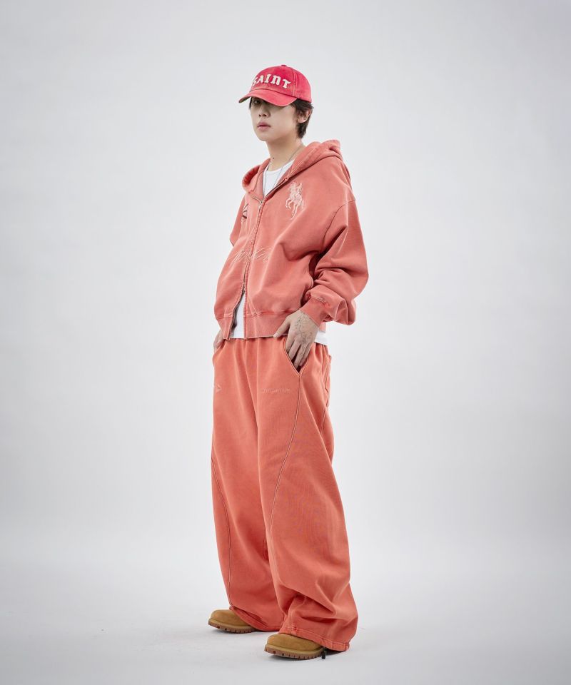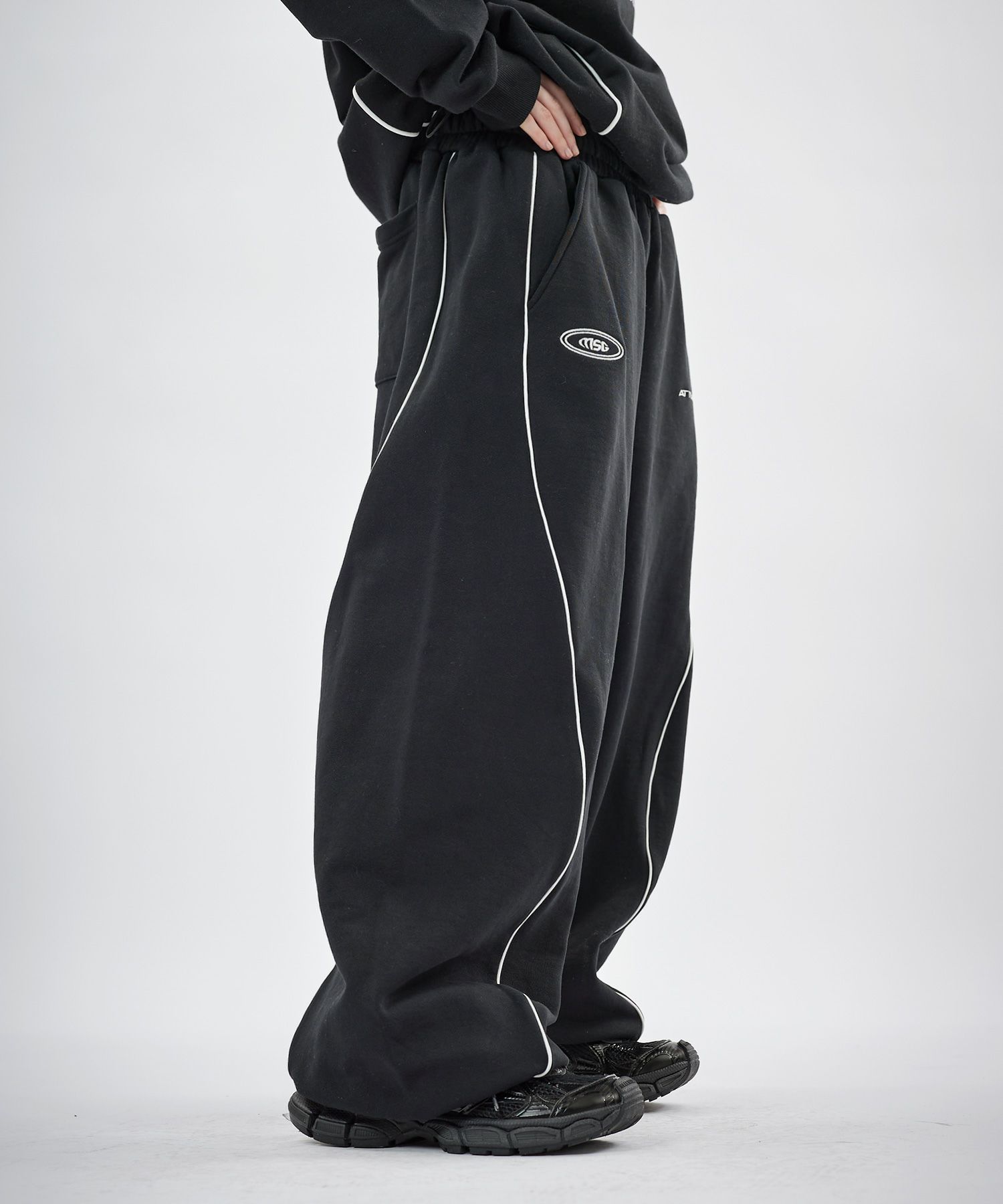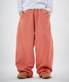 フロントにはロゴプリントとエンブレム刺繍を施し、パイピングディテールをアクセントにプラス。シンプルながらも存在感があり、トップスを選ばずスタイリングの軸になるデザインです。リラックス感のあるオーバーサイズシルエットで、動きやすさと快適な穿き心地を両立。ウエストはゴムと紐のイージー仕様で、ストレスフリーに着用できます。裾にはドローコードを備え、絞り具合によって丈感やシルエットの調整が可能です。