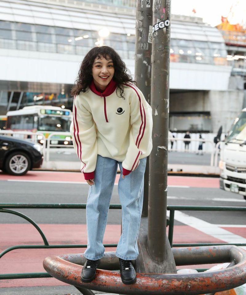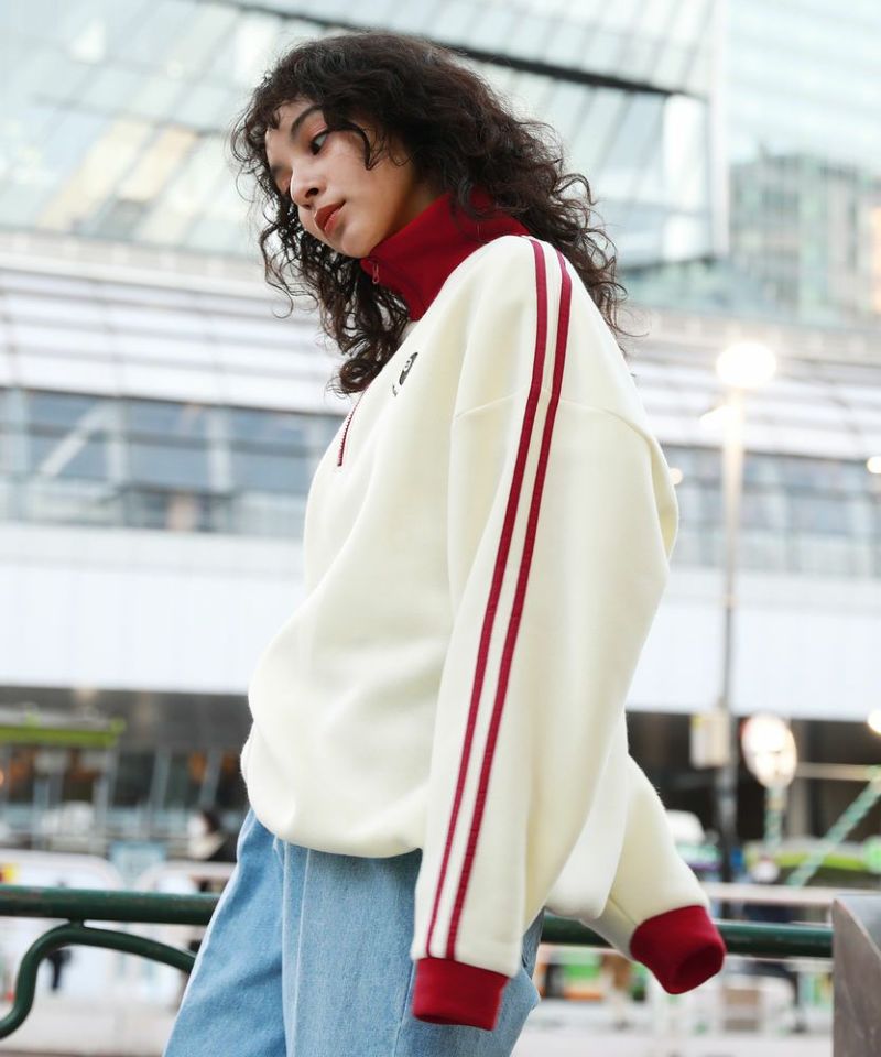 オーバーサイズハーフジップスウェットプルオーバー 配色 ビリヤードロゴ ワンポイント刺繍 サイドライン トラックジャケット