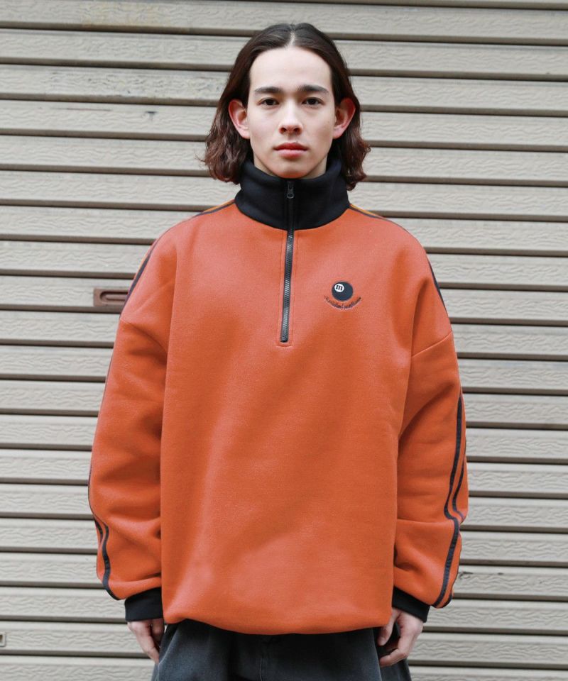 ハーフジップタイプのスウェット地プルオーバー。ビッグシルエットでゆったり着ていただけるサイジングとなっております。ジップを閉めてネック部分を立たせると首元をしっかり覆ってくれて、裾はパイピング仕様で風が通りにくいように仕上げました。ネック部分と袖の切り替え、袖のサイドラインでトレンドのトラックジャージ風デザインで、左胸にはオリジナルのビリヤードロゴを配しております。メンズ・レディース問わず着ていただけるユニセックス対応アイテムです。