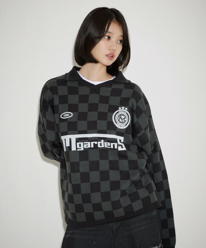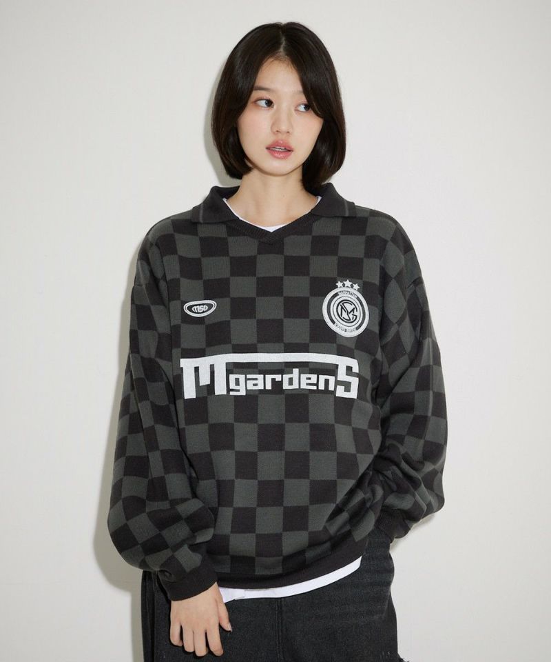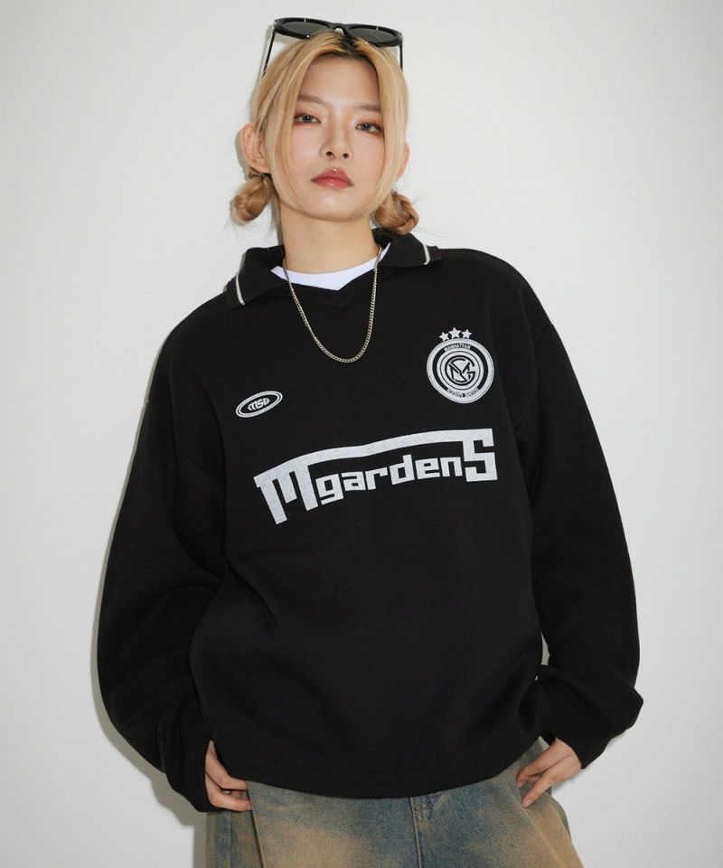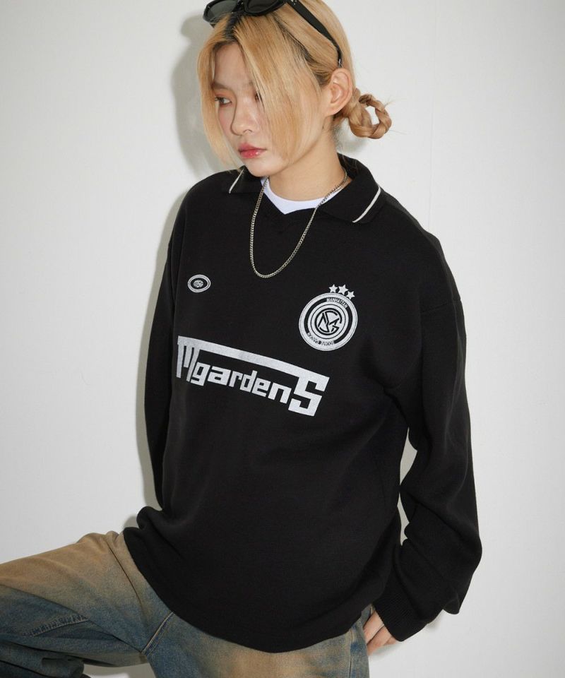 トレンドのスポーツミックススタイルが叶うユニフォームニット。胸元のロゴプリントや、襟の配色ラインがスポーティーな印象のアイテムです。 ブラックは無地にロゴプリントと襟のホワイトラインが映えるデザイン。オフは無地に袖、裾のブラックの配色がアクセントに。ブラック-チャコールはチェッカー柄、ブラック-レッドはストライプ柄の4配色です。ゆるっと着こなせるオーバーサイズでレディース、メンズ問わずお使い頂けるユニセックスアイテムです。