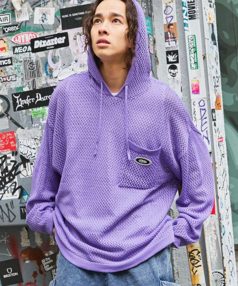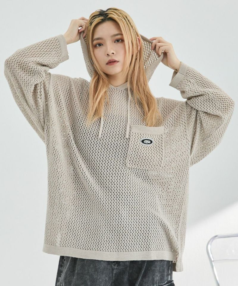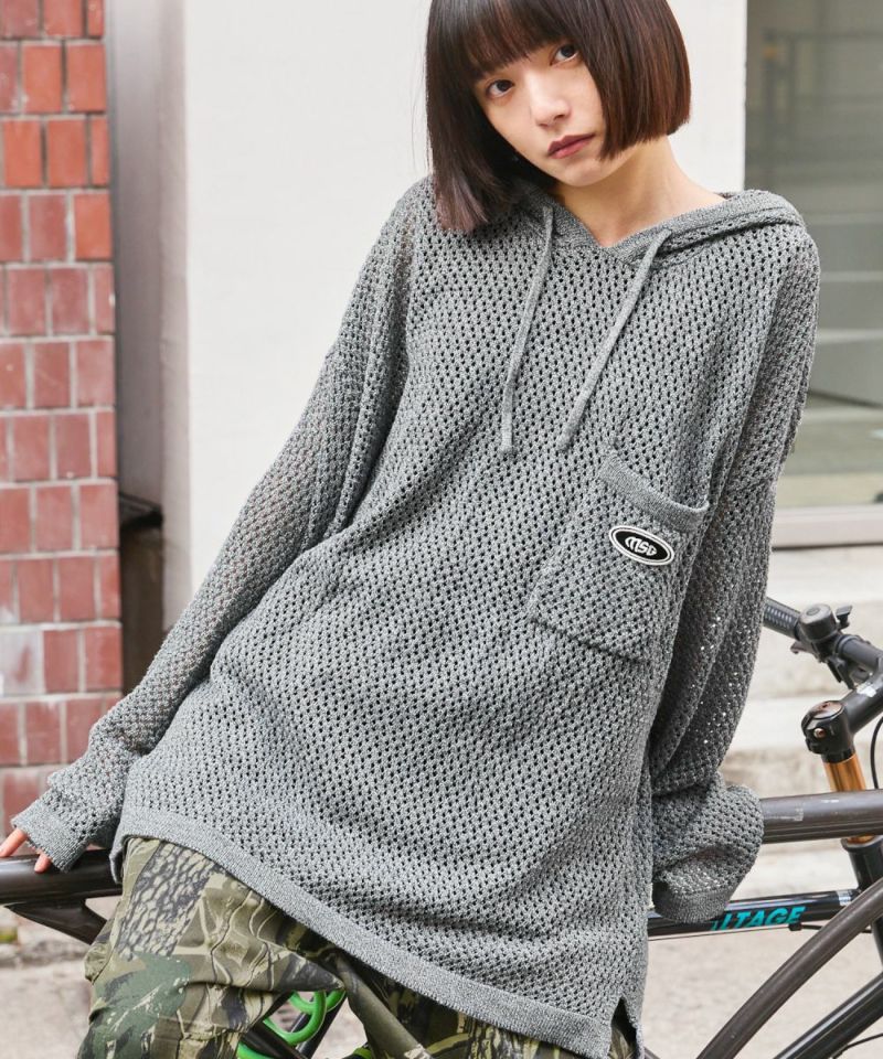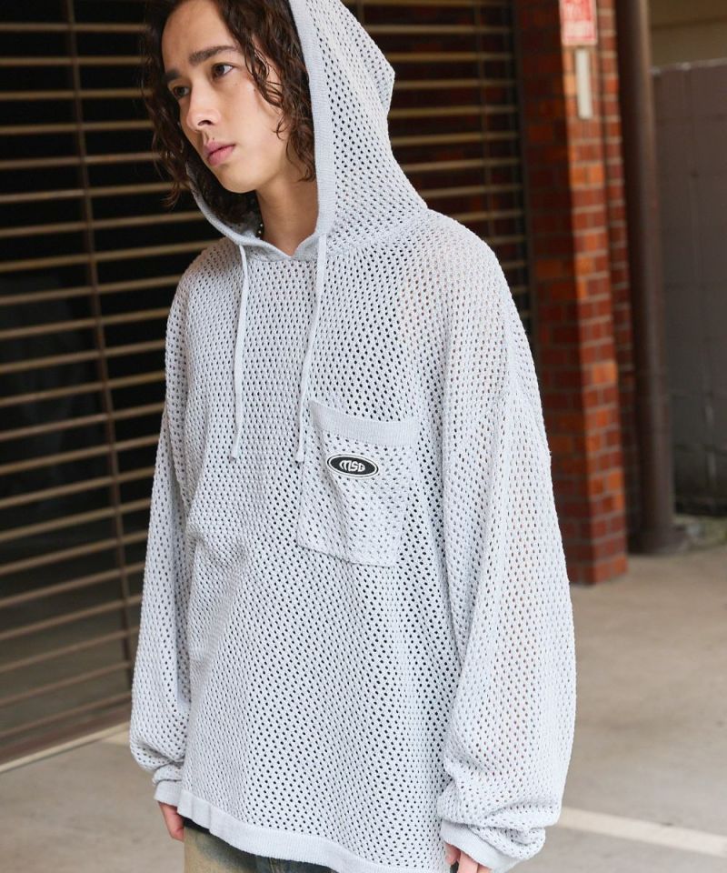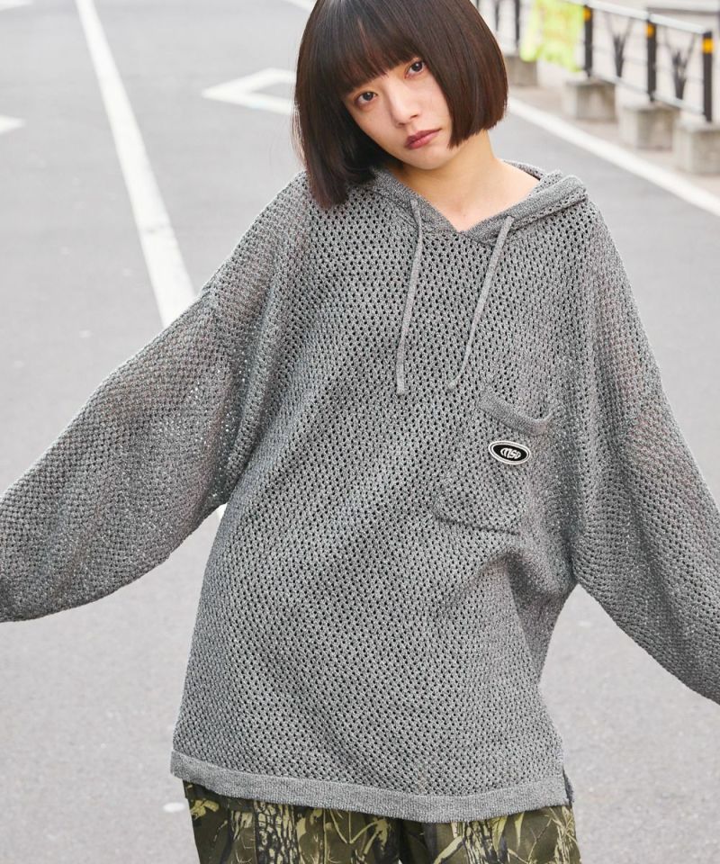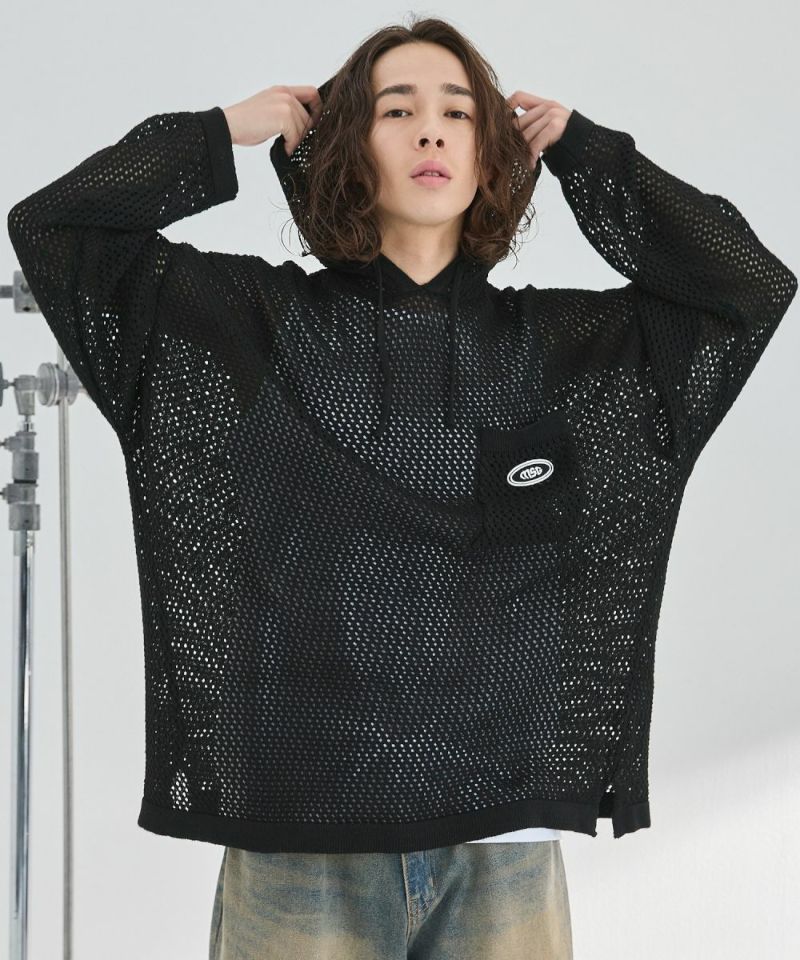オーバーサイズワッペン刺繍メッシュニットプルパーカー