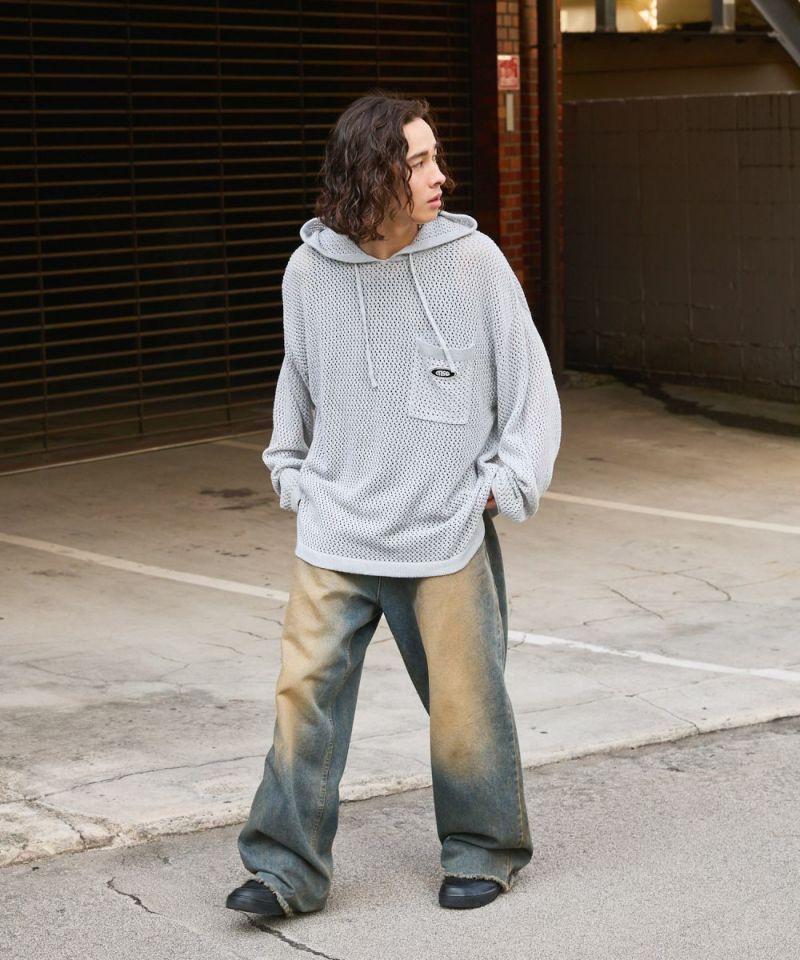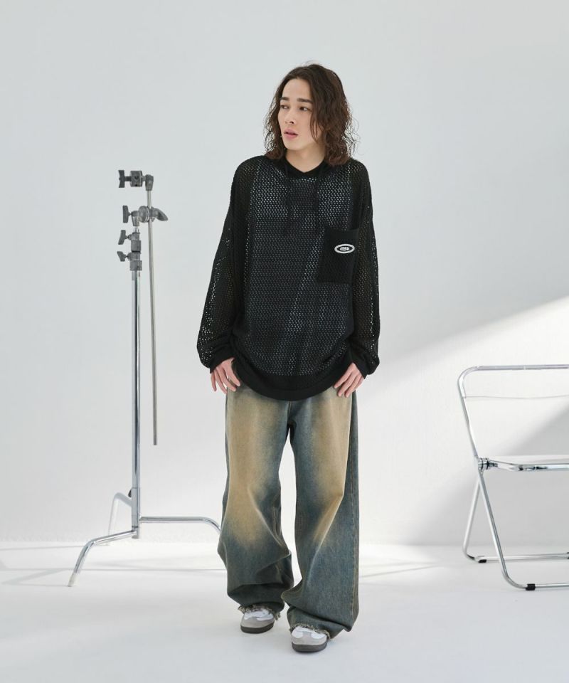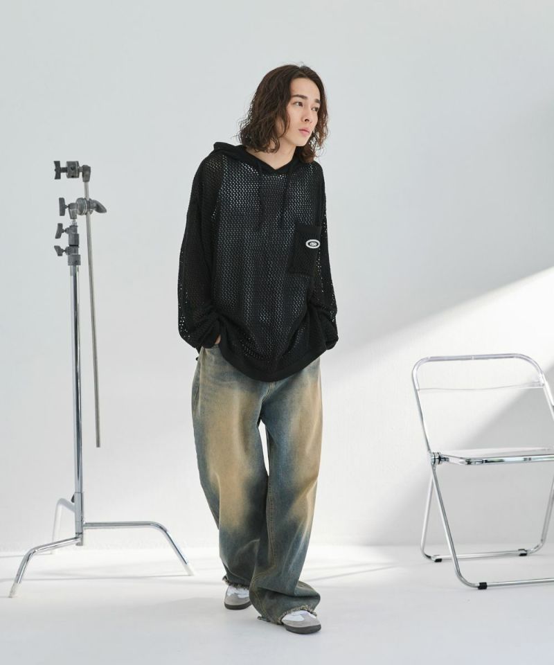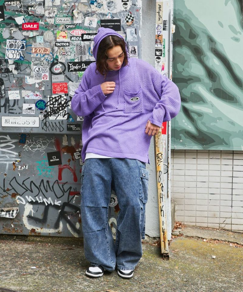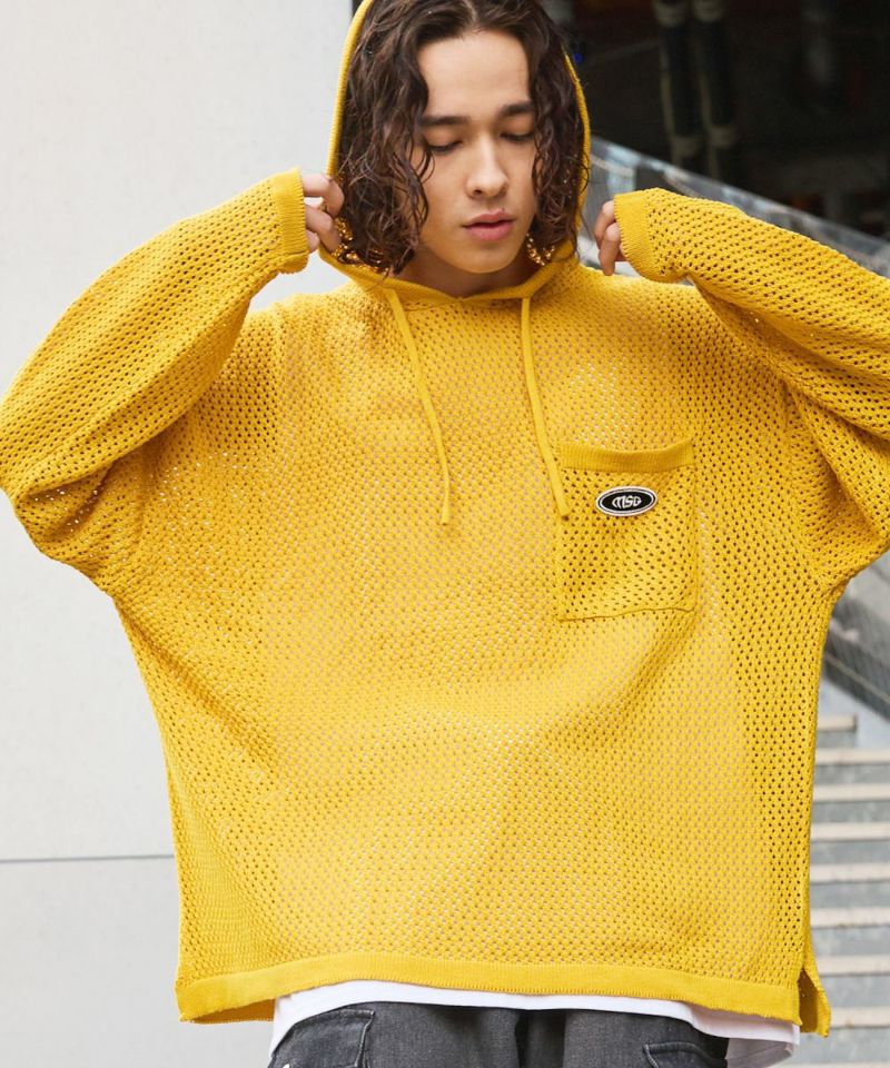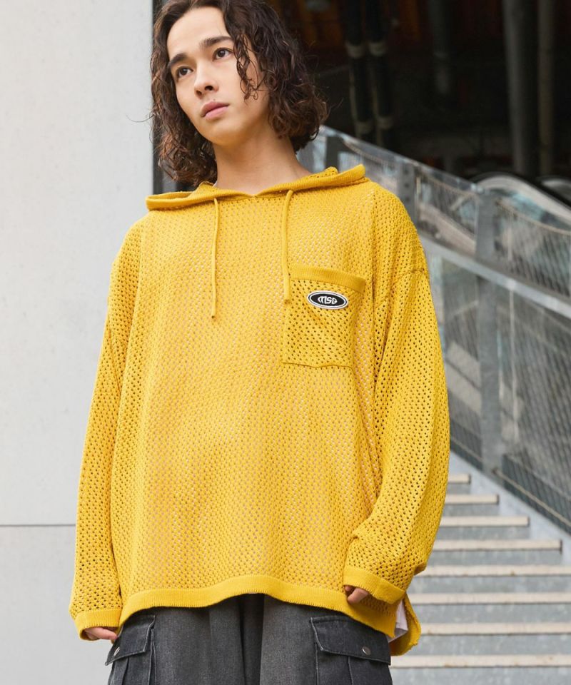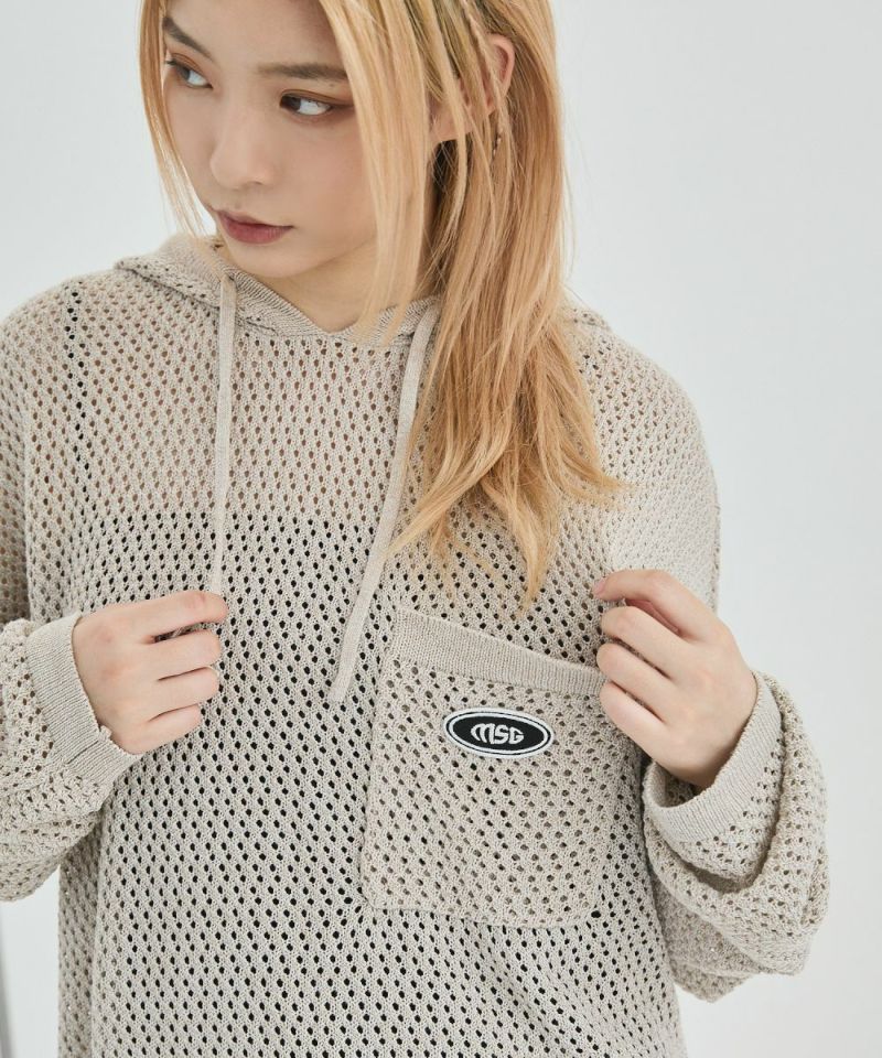 オーバーサイズワッペン刺繍メッシュニットプルパーカー