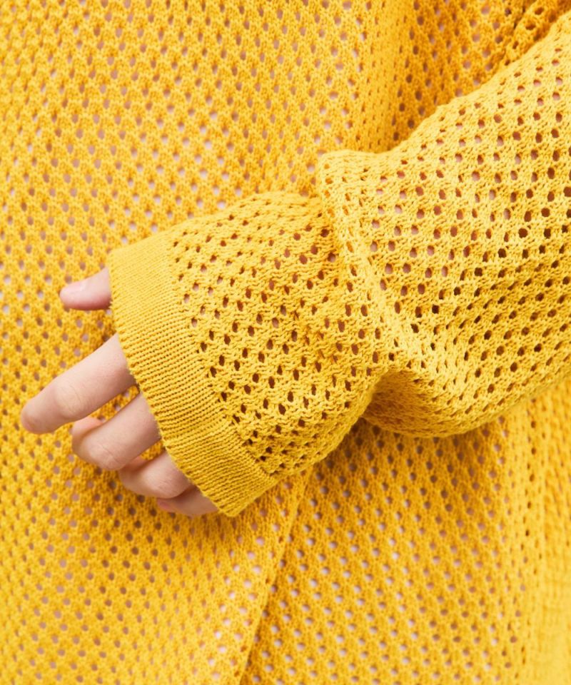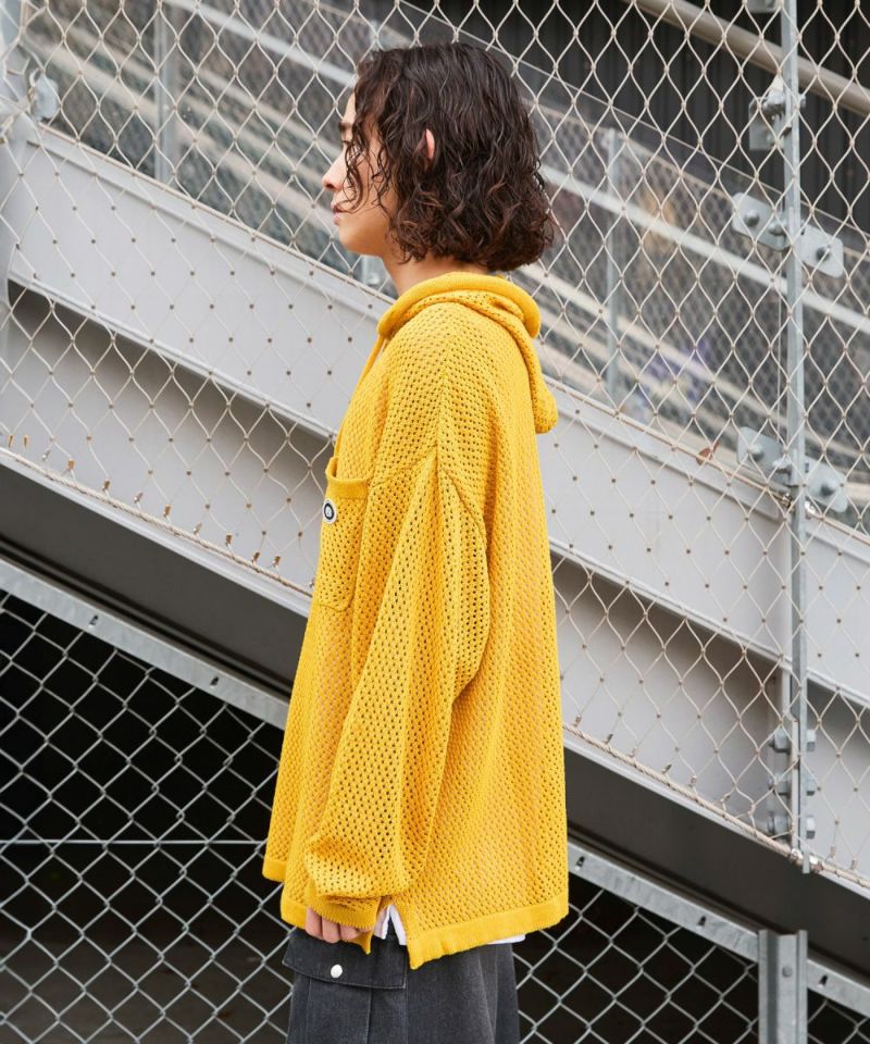 今季トレンドのメッシュ編みニットプルパーカー。ざっくりとしたメッシュ編みでほど良い透け感と抜け感を表現。タンクトップやカットソーなどインナーとのレイヤードを楽しめる1着。胸ポケットの上にオリジナルのブランドロゴ、サイドにはスリット入りで、アクセントに。ルーズシルエットとドロップショルダーが今っぽいリラックス感を演出します。着回しやすいブラックやグレー、チャコール、淡めのライトグレー、アクセントカラーのパープルやマスタードを加えた6色展開。取り入れるだけで旬の着こなしが作れるおすすめのアイテムです。