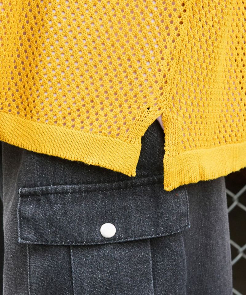 インナー次第でロングシーズン着まわせるアイテム。透け感を活かしてタンクトップやカットソーなどインナーとのレイヤードコーデを楽しめます。メッシュ編みでアクセントを出しつつもデザイン自体はシンプルなクルーネックニットなので、ボトムスを選ばず合わせやすいのがポイント。カーゴパンツやデニムパンツなどお手持ちのアイテムと合わせてトレンドの着こなしに。