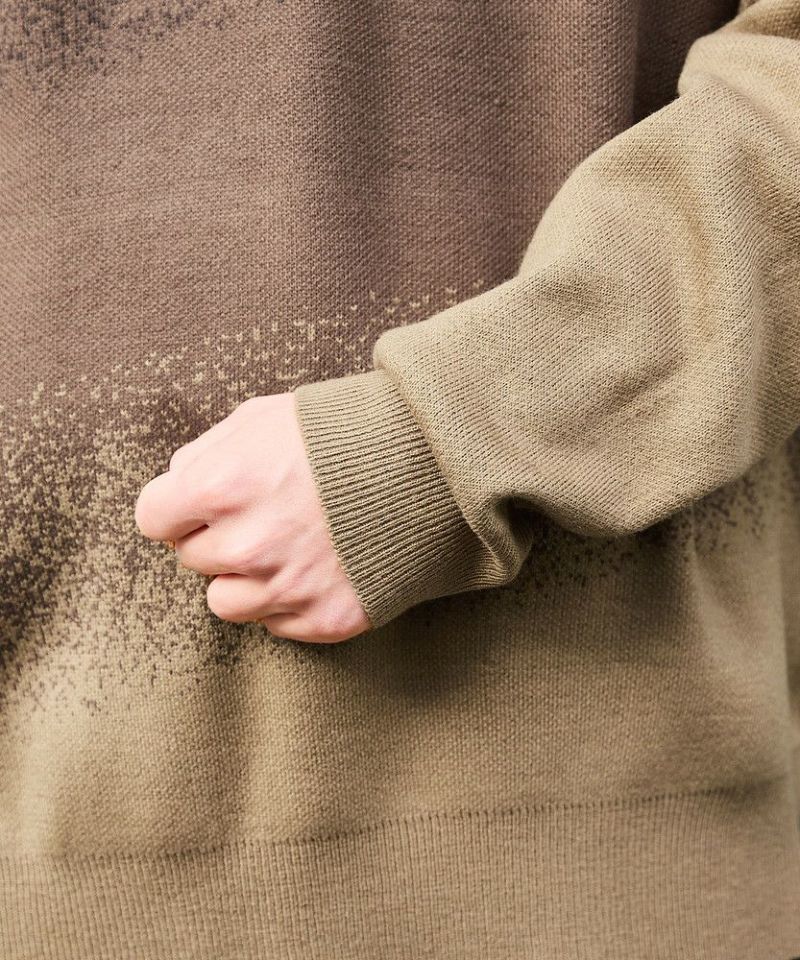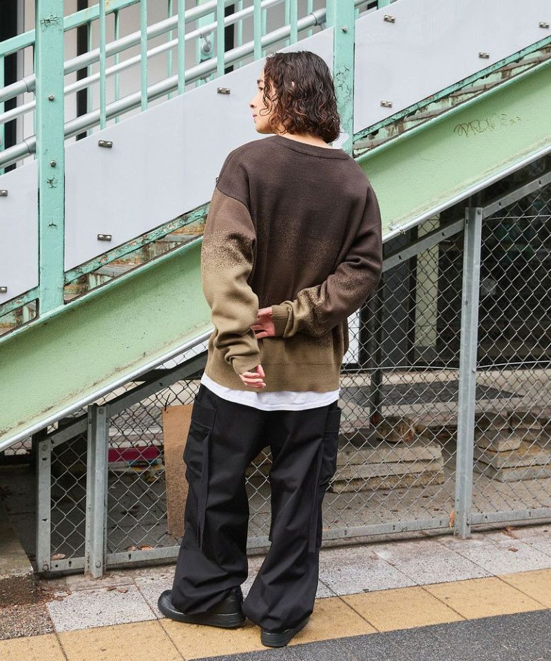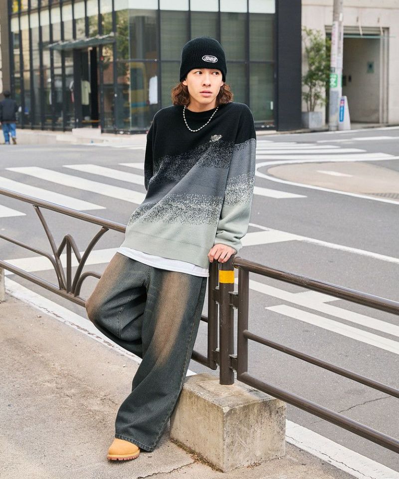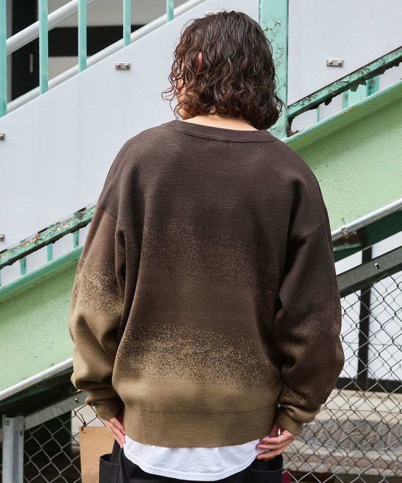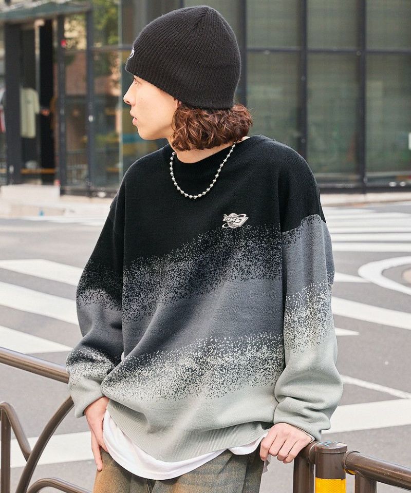 1枚でコーディネートがサマになるグラデーションニット。インパクトがありながらも落ち着いた配色で、コーディネートに取り入れやすいアイテムです。デニム、カーゴパンツ、ワイドパンツなどとの相性抜群。秋から冬、春先にかけて合わせやすい一着です。