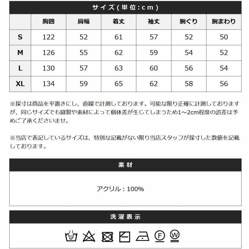チクチクしにくく、お手入れも簡単なアクリル100%素材を使用。柔らかい着心地で快適に過ごせます。袖口や裾はリブ編みで、程よく身体にフィットします。