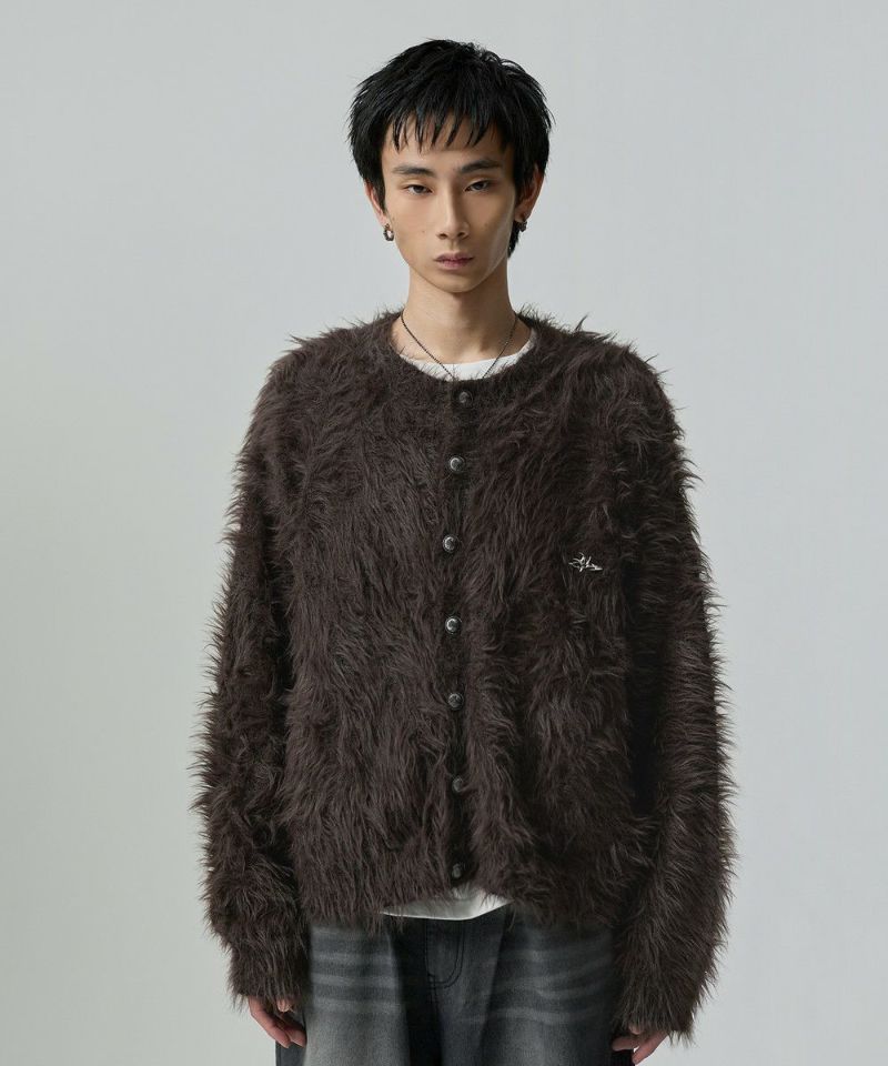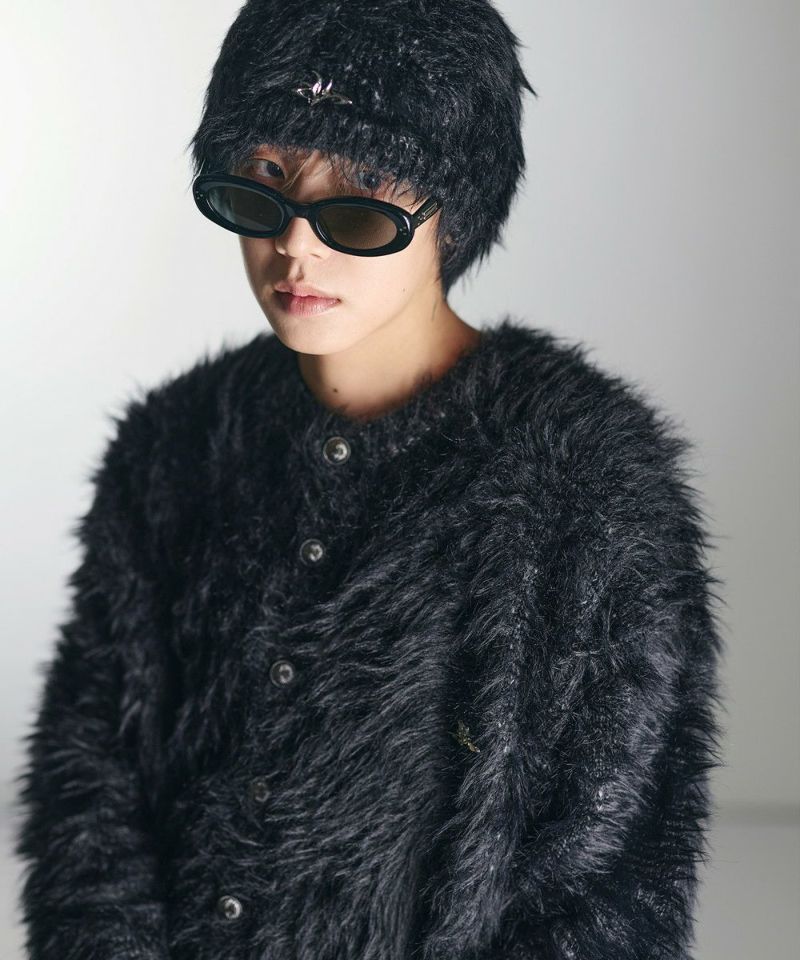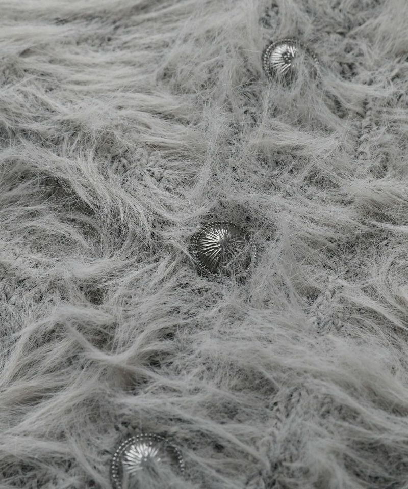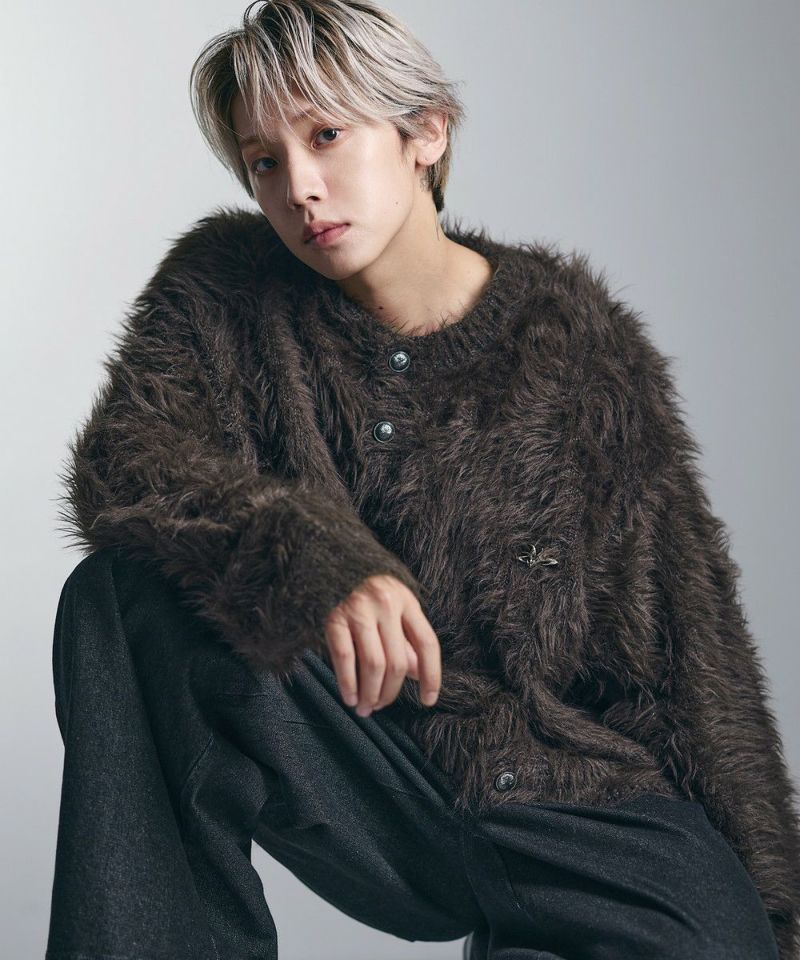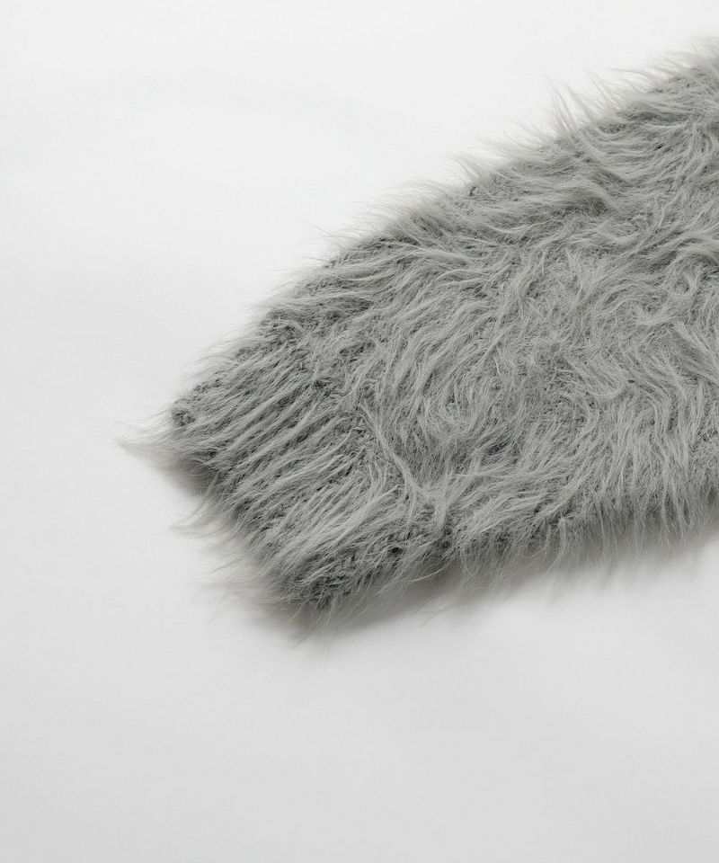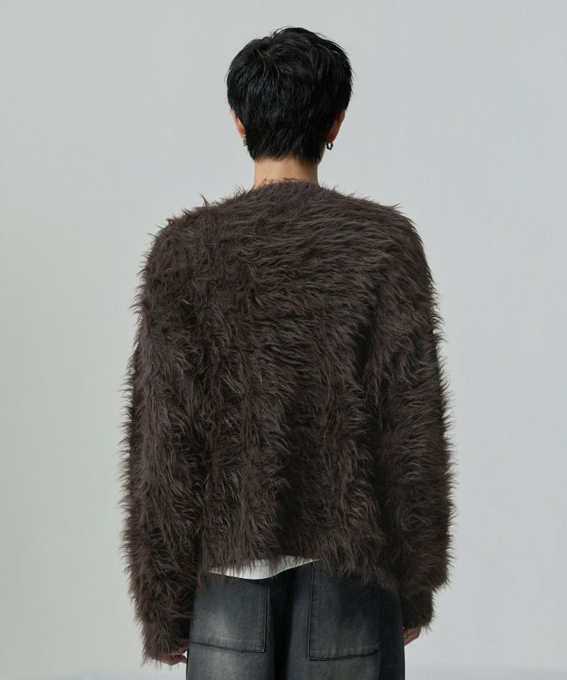 ・毛足の長いフェザー調素材を使用し、存在感と季節感を演出したカーディガン。