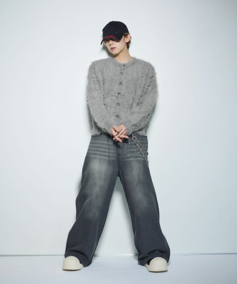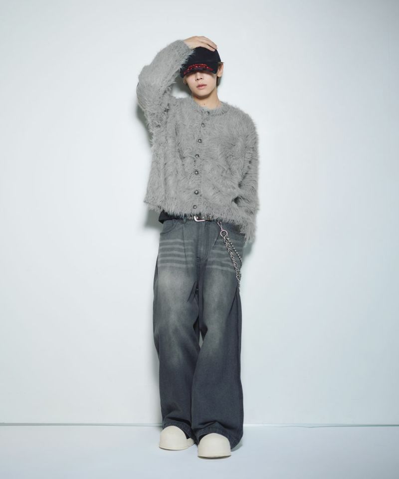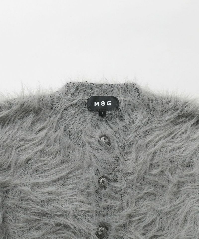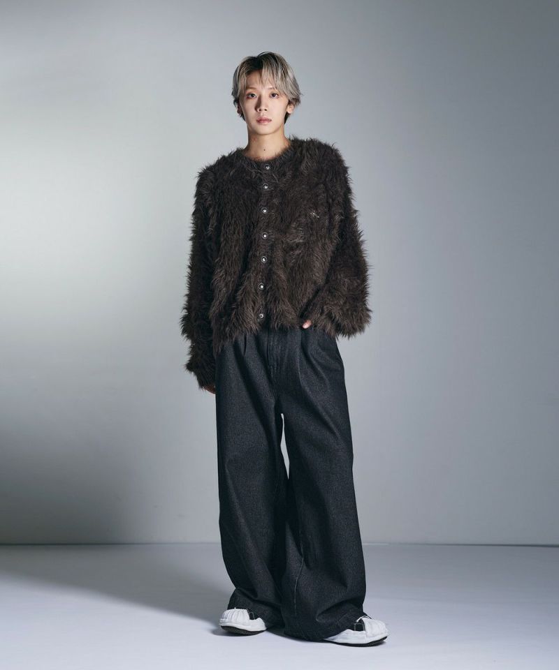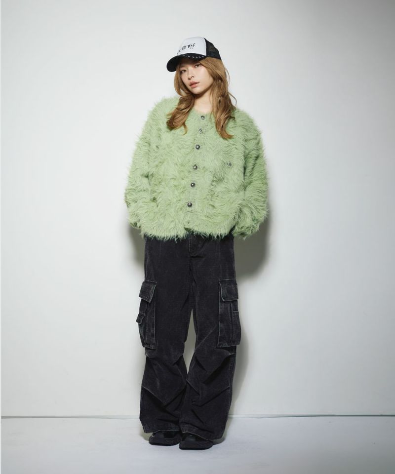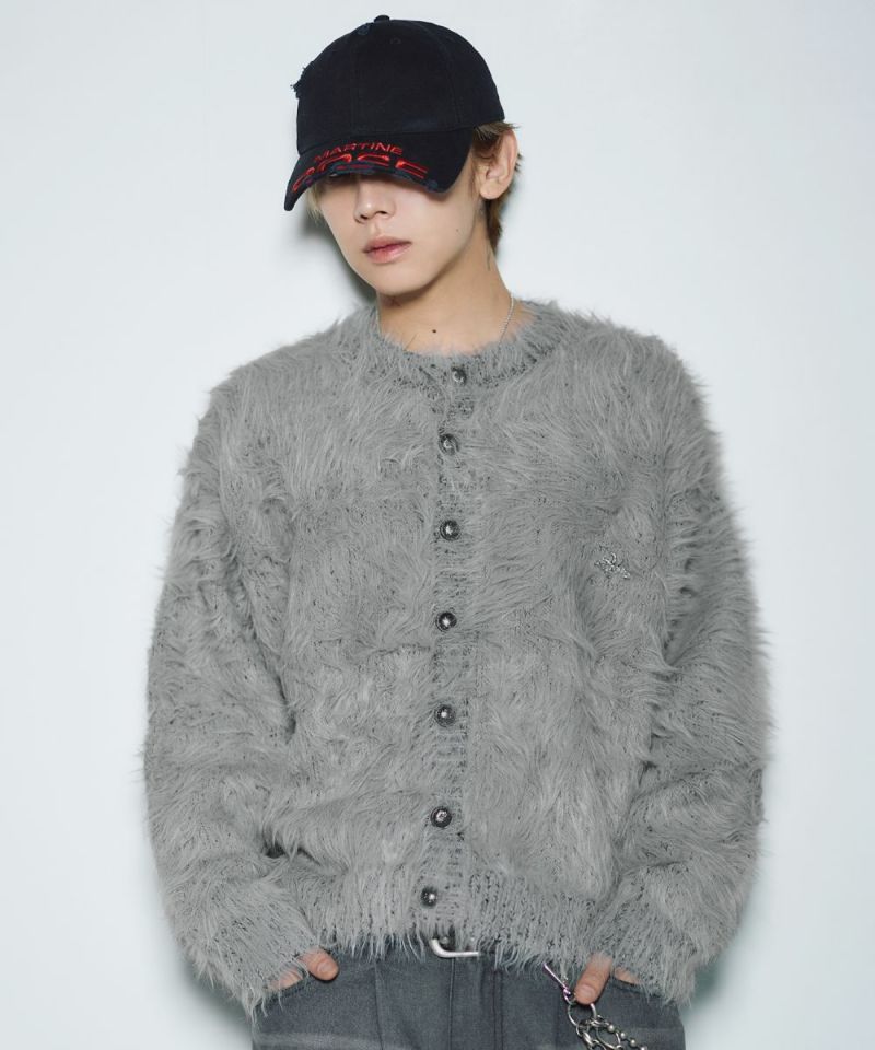 ・毛足の長いフェザー調素材を使用し、存在感と季節感を演出したカーディガン。