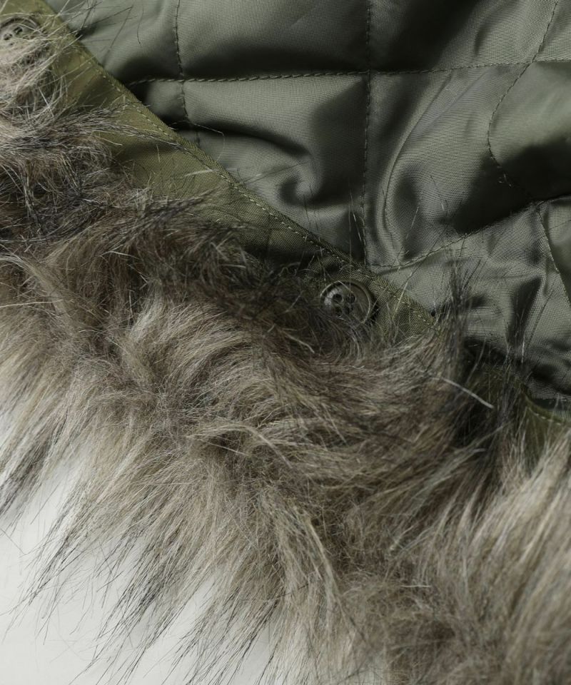 ・また取り外しの可能なファーを取り付け、開閉のできるジッパー付きの大きめのフードが特徴的な一着。