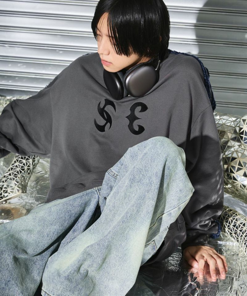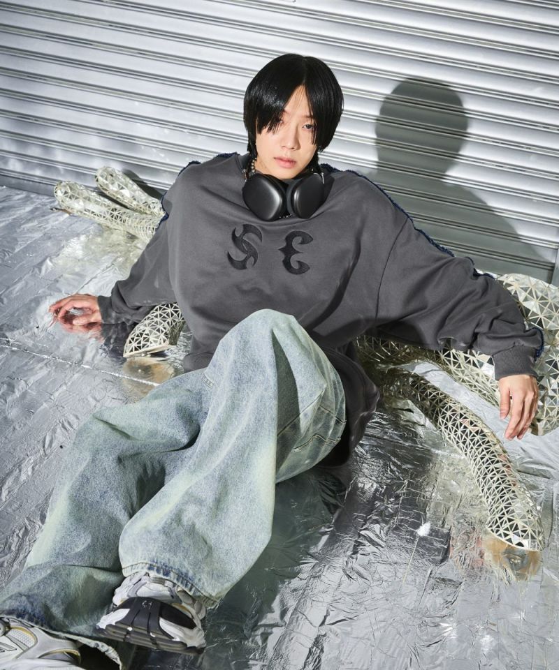 サイドのデニムフリンジラインが特徴のクルーネックスウェット。フロントにはメタルのロゴ刺繍が施しており、アクセントに。ややワイドな身幅&ドロップショルダーでリラックス感溢れるビッグシルエットで仕上げました。袖は大きくゆとりを持たせ、裾は程良くたまりができるバルーンシルエットのデザイン。着回しのしやすい、グレーとチャコールの2色展開。メンズ・レディース問わず着ていただけるユニセックス対応アイテムです。