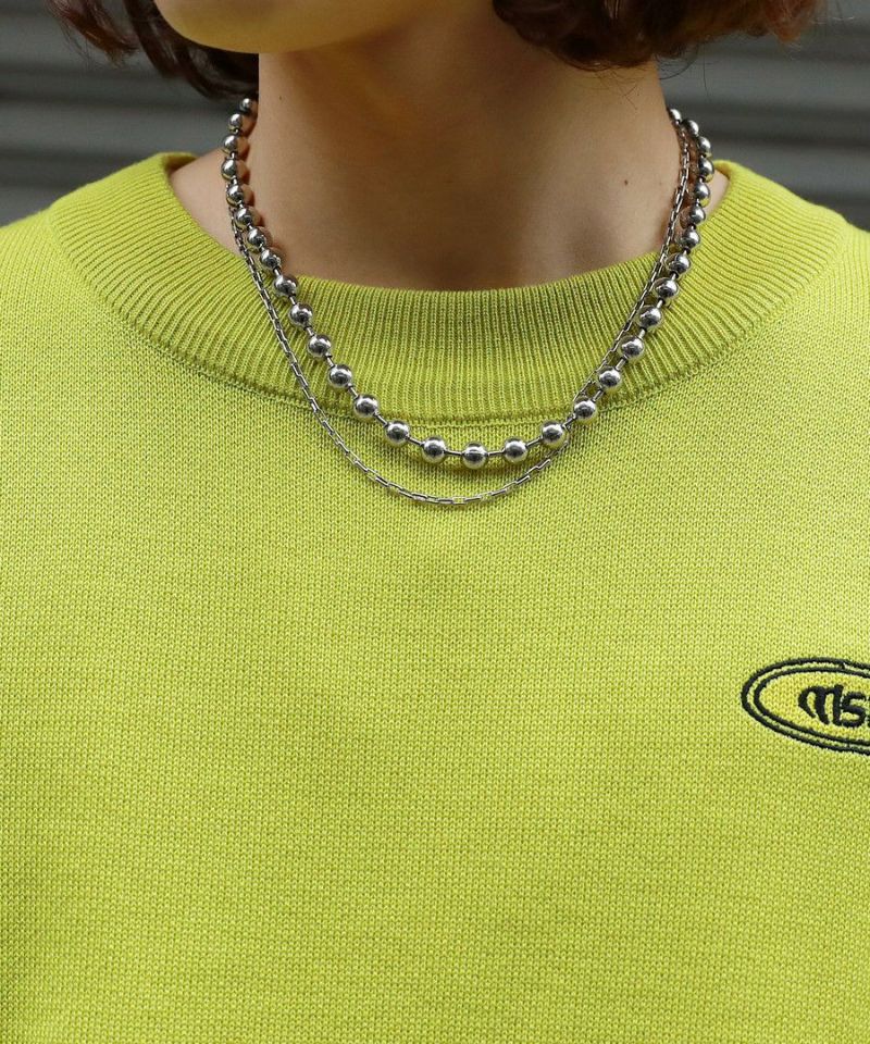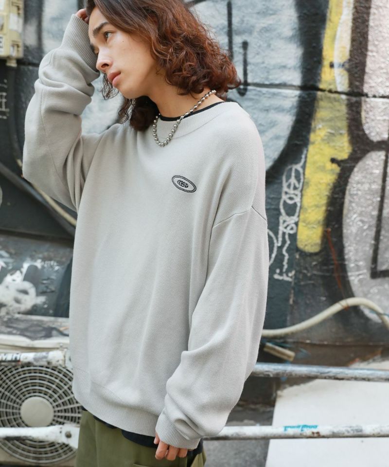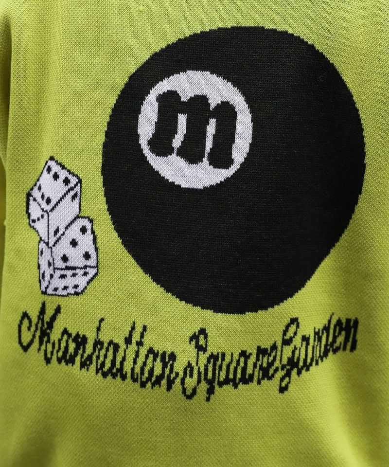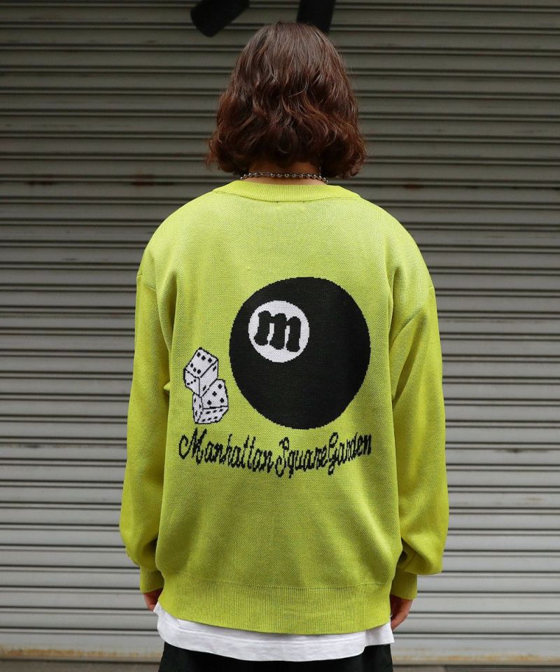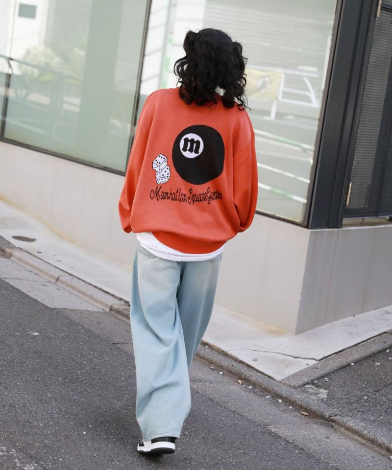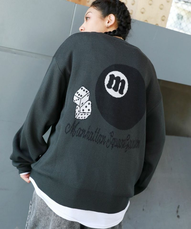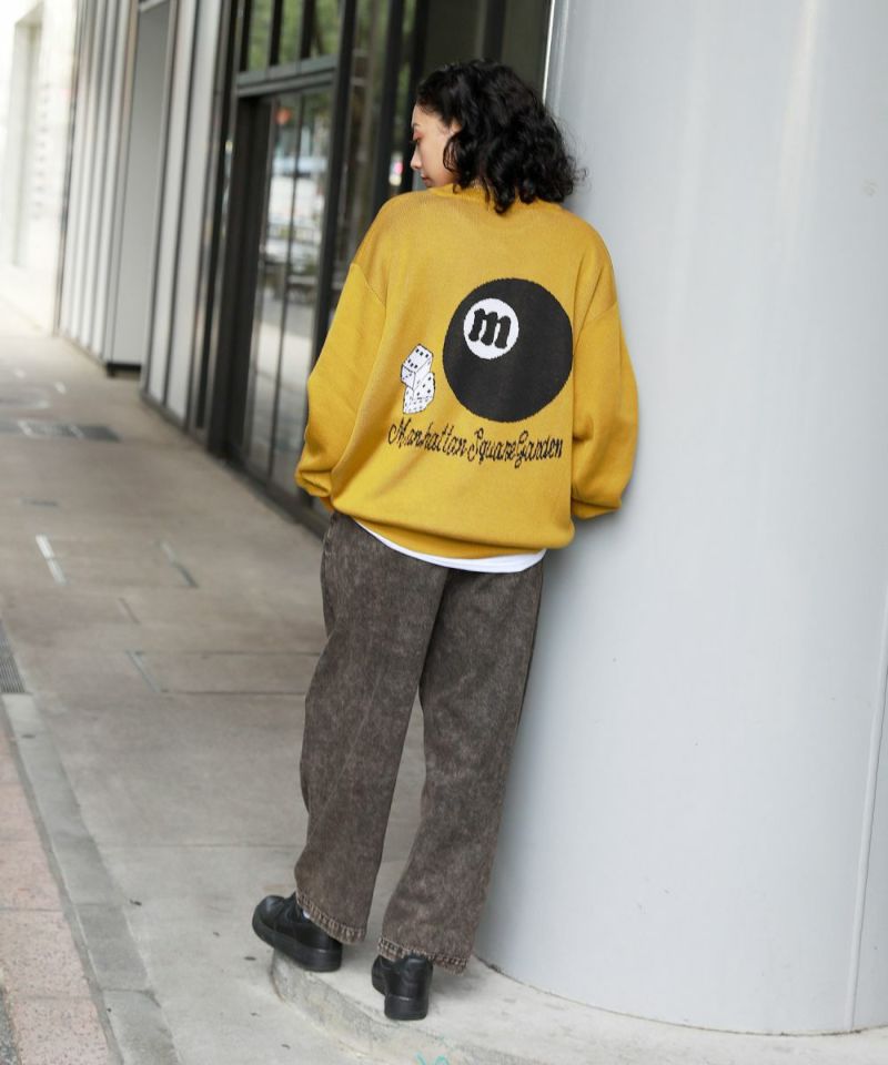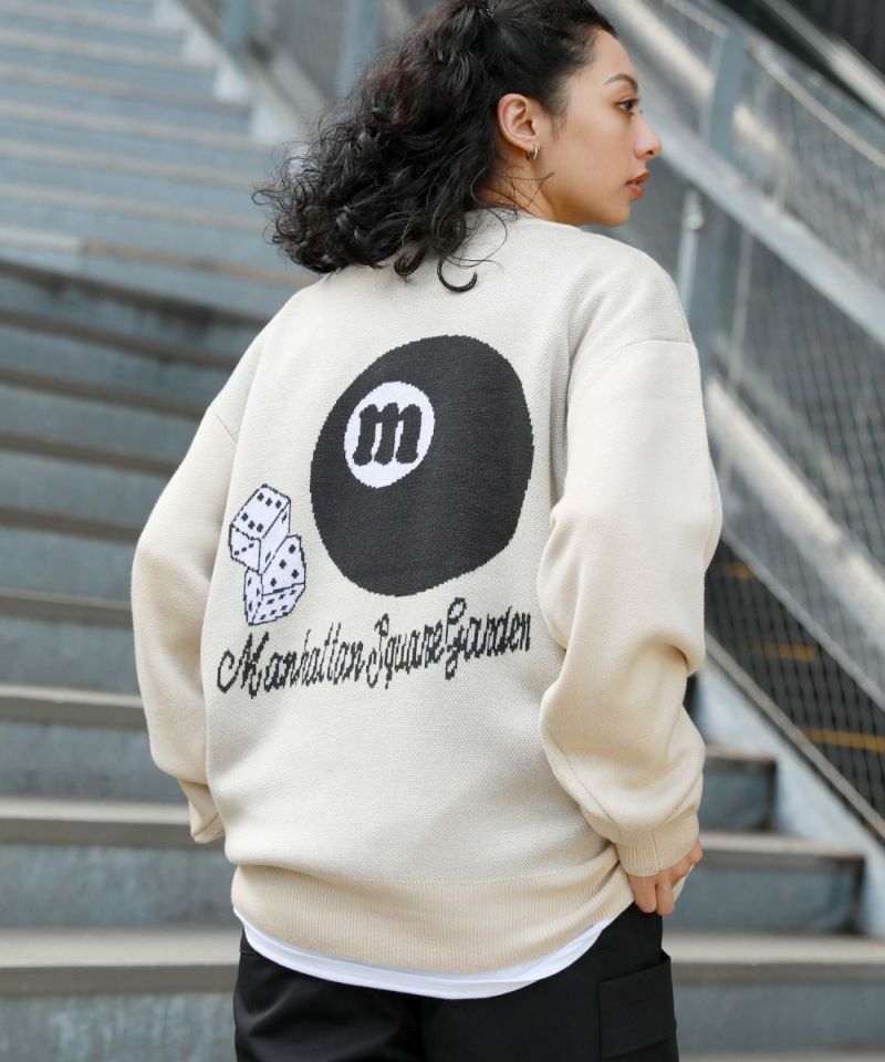 バックスタイルのビリヤードモチーフがインパクト大のクルーネックニット。