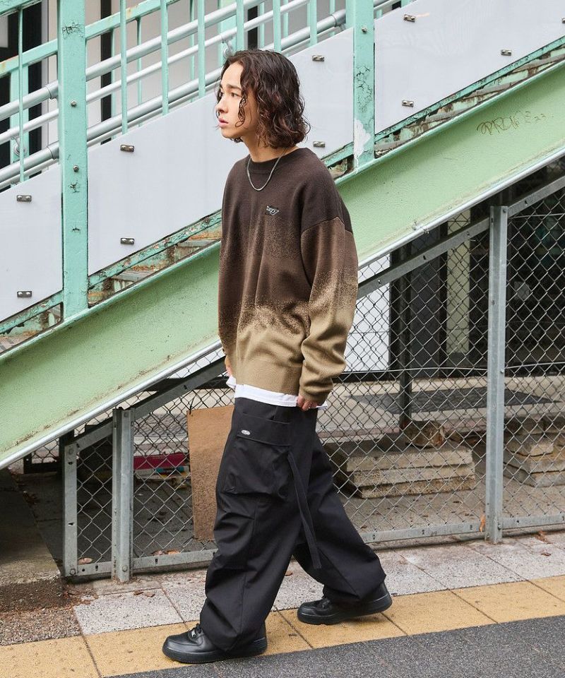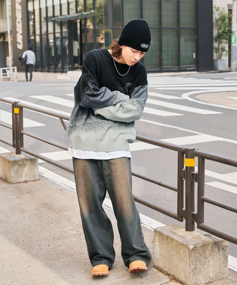 1枚でコーディネートがサマになるグラデーションニット。インパクトがありながらも落ち着いた配色で、コーディネートに取り入れやすいアイテムです。デニム、カーゴパンツ、ワイドパンツなどとの相性抜群。秋から冬、春先にかけて合わせやすい一着です。