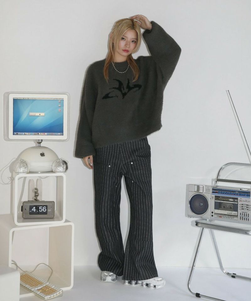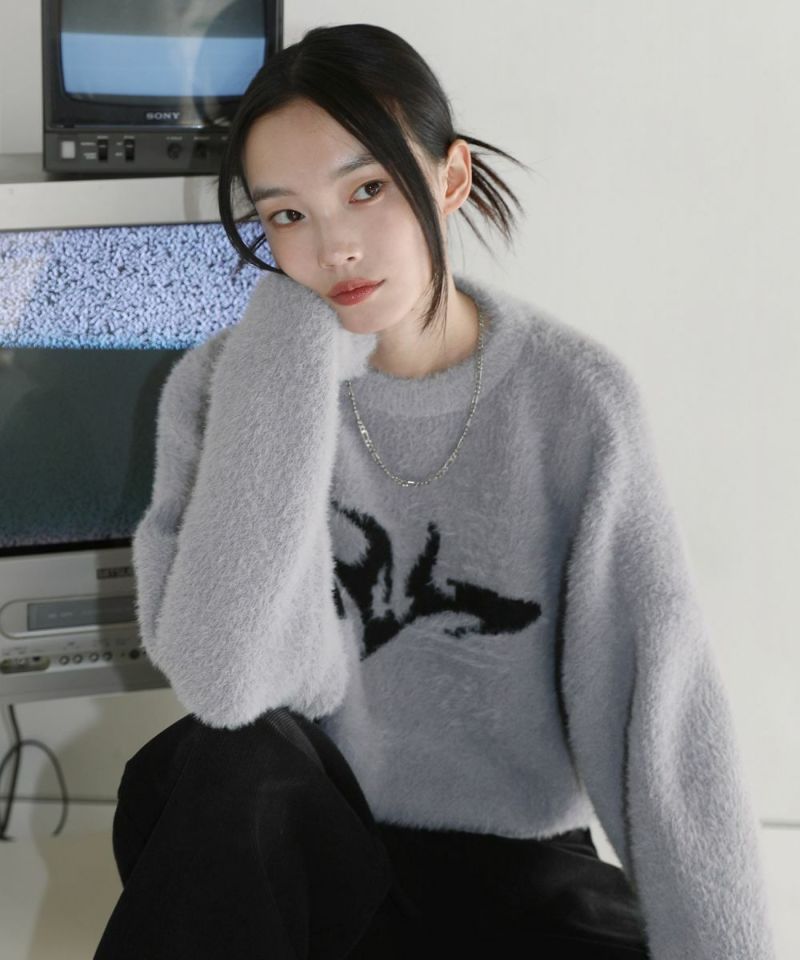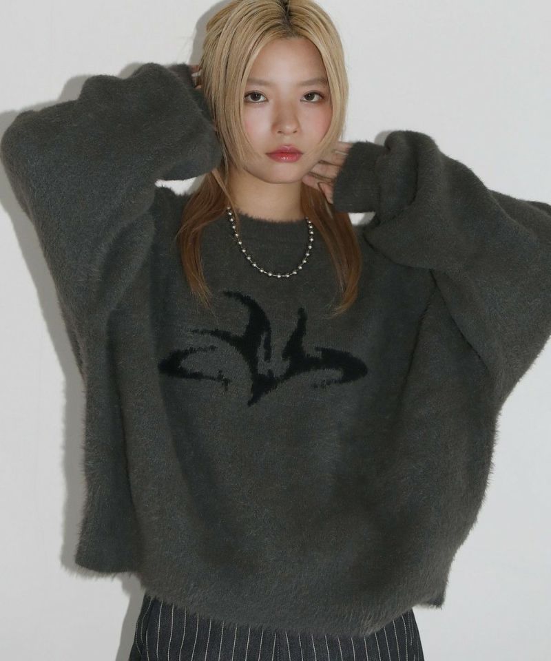 柔らかな色味と風合いある生地感が特徴のフェザーニット。ブランドロゴをグラフィックでデザインしたアイテム。程よい毛足の長さで肌触りが優しく、ファーのようなふんわりとしたルックスが魅力です。ショート丈&広めの身幅によってリラックス感ある着こなしが可能。レディース、メンズ問わず着用可能です。