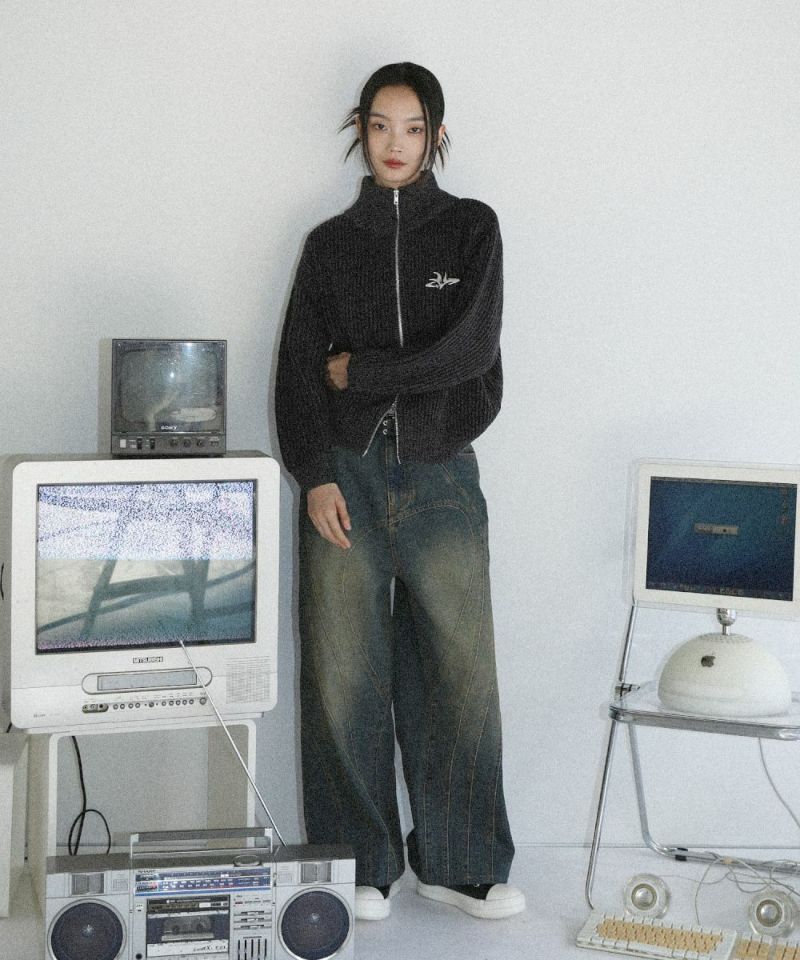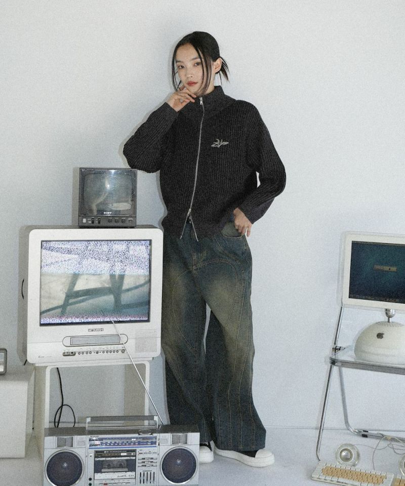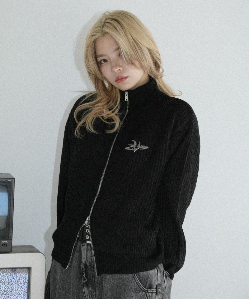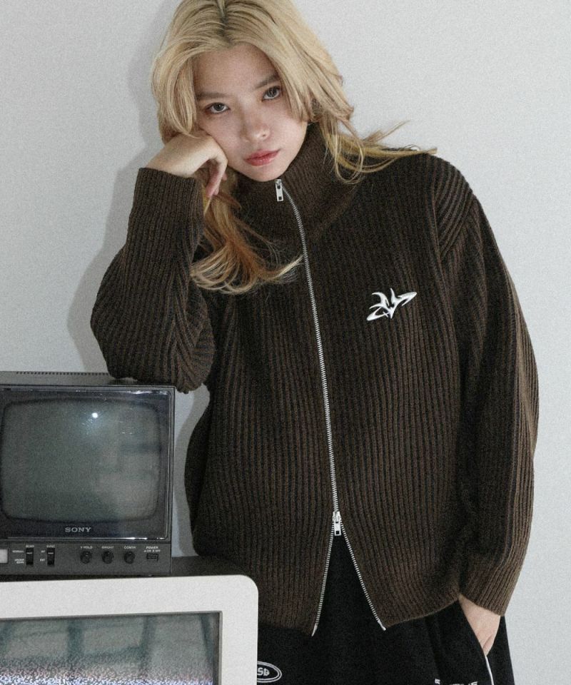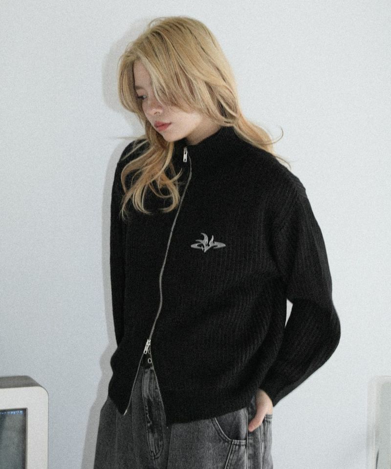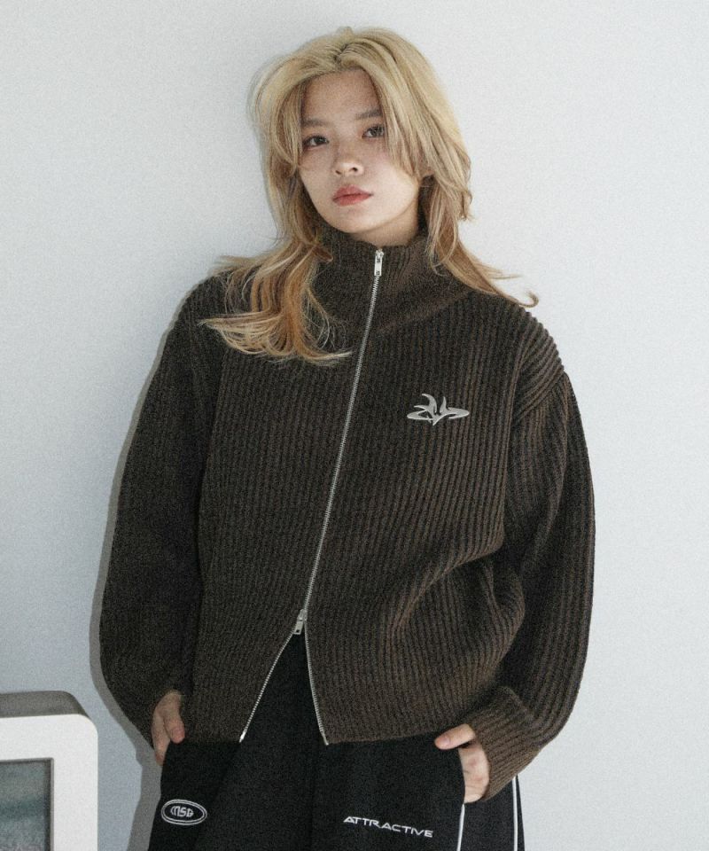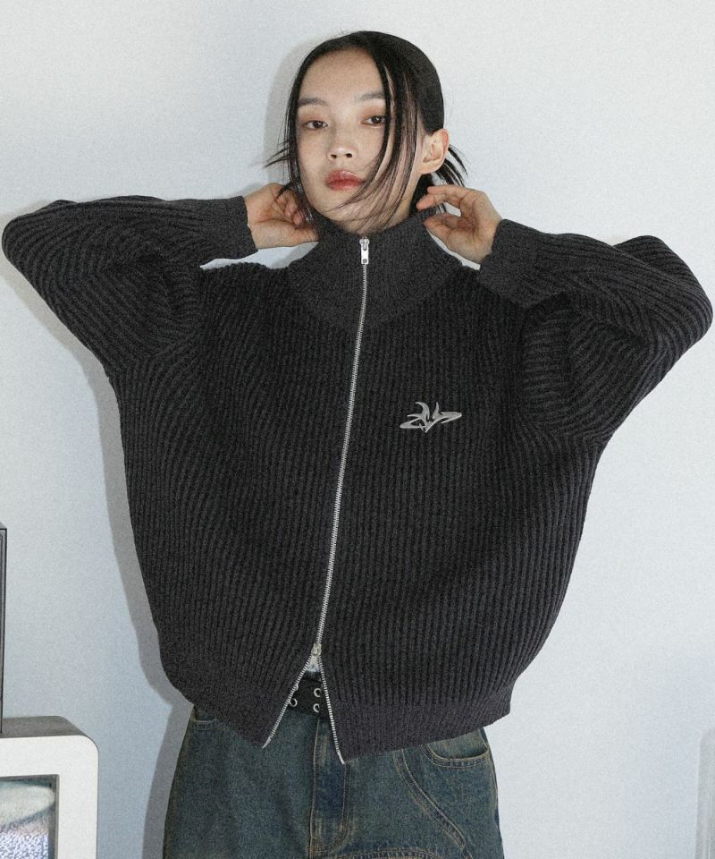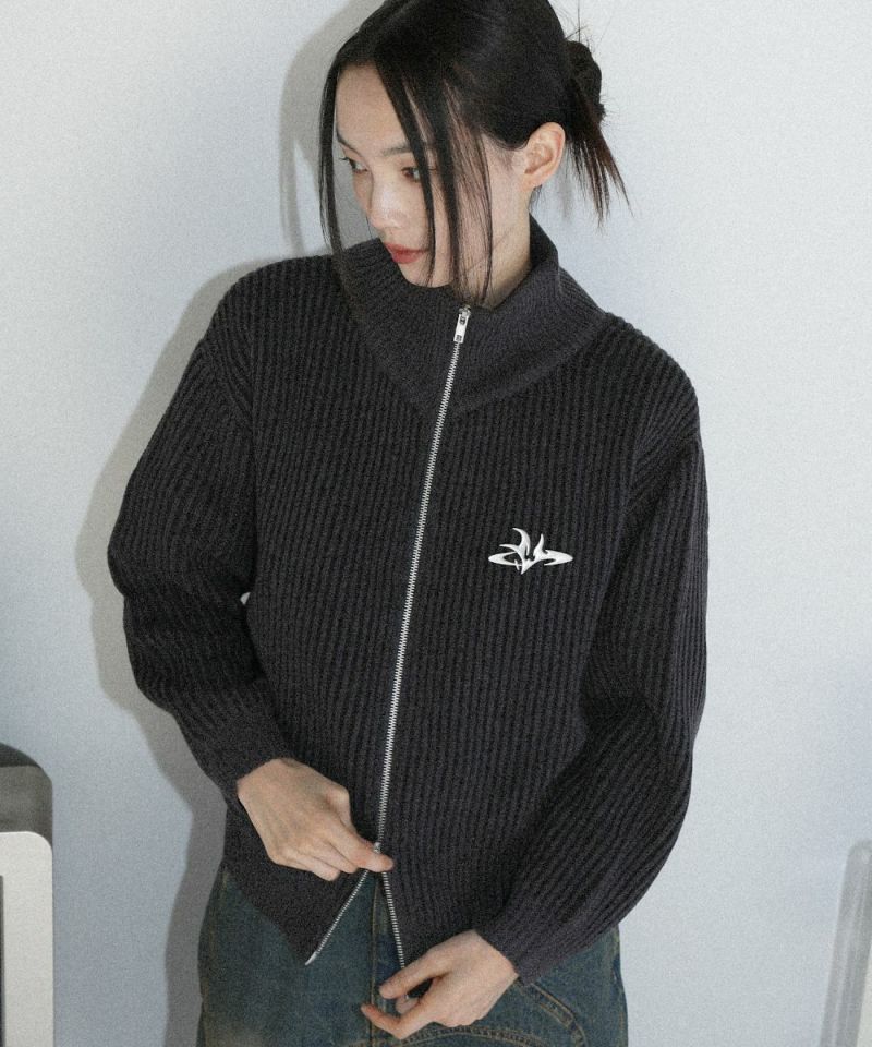 立体的な表情の編地が特長のジップアップニット。2色の糸を編み込んでいるため、裏面の色との絶妙な配色が着こなしのアクセントになります。ヴィンテージライクな雰囲気に、胸元にはメタルプレートを施し、さりげないデザインポイントに。上下どちらからも開けられるダブルジップ仕様になっており、裾側をオープンにしてインナーを見せるなど、開け方次第で幅広い着こなしを楽しめます。レディース、メンズ問わず着用可能です。