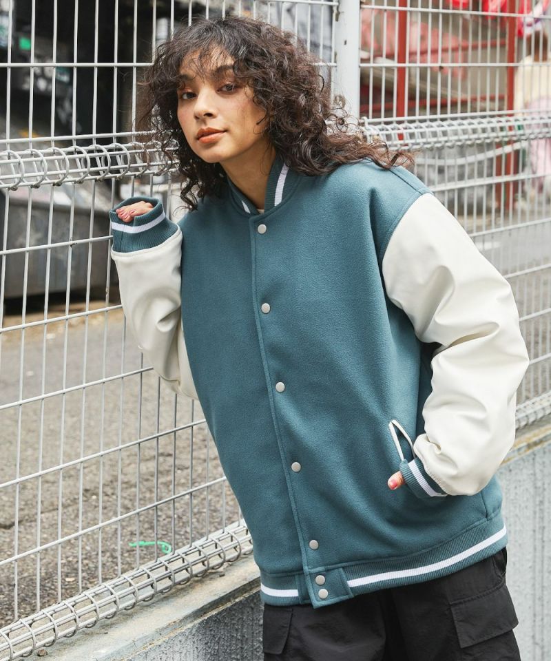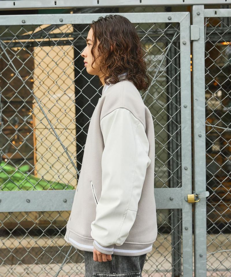 ボディは厚手のメルトン、袖はPUレザーの切り替えデザインのスタジャン。スタジャン本来のクラッシックかつストリートな雰囲気をキープしつつ、オーバーサイズで現代のニーズに合った一着です。袖と裾はラインリブ仕様で丸みのあるバルーンシルエットが魅力的なアイテムです。肩を落としたビッグシルエットとたっぷりのアームホールで、パーカーやニットなど厚手のインナーもゆったりと合わせられます。裏地が中綿入りのキルティングなので保温性に優れており、真冬にも対応できる本格アウターです。S〜XLサイズの幅広いサイズ展開で女性にもおすすめなユニセックスアイテムです。