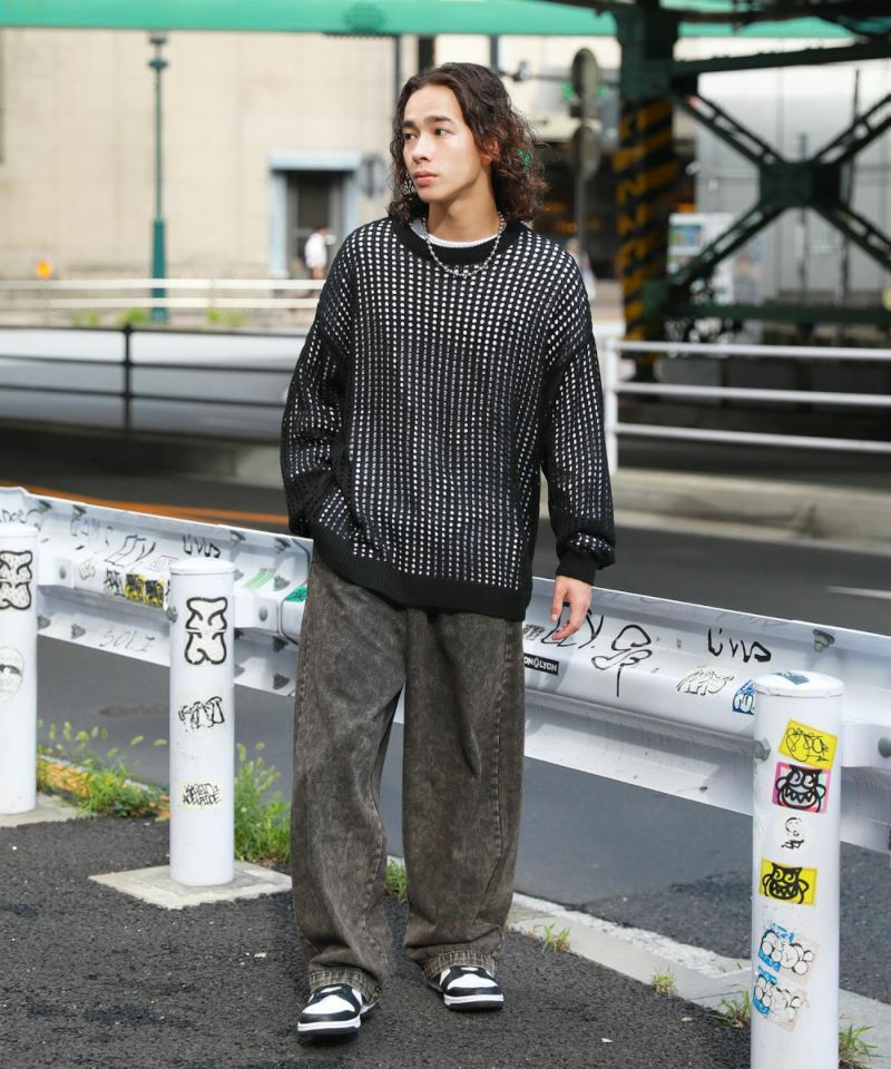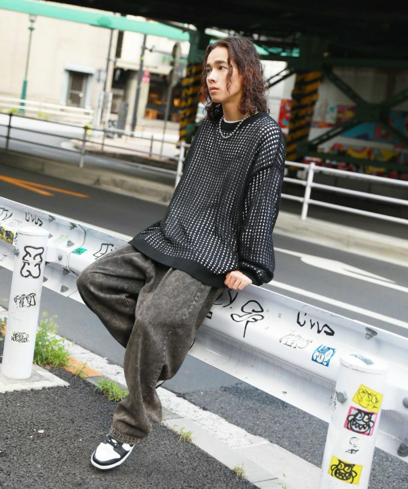 インナー次第でロングシーズン着まわせるアイテム。透け感を活かしてタンクトップやカットソーなどインナーとのレイヤードコーデを楽しめます。メッシュ編みでアクセントを出しつつもデザイン自体はシンプルなクルーネックニットなので、ボトムスを選ばず合わせやすいのがポイント。カーゴパンツやデニムパンツ、ショーツなどお手持ちのアイテムと合わせてトレンドの着こなしに。