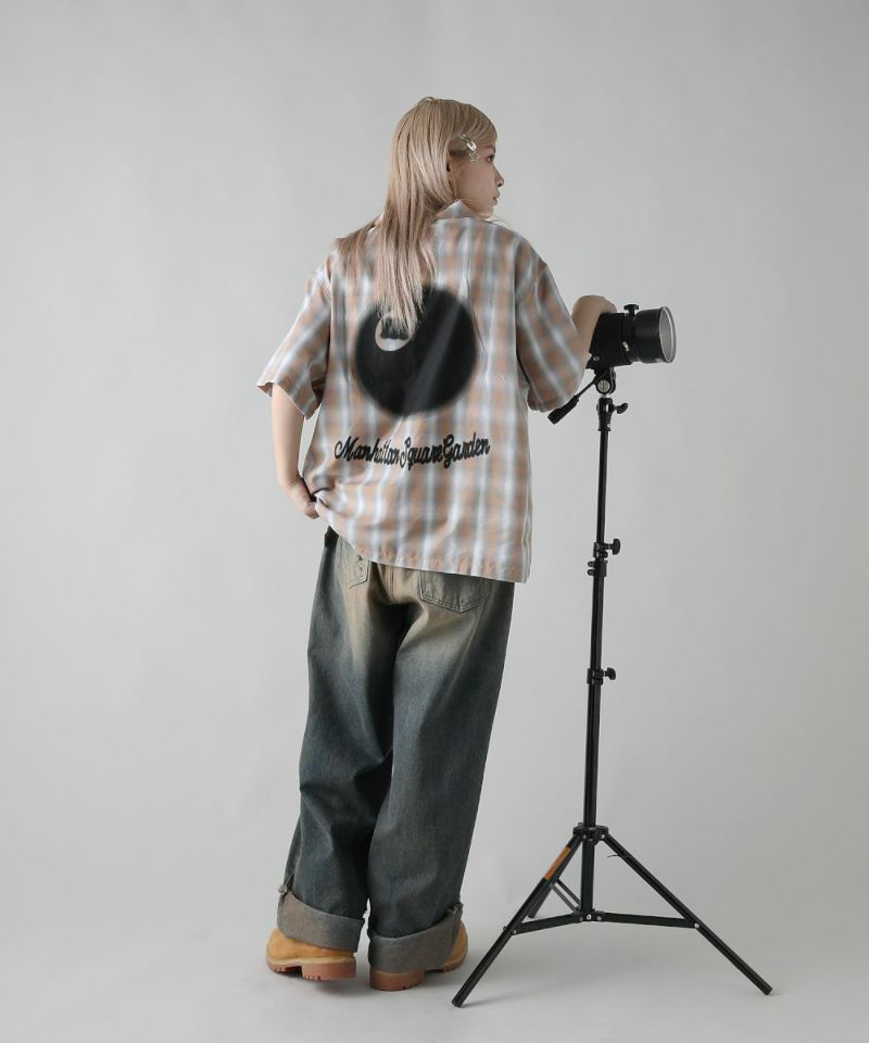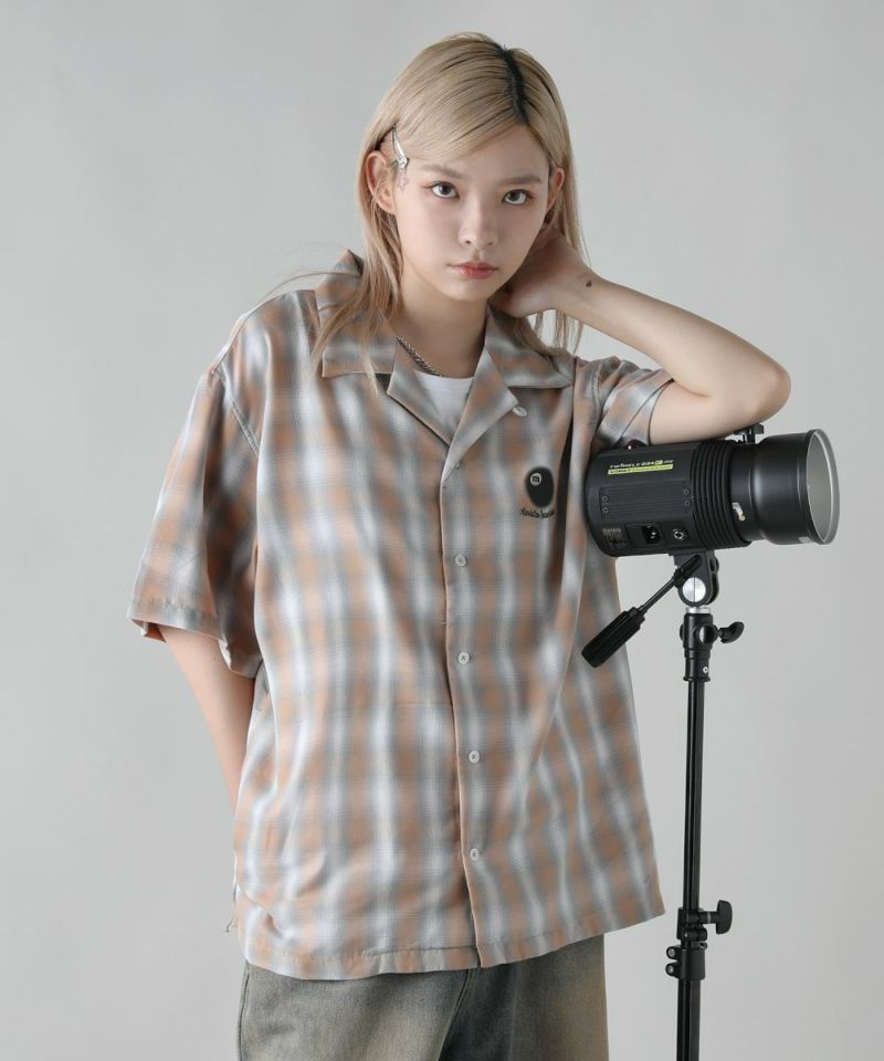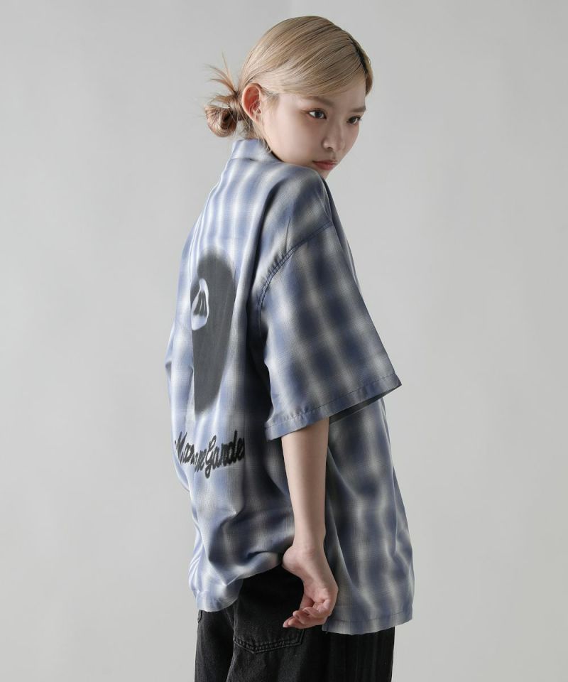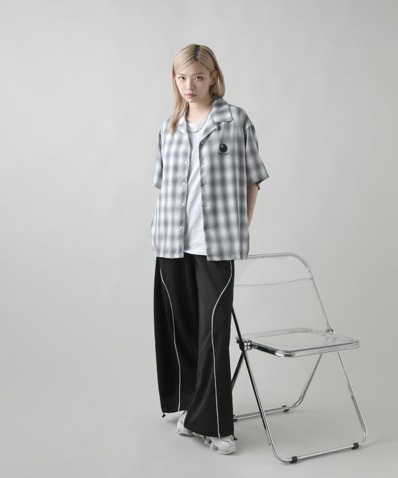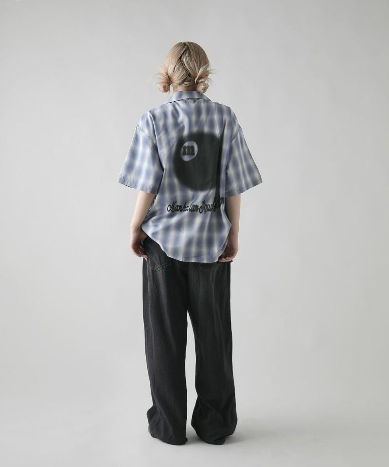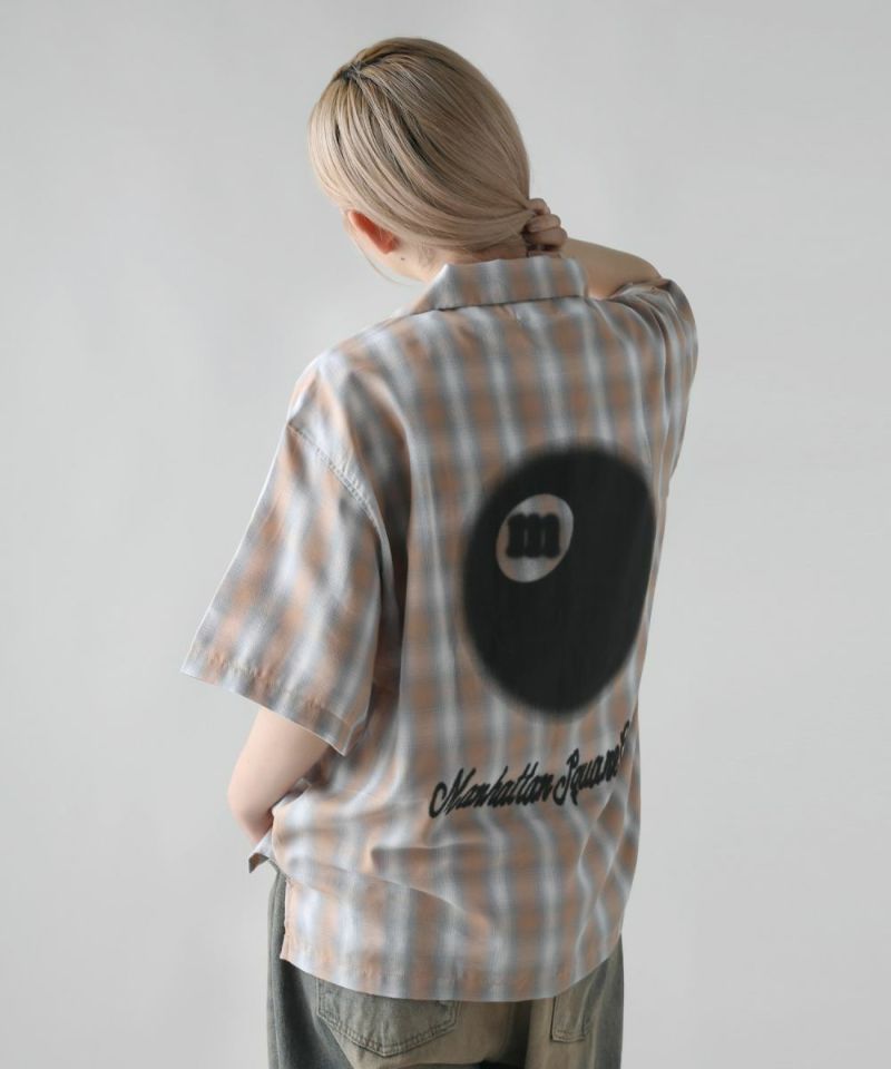 ビリヤードロゴオーバーサイズオンブレチェック半袖オープンカラーシャツ