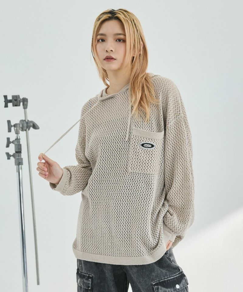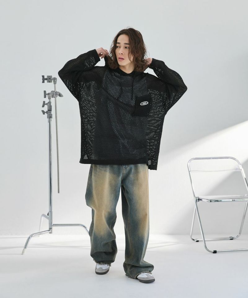 オーバーサイズワッペン刺繍メッシュニットプルパーカー