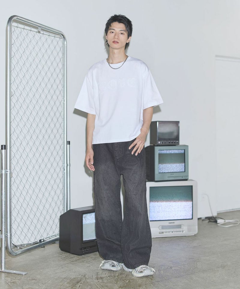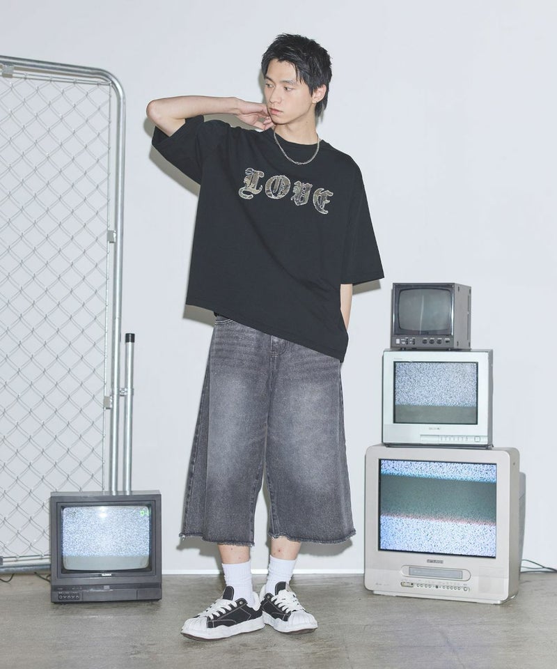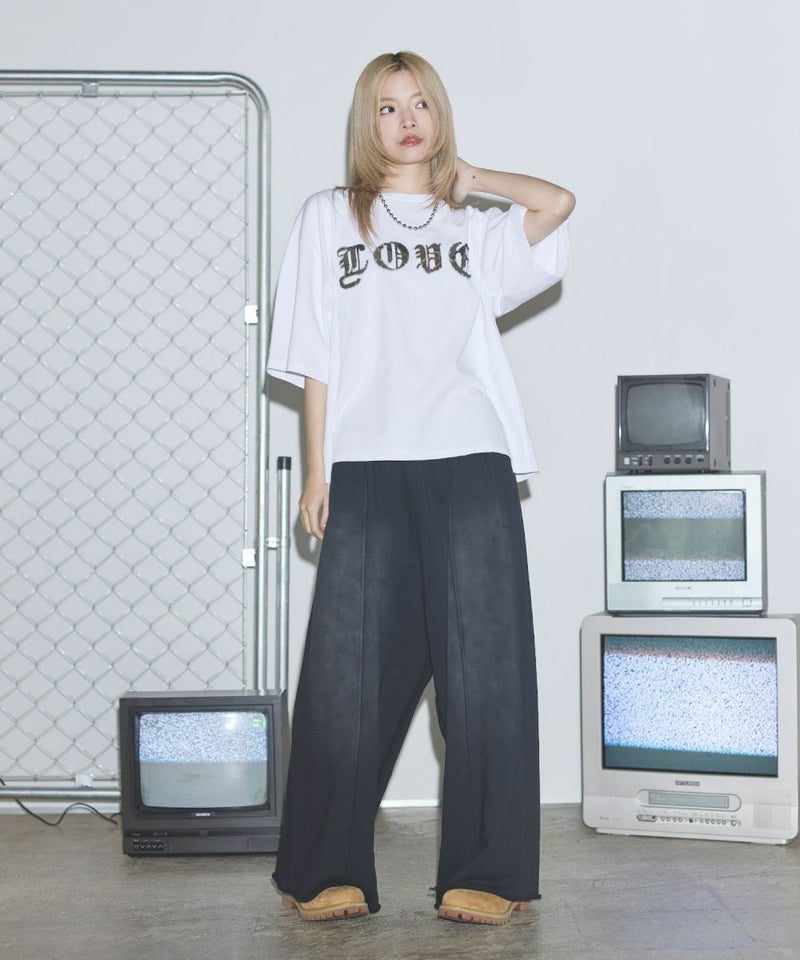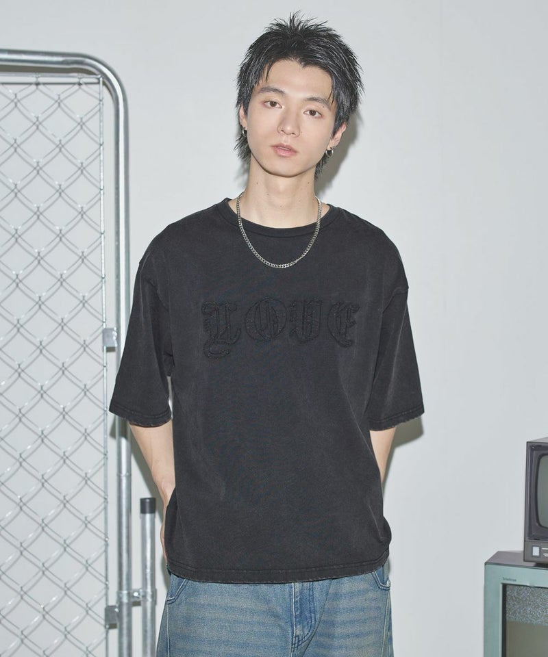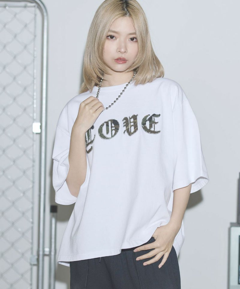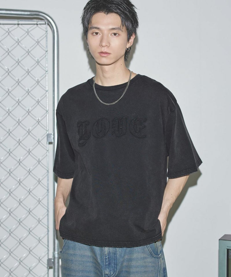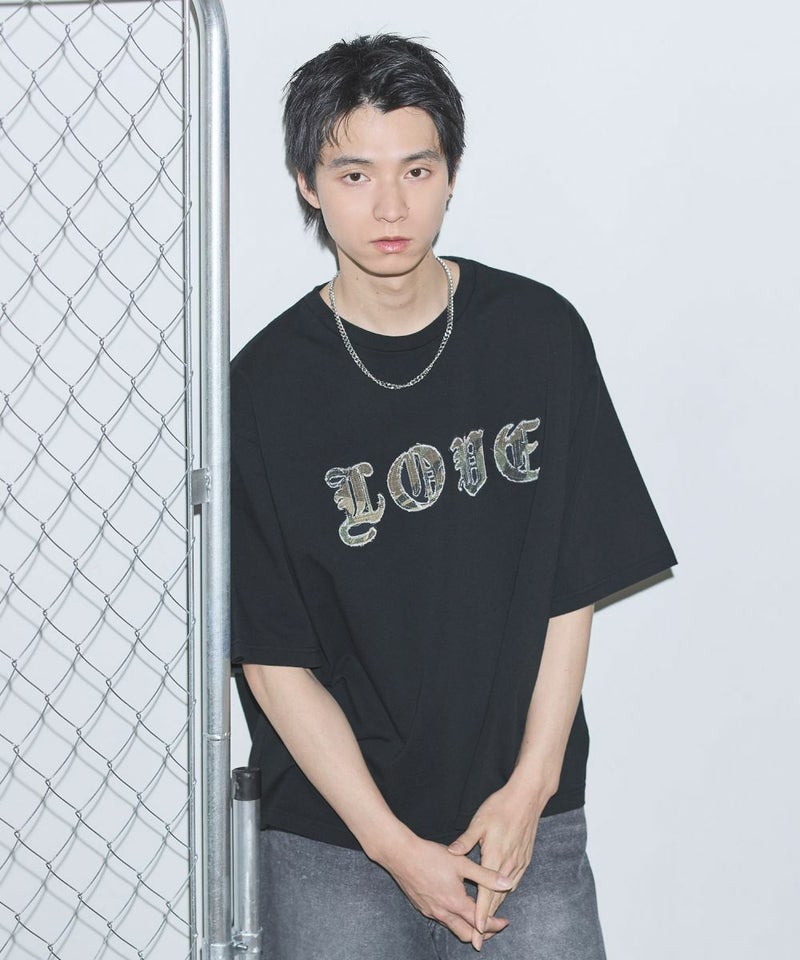 ・“LOVE”のロゴパッチが目を引くTシャツ。