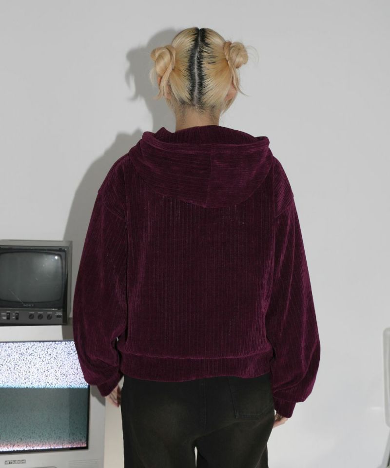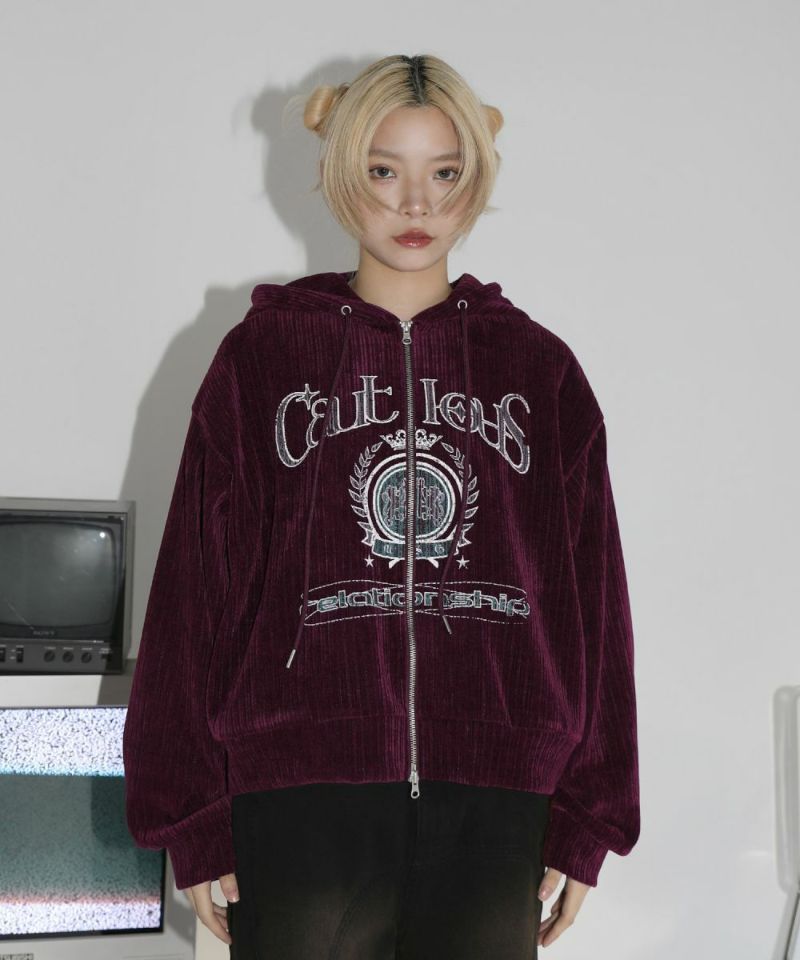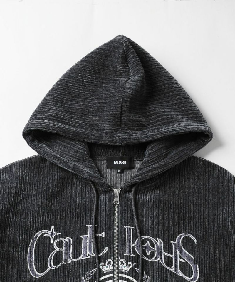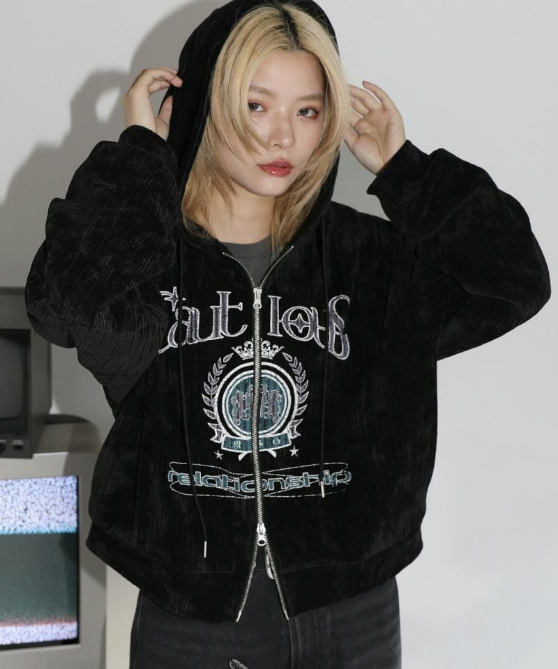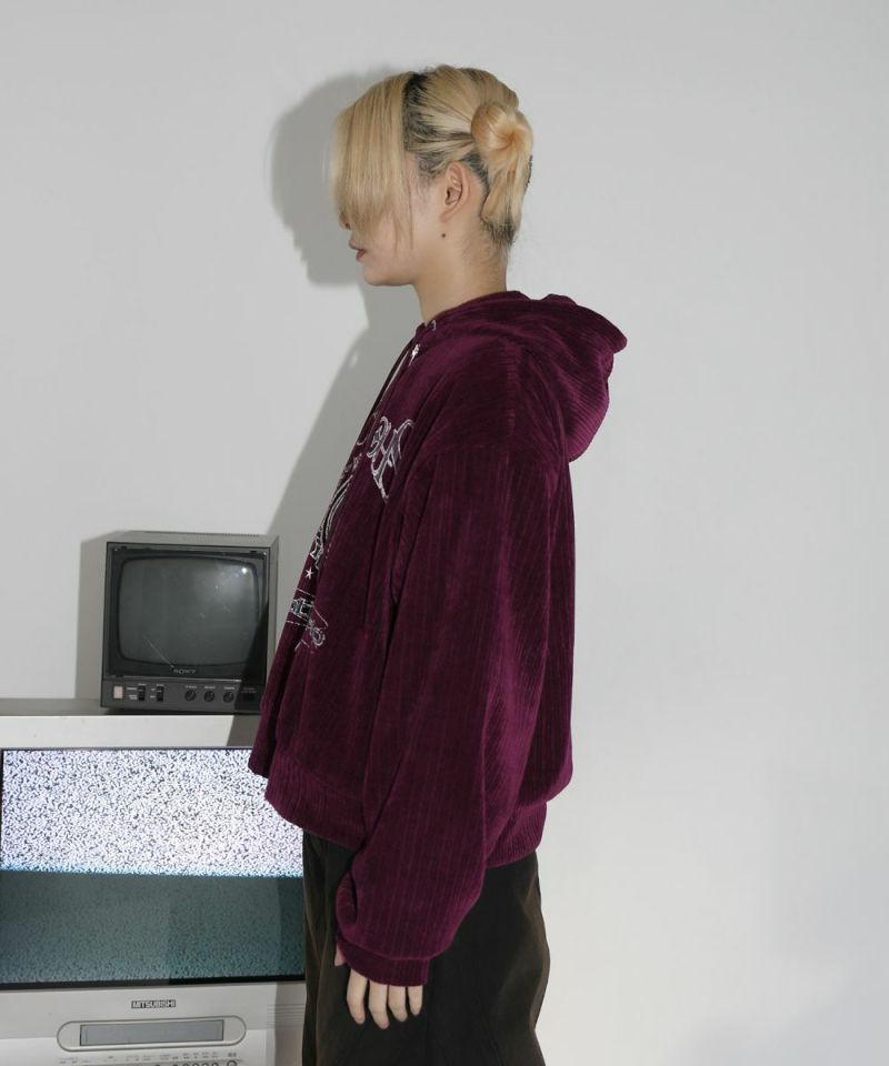 ヴィンテージライクなデザインにコーデュロイ素材を使用したジップパーカー。エンブレムのプリントが施されたフロント部分が、ヴィンテージ感を演出しつつ、洗練された雰囲気を醸し出しています。着丈を短めにしつつも、ゆったりとしたサイズ感で今っぽいシルエットが完成。上下どちらからも開けられるダブルジップ仕様になっており、裾側をオープンにしてインナーを見せるなど、開け方次第で幅広い着こなしを楽しめます。見えないポケットをさりげなく配置しており、デザイン性を保ちながらも実用的な収納スペースを備えています。さらに、フード部分には長めのドロスト紐をあしらい、アクセントとしても機能性としても優れた仕上がりに。男女問わず、ユニセックスで着用可能です。