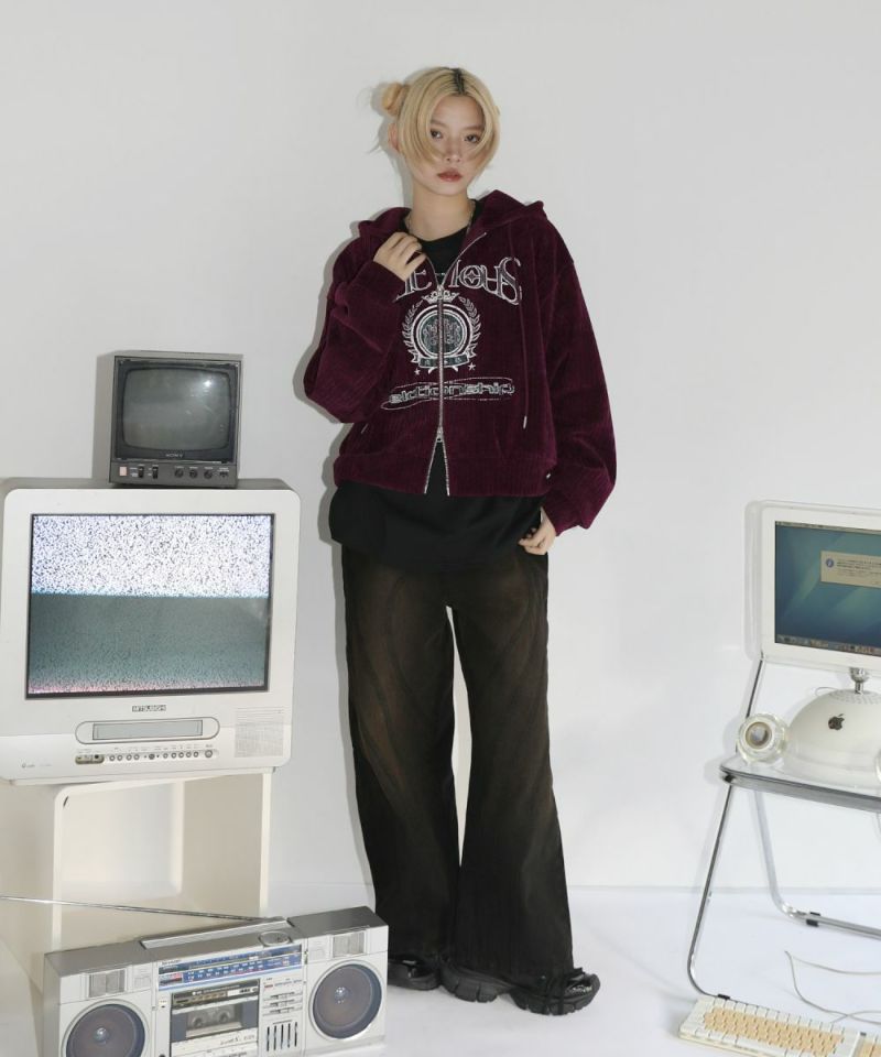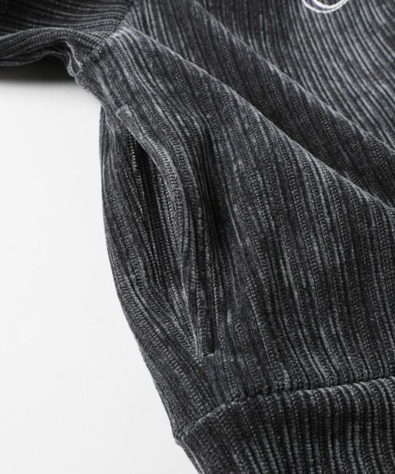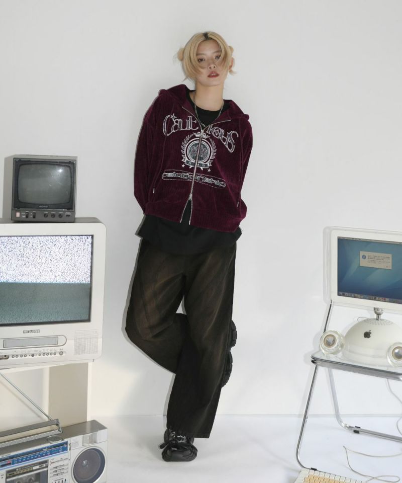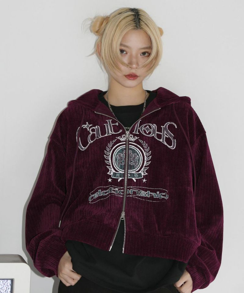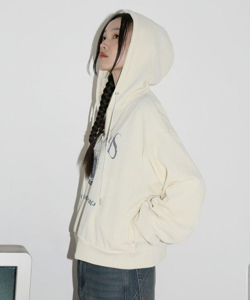 ヴィンテージライクなデザインにコーデュロイ素材を使用したジップパーカー。エンブレムのプリントが施されたフロント部分が、ヴィンテージ感を演出しつつ、洗練された雰囲気を醸し出しています。着丈を短めにしつつも、ゆったりとしたサイズ感で今っぽいシルエットが完成。上下どちらからも開けられるダブルジップ仕様になっており、裾側をオープンにしてインナーを見せるなど、開け方次第で幅広い着こなしを楽しめます。見えないポケットをさりげなく配置しており、デザイン性を保ちながらも実用的な収納スペースを備えています。さらに、フード部分には長めのドロスト紐をあしらい、アクセントとしても機能性としても優れた仕上がりに。男女問わず、ユニセックスで着用可能です。