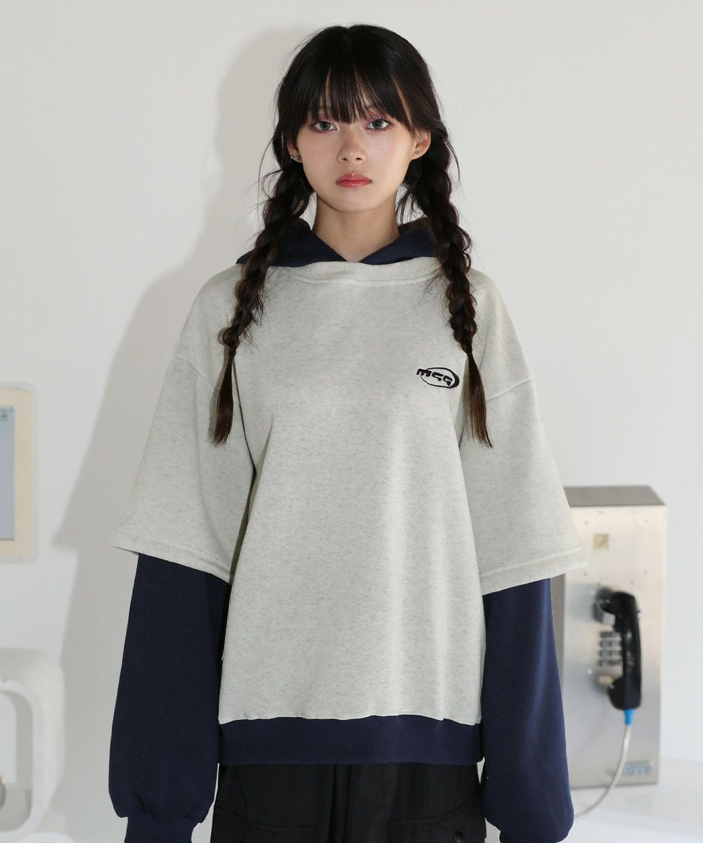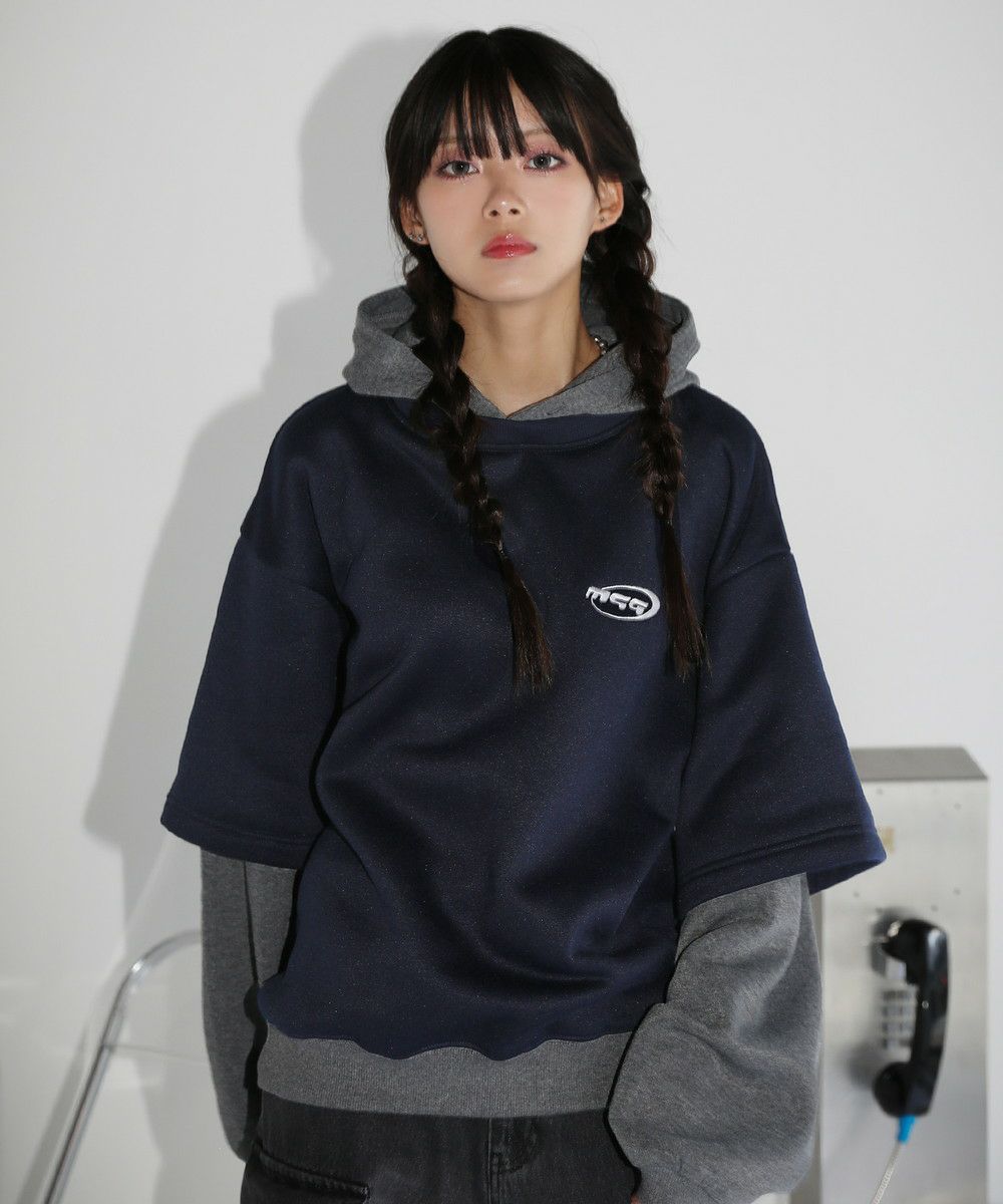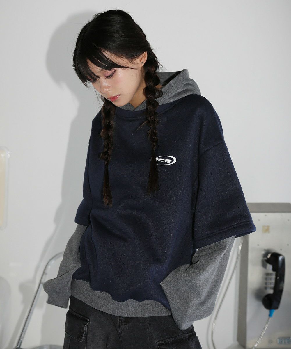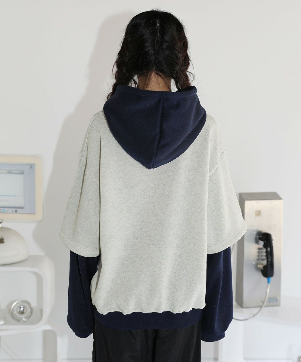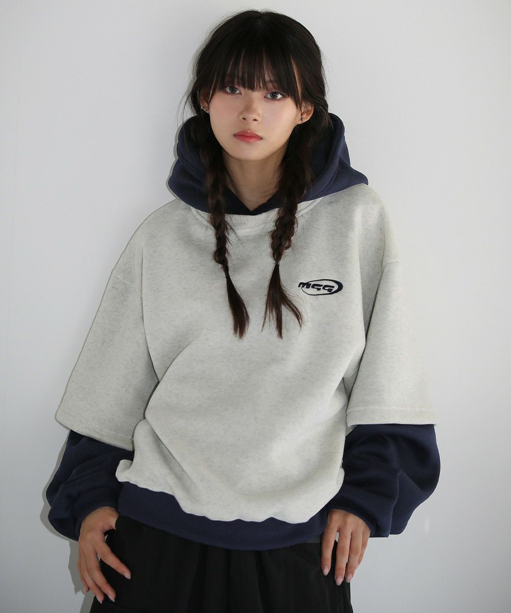 オーバーサイズワンポイント刺繍フェイクレイヤードバルーンスリーブプルパーカー