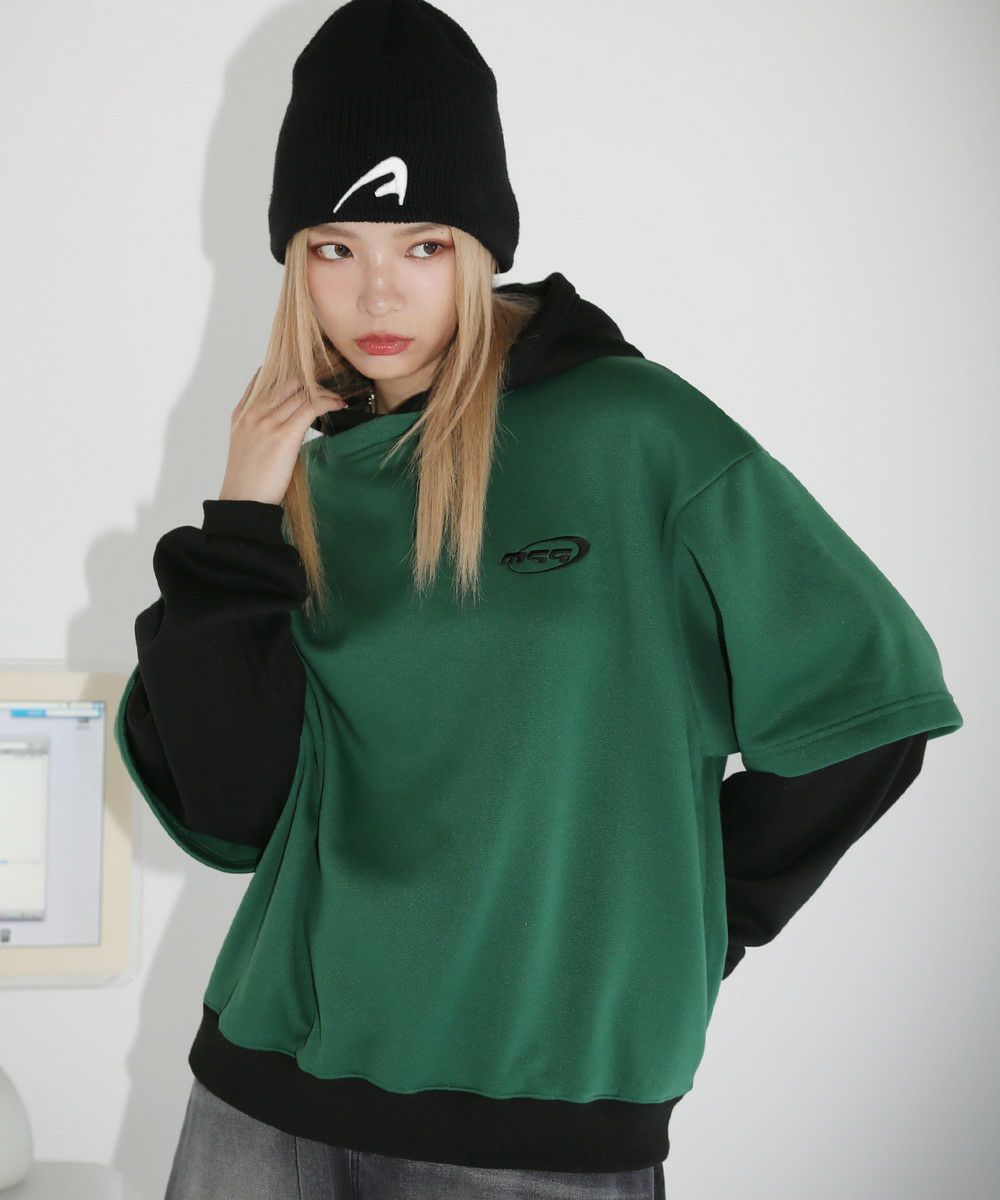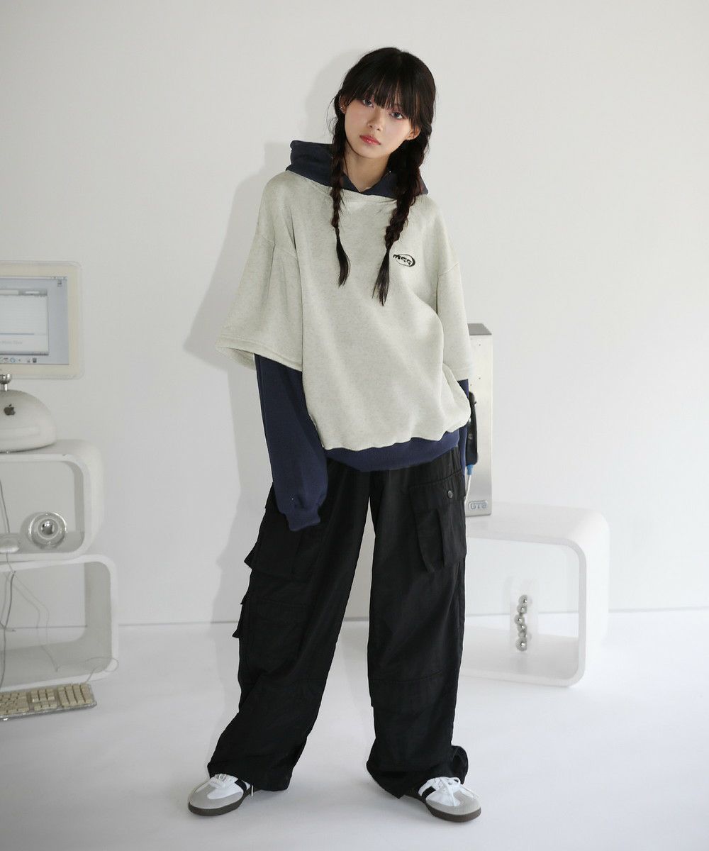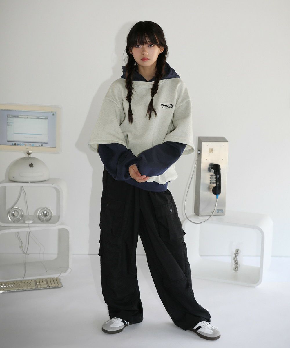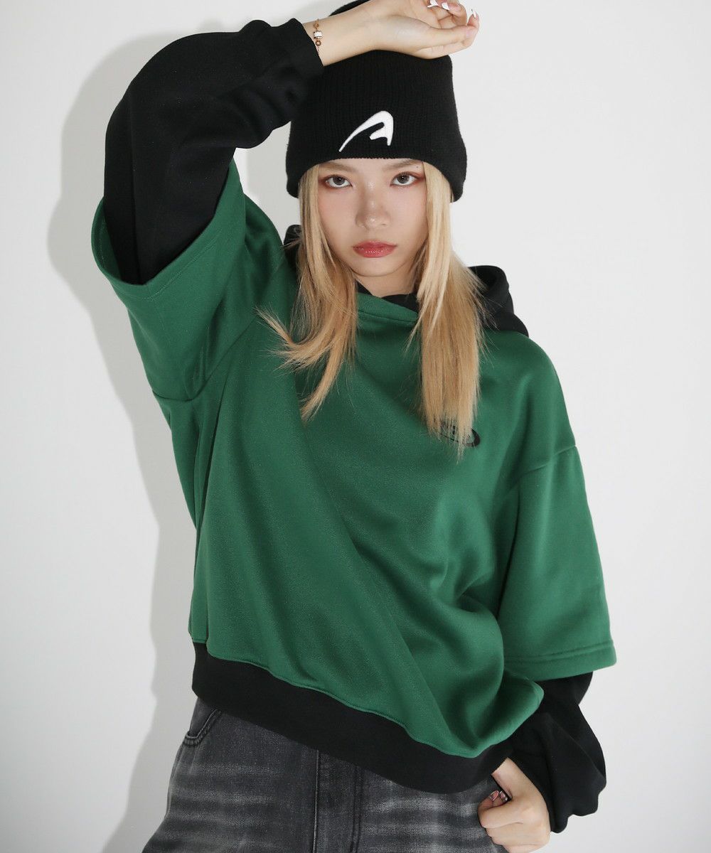 オーバーサイズワンポイント刺繍フェイクレイヤードバルーンスリーブプルパーカー