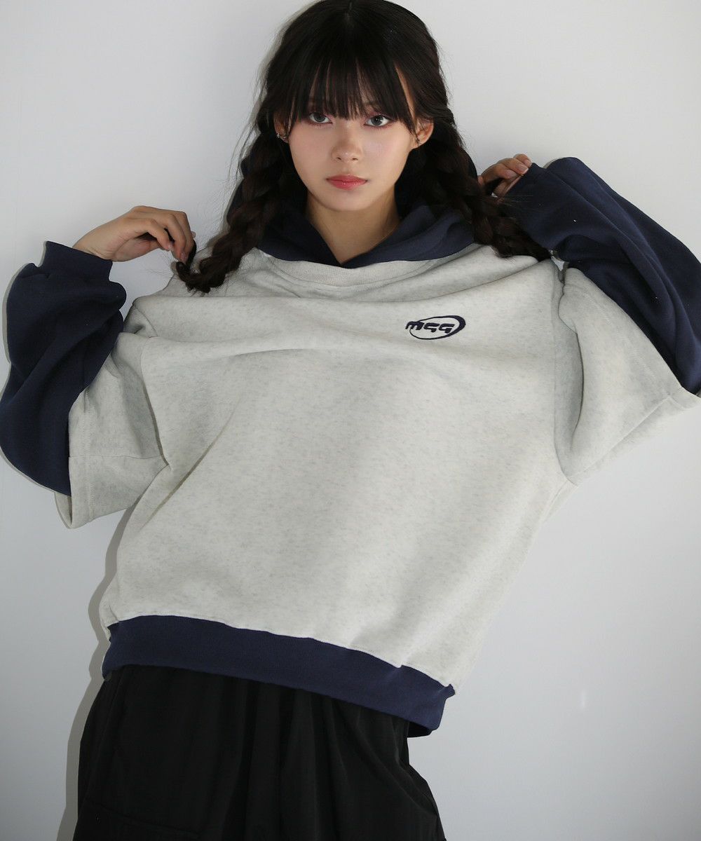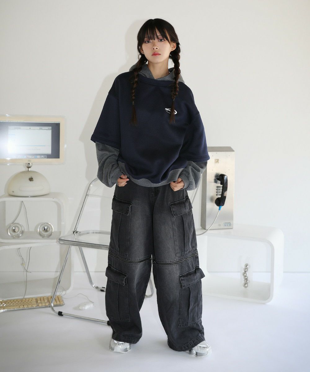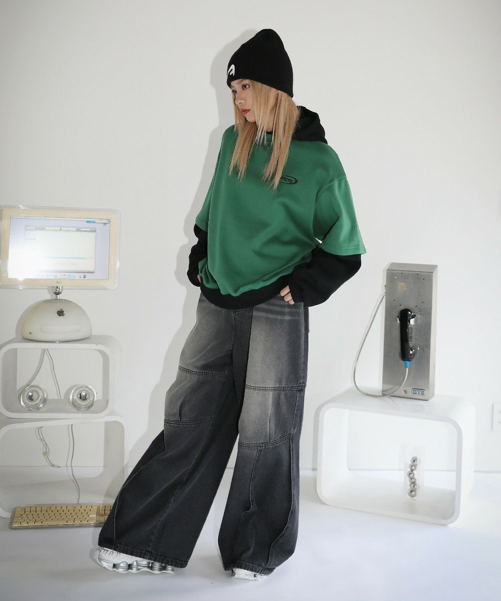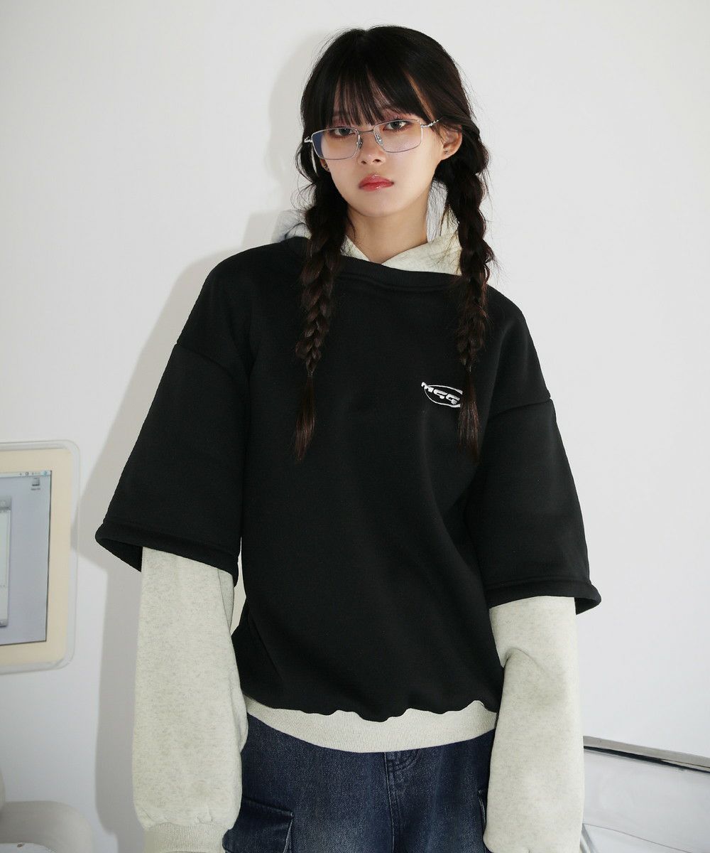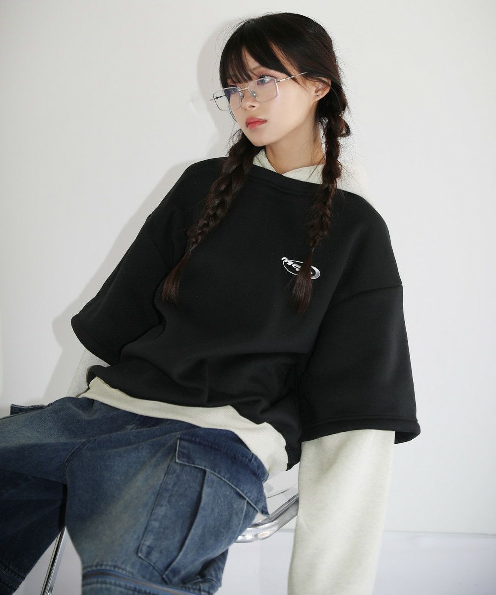 オーバーサイズワンポイント刺繍フェイクレイヤードバルーンスリーブプルパーカー