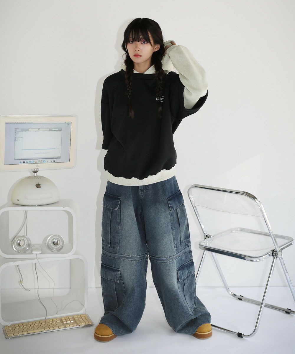 オーバーサイズパネル切替クルーネックプルオーバースウェット