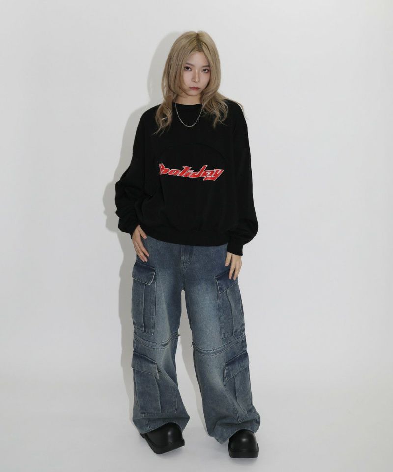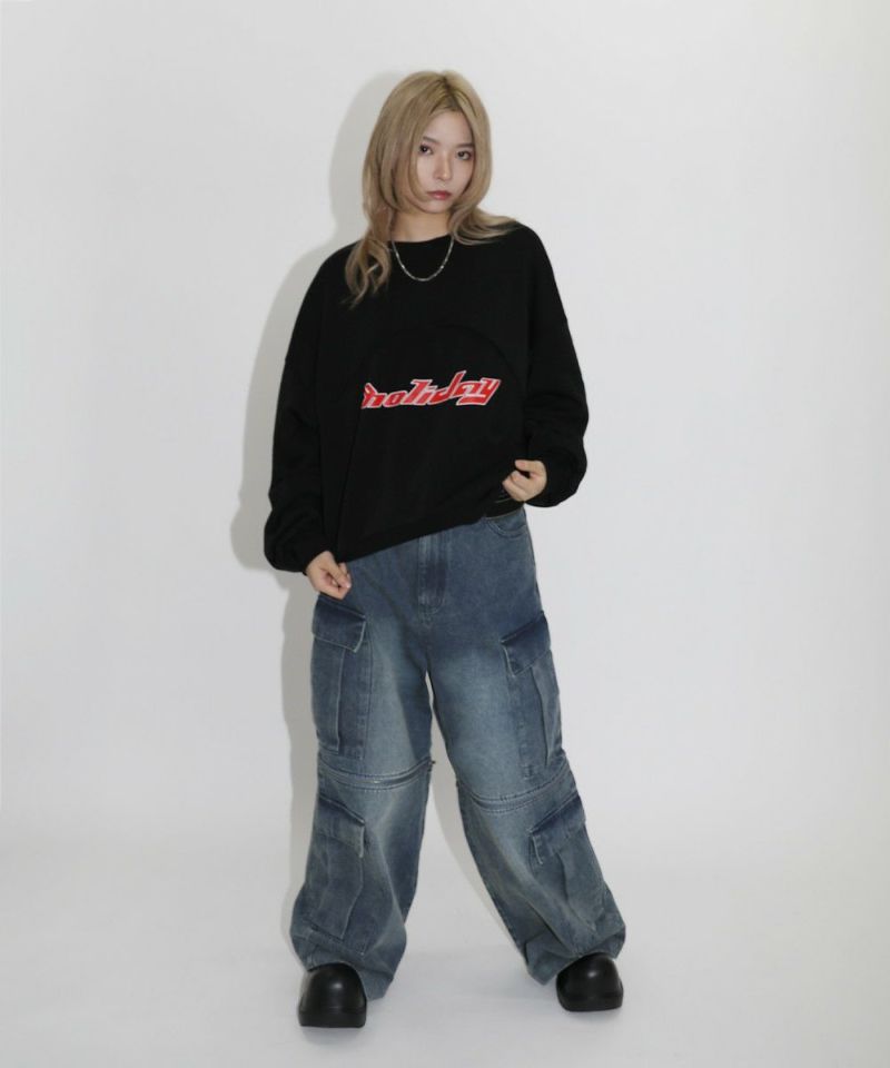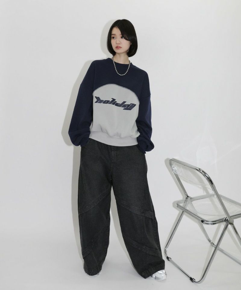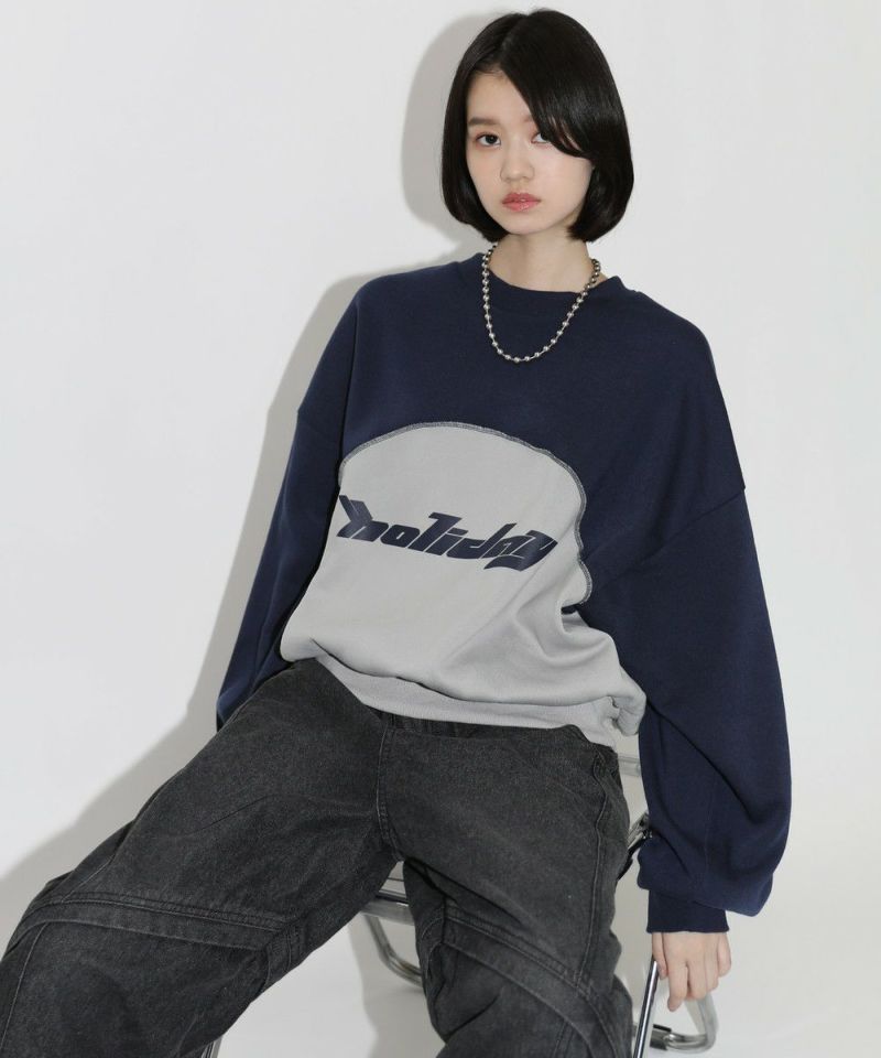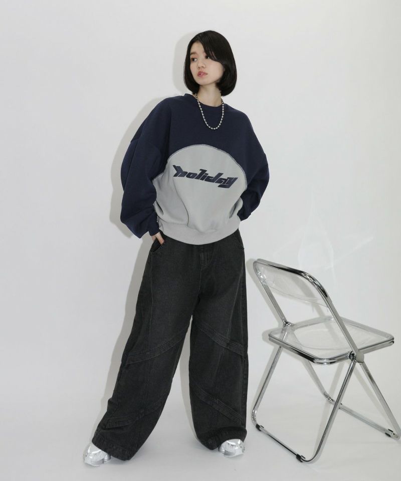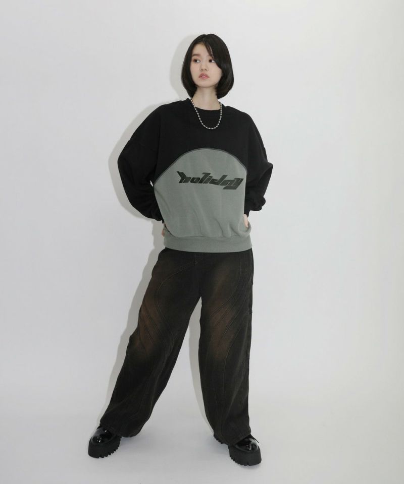 パネルの切替デザインが特徴のクルーネックスウェット。フロントのロゴプリントと切り替えデザインがアクセントに。ややワイドな身幅&ドロップショルダーでリラックス感溢れるビッグシルエットで仕上げました。袖は大きくゆとりを持たせ、裾は程良くたまりができるバルーンスリーブデザイン。
