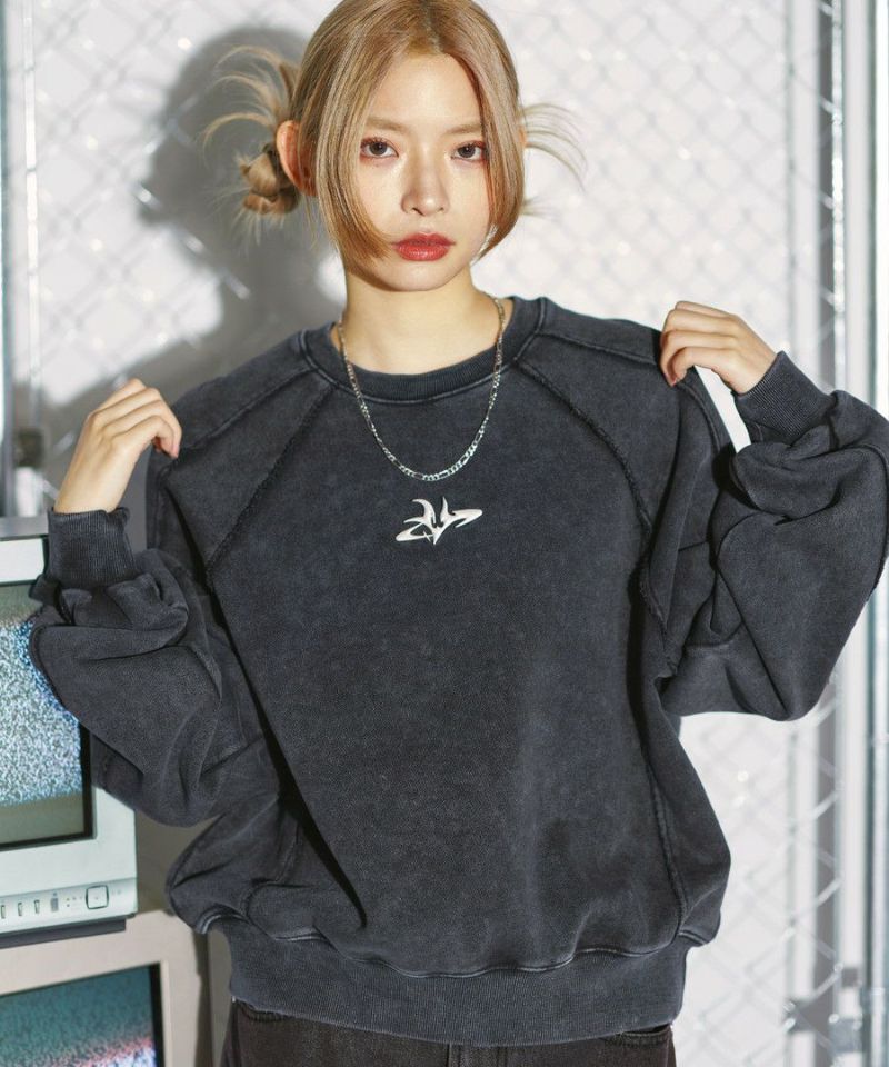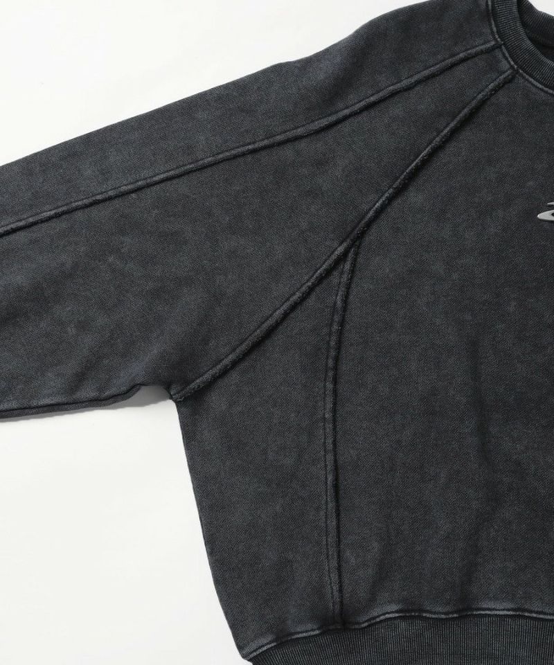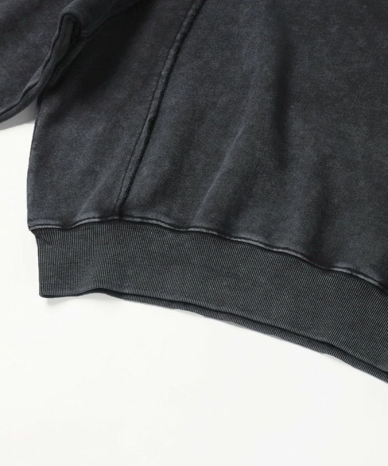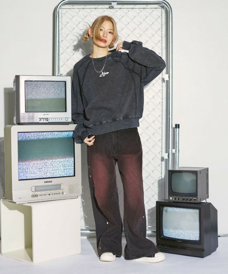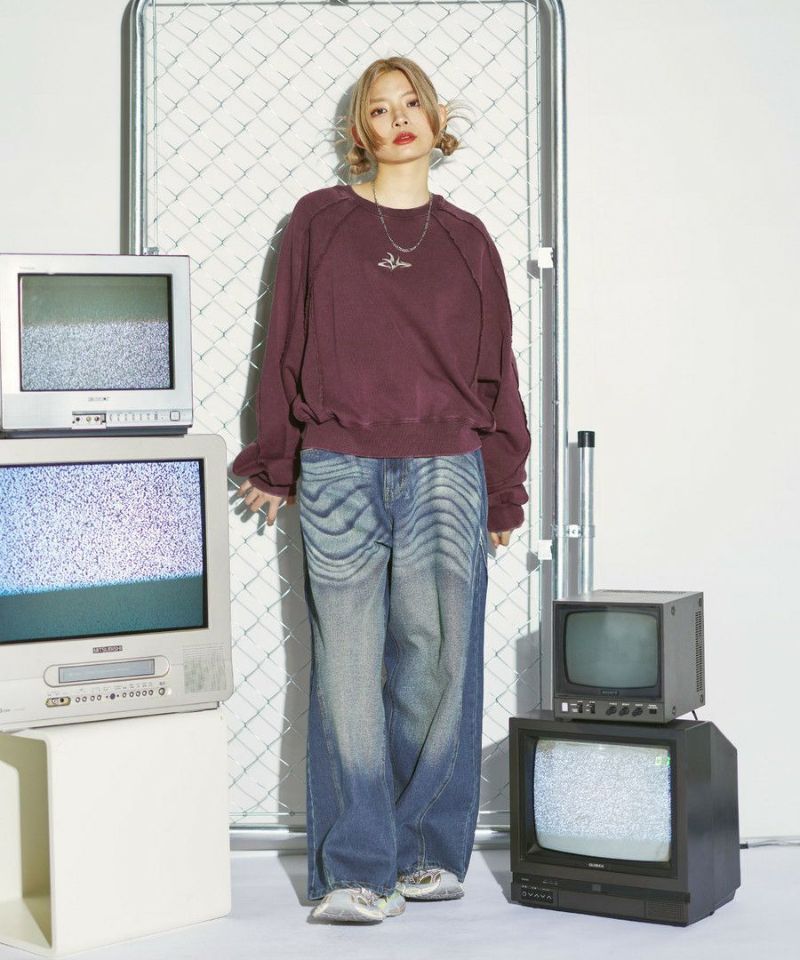 オーバーダイ/ウォッシュ加工オーバーサイズウェーブ切替ワイドストレートバギーデニムパンツ 11.5oz