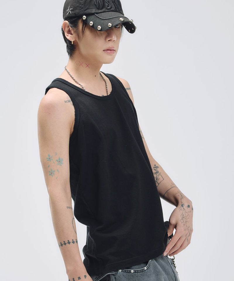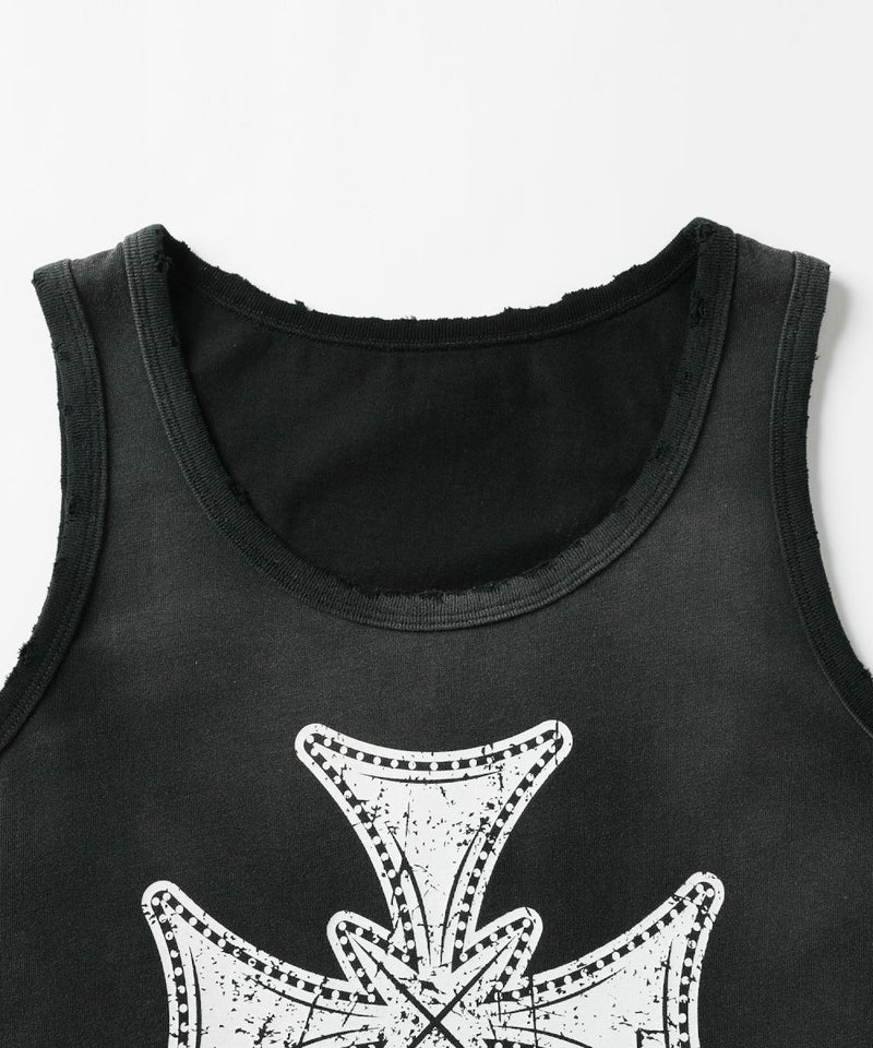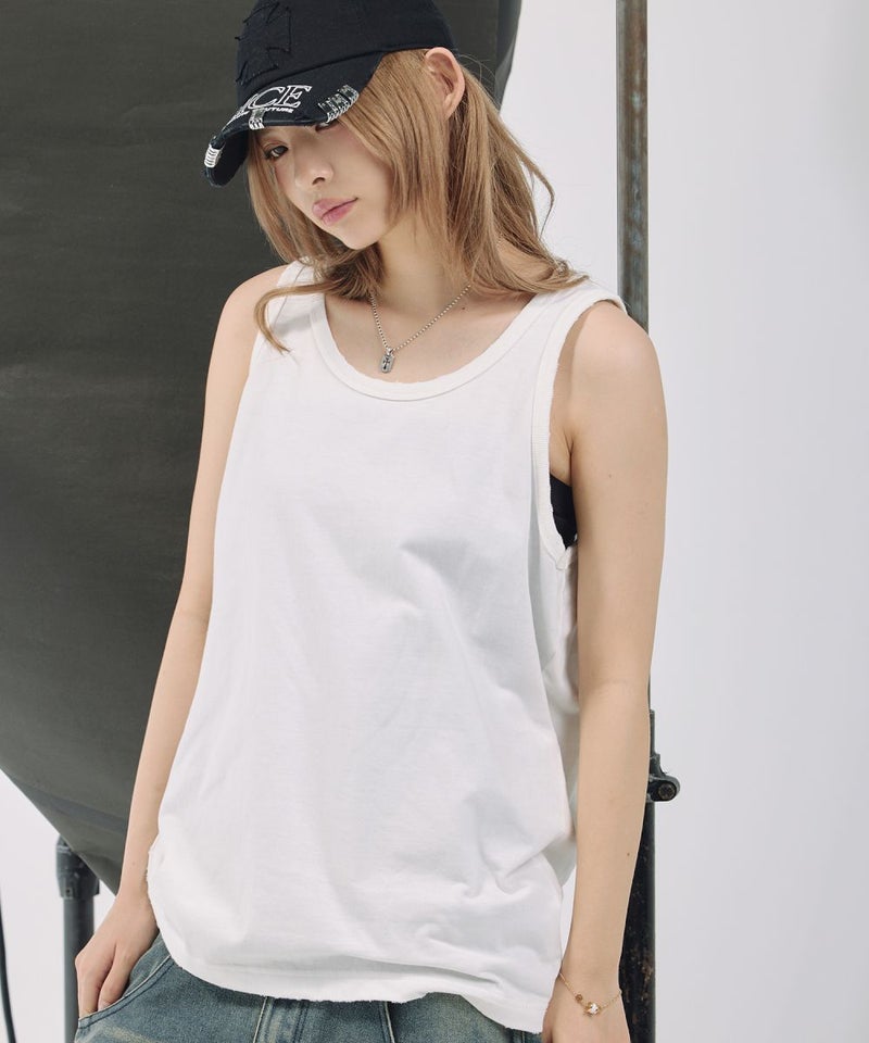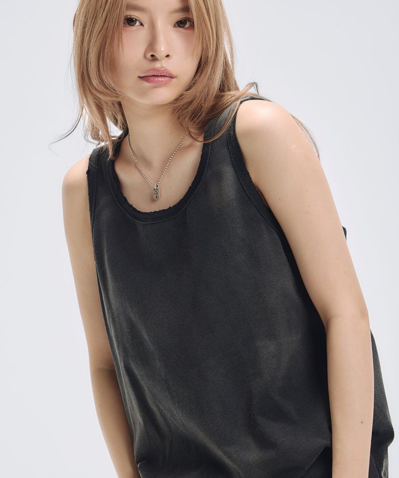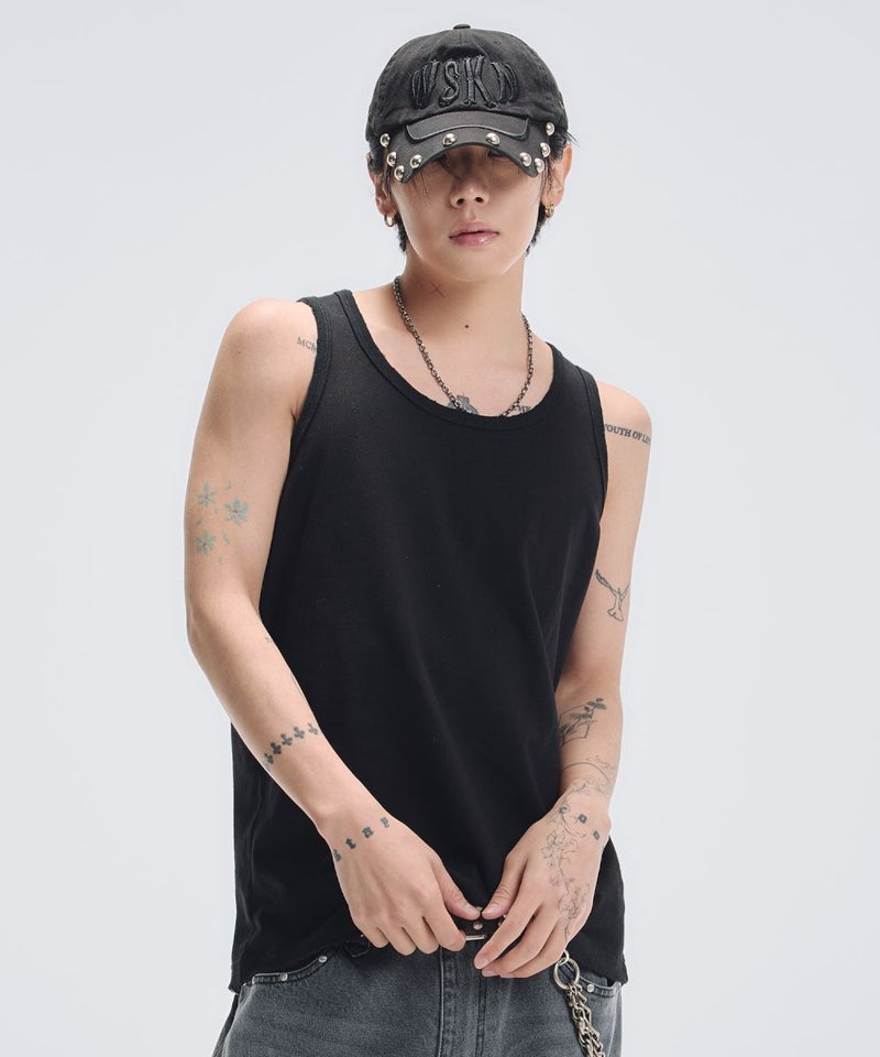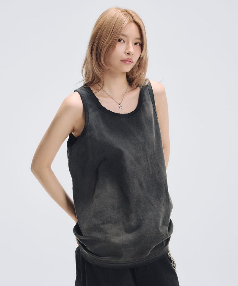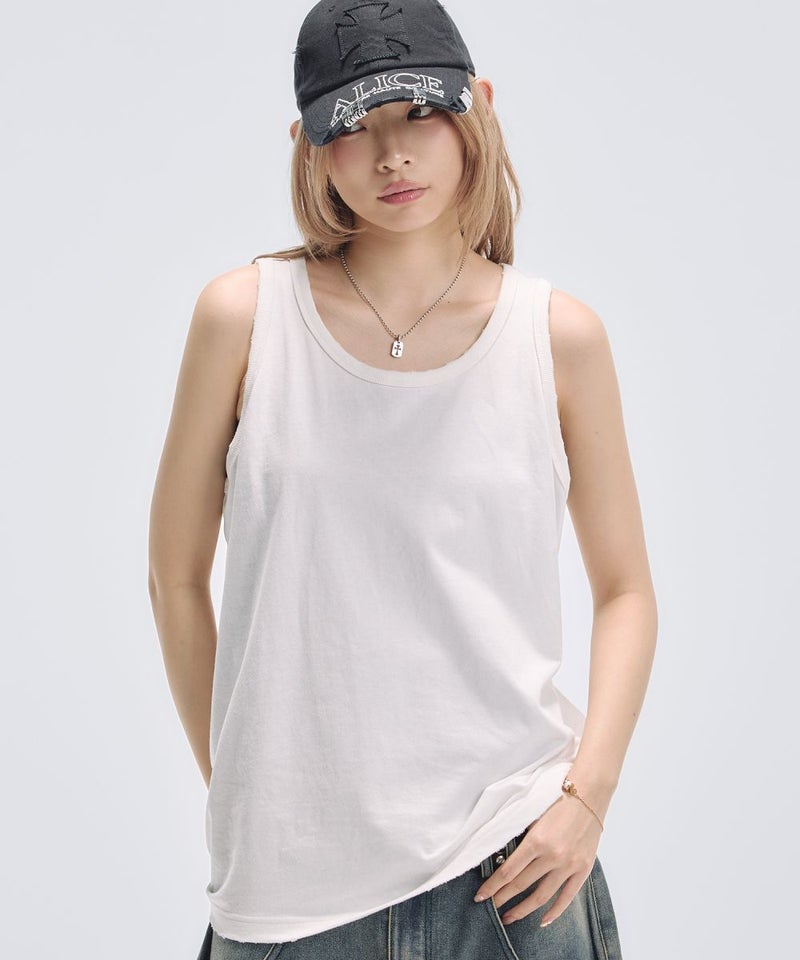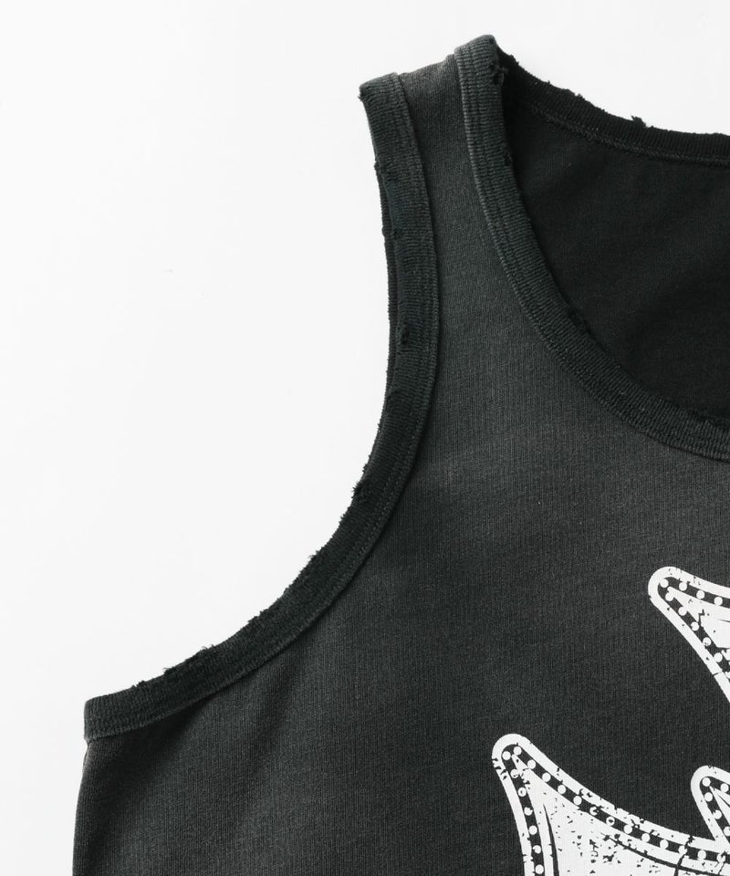 袖口と裾にダメージ加工を施した、こなれ感のあるタンクトップ。さりげないクラッシュディテールが、シンプルながらもスタイリングに抜け感をプラスしてくれる一枚です。