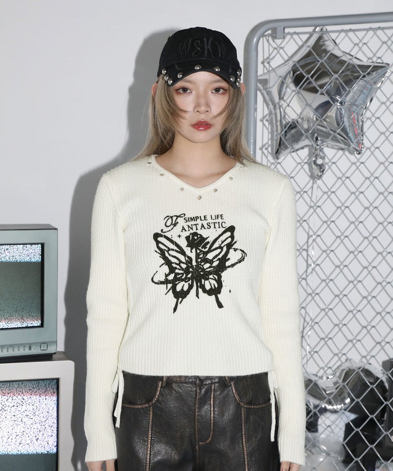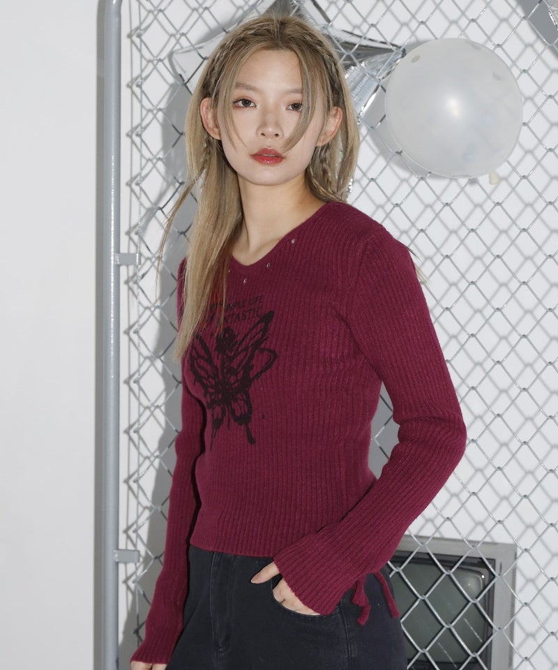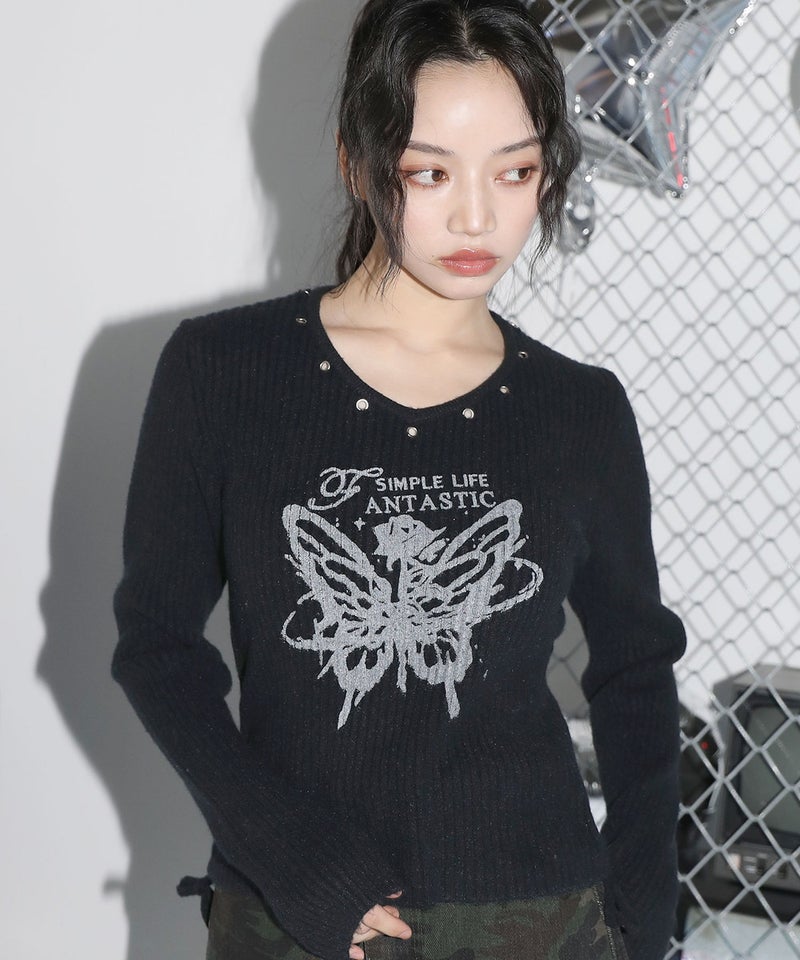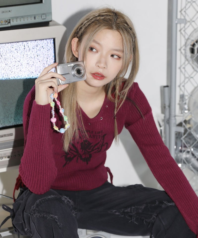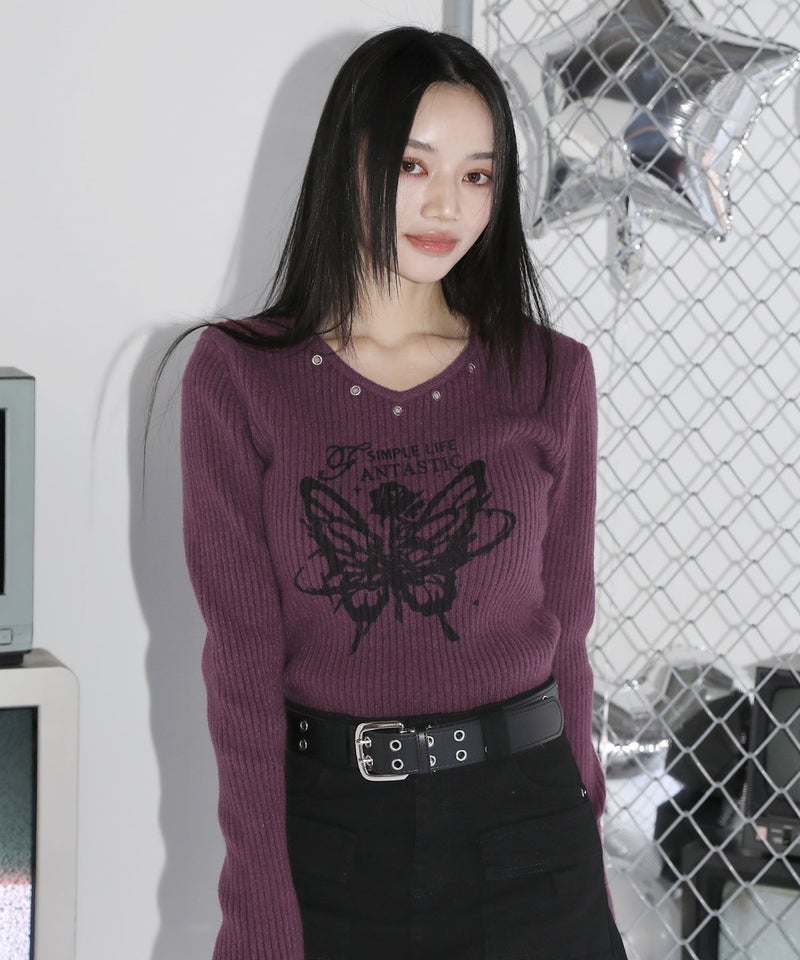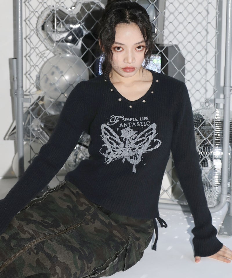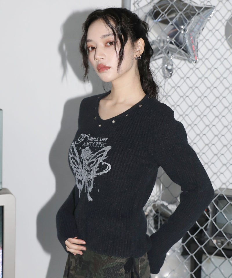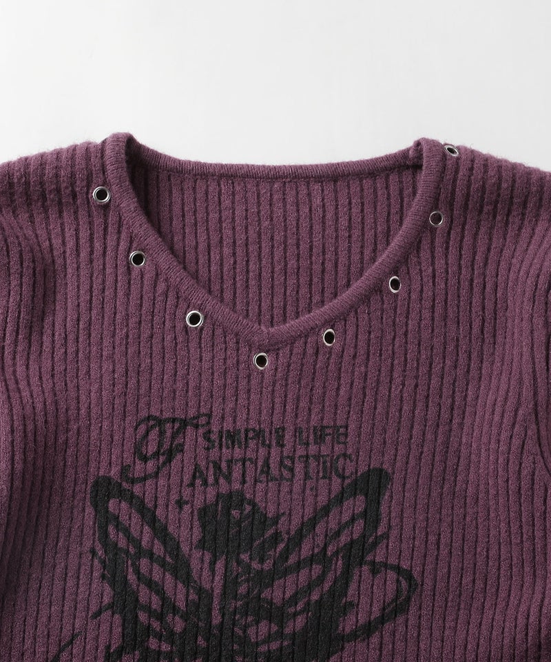 ・金具で縁取りされた首まわりのアイレットが、ファッション性を高めています。