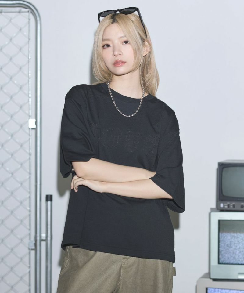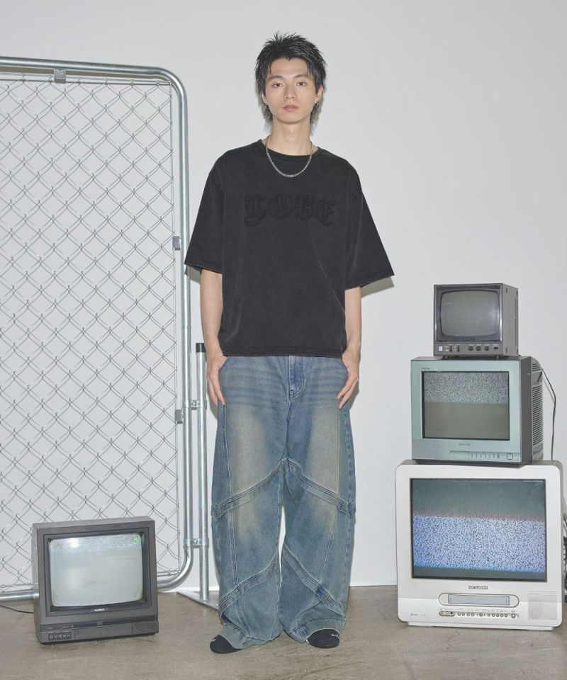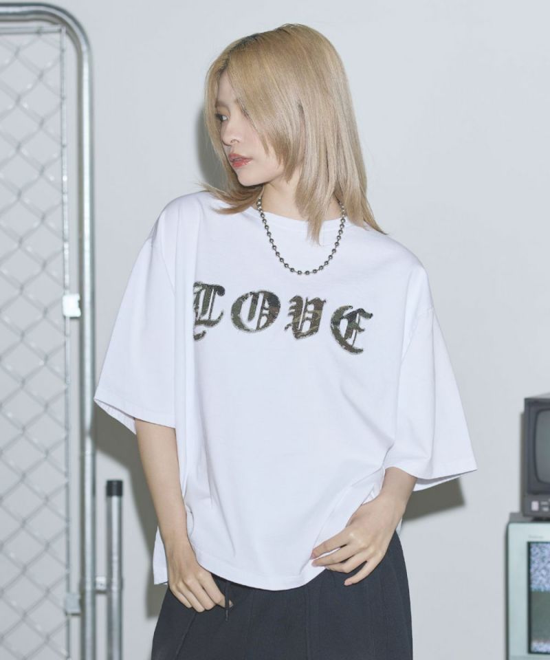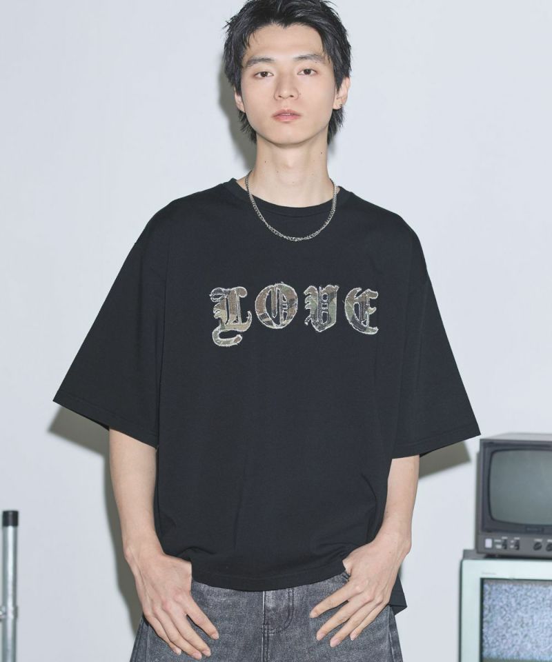・“LOVE”のロゴパッチが目を引くTシャツ。
