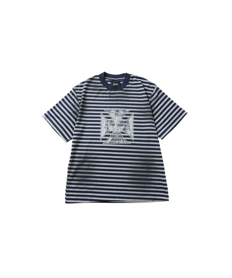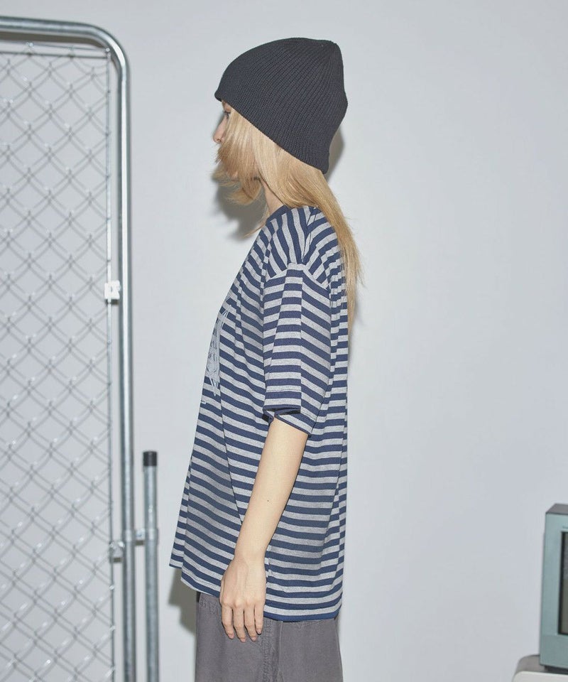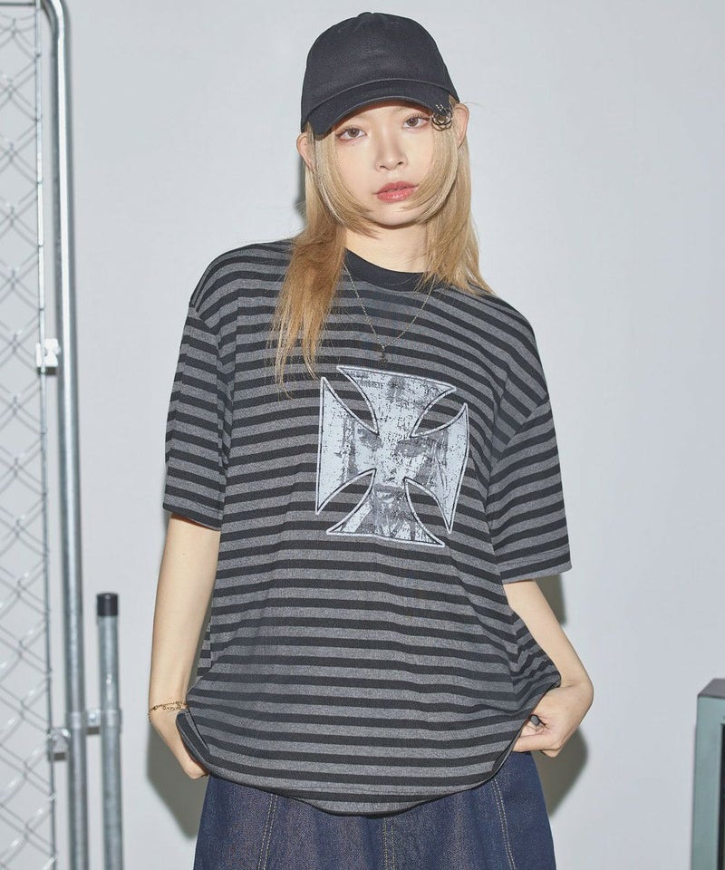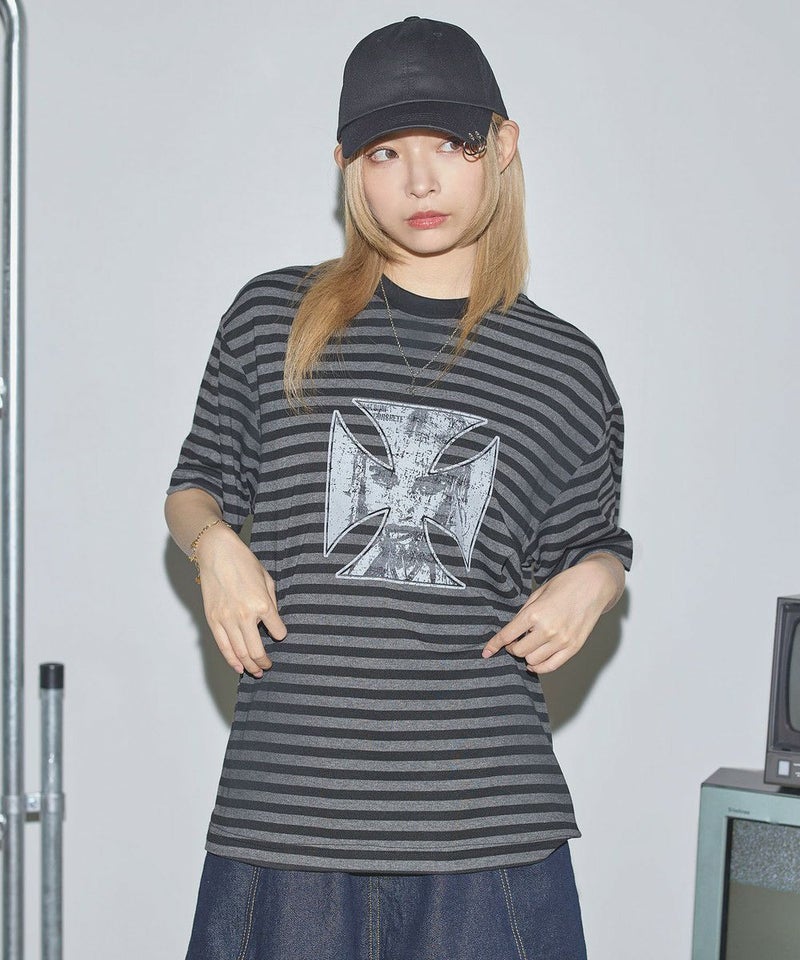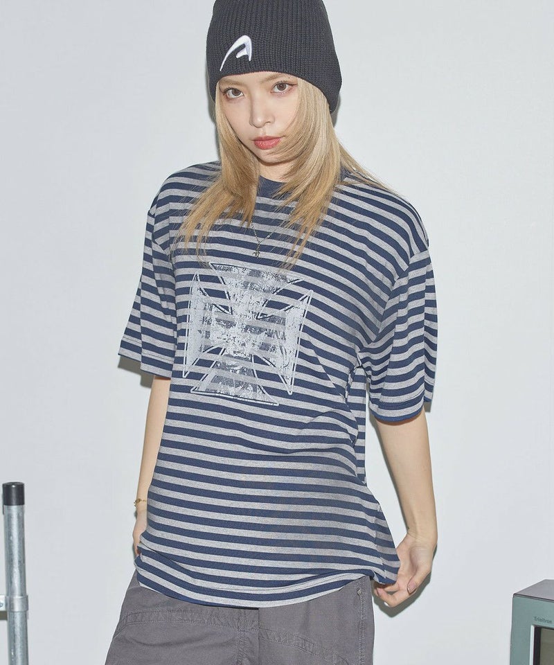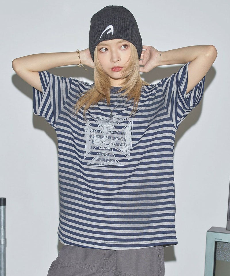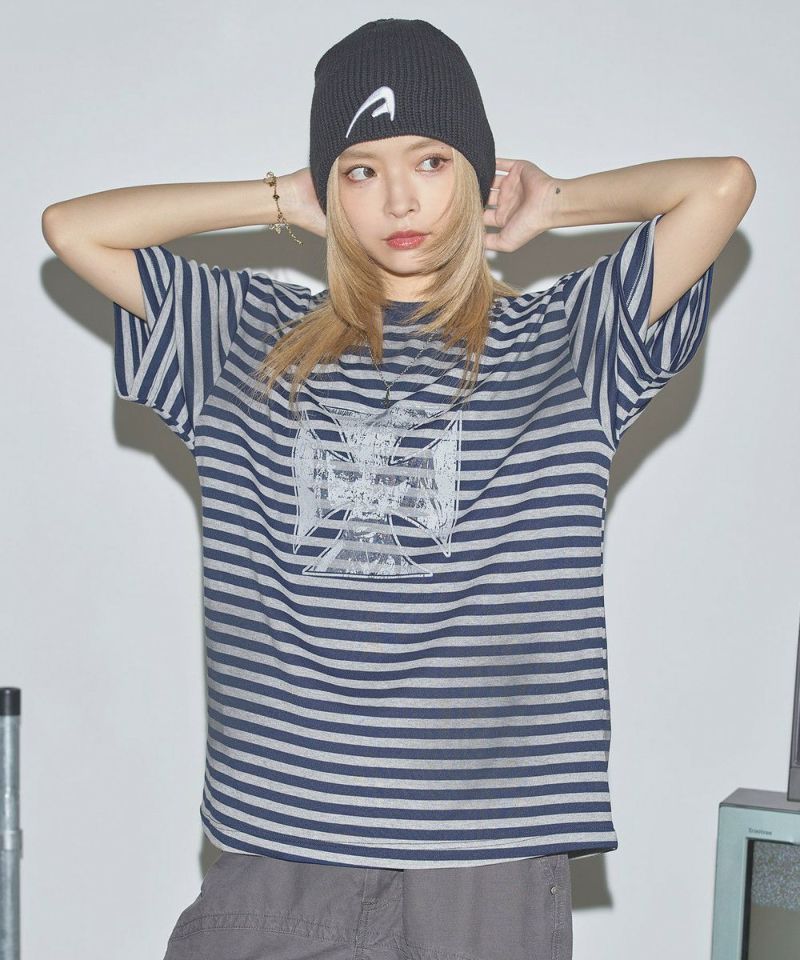・ヴィンテージ感のあるグラフィックプリントが印象的な、ボーダー柄のオーバーサイズTシャツ。